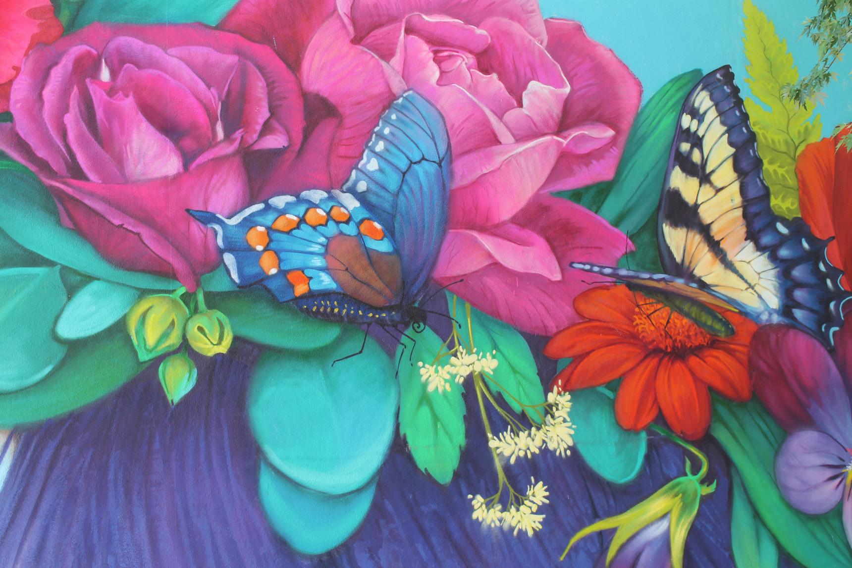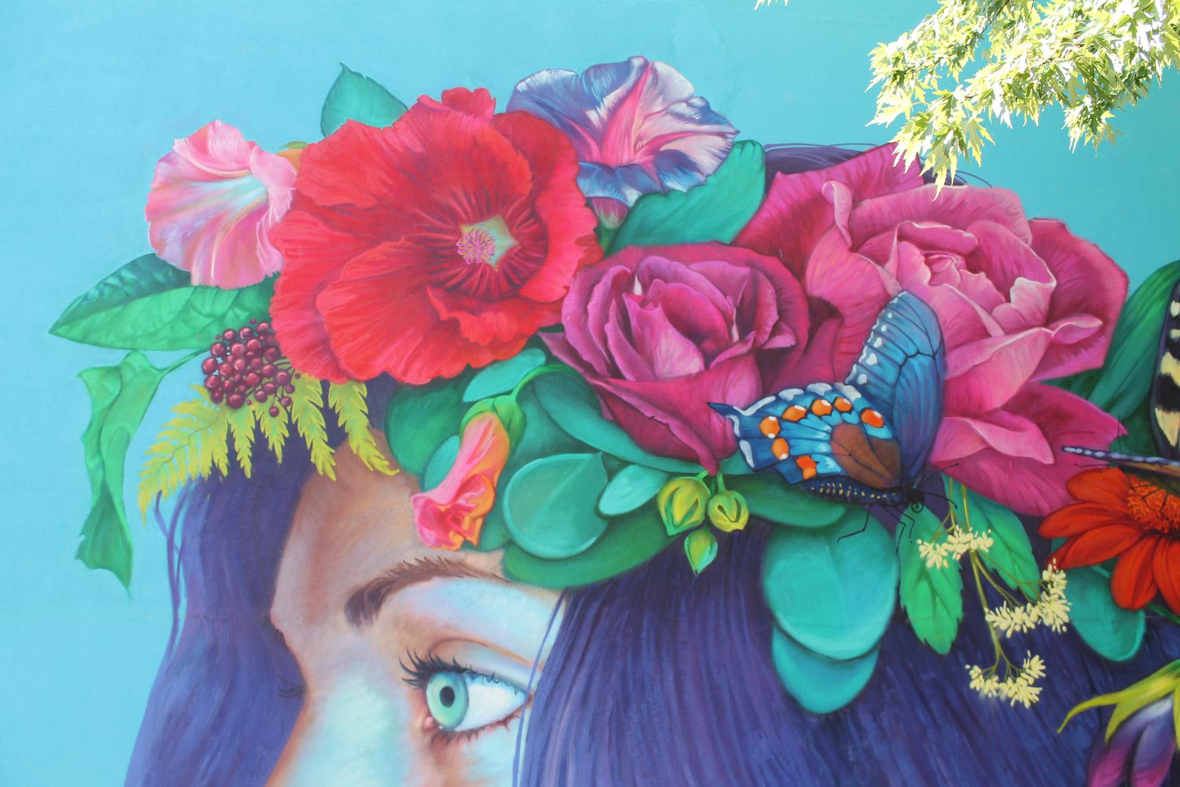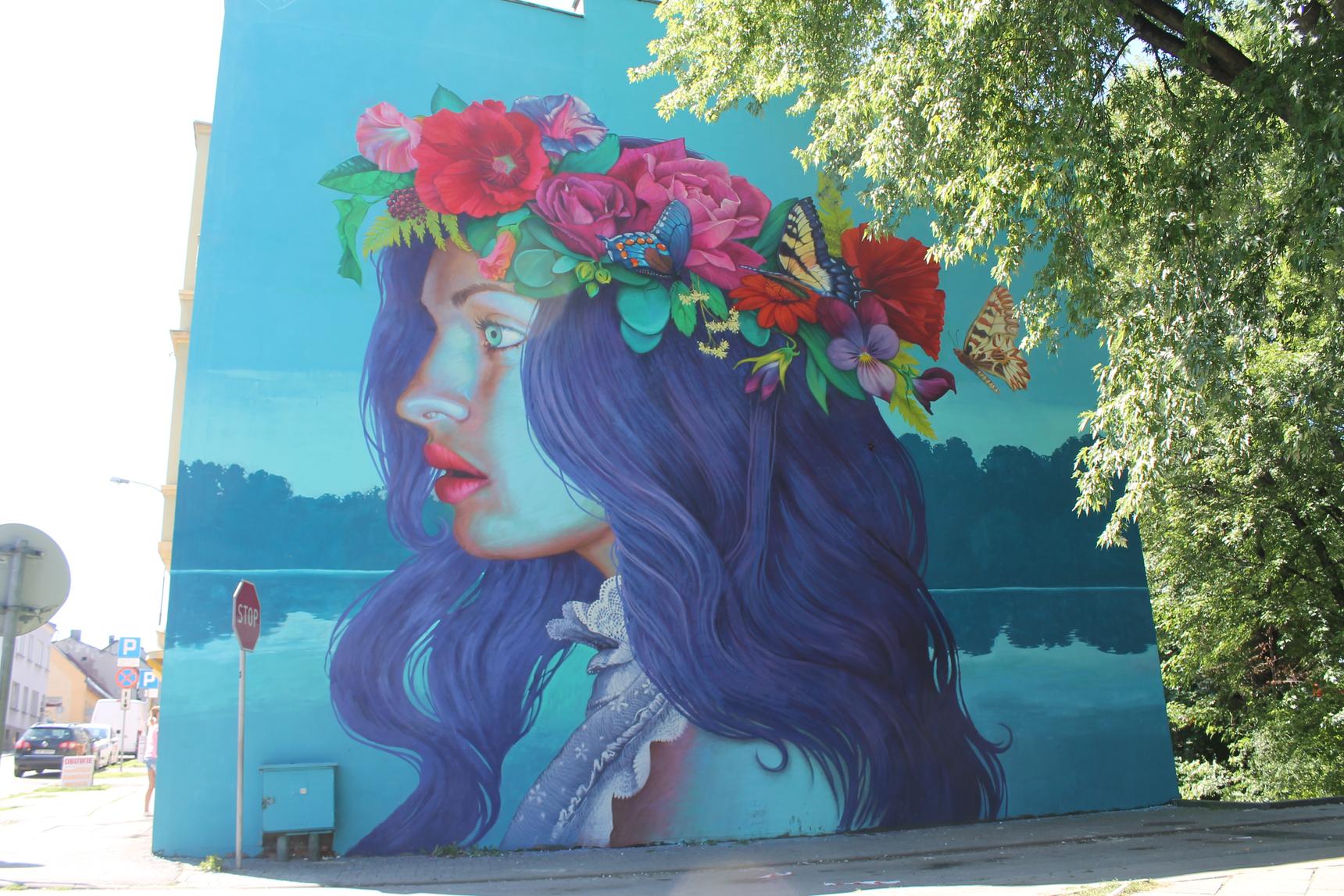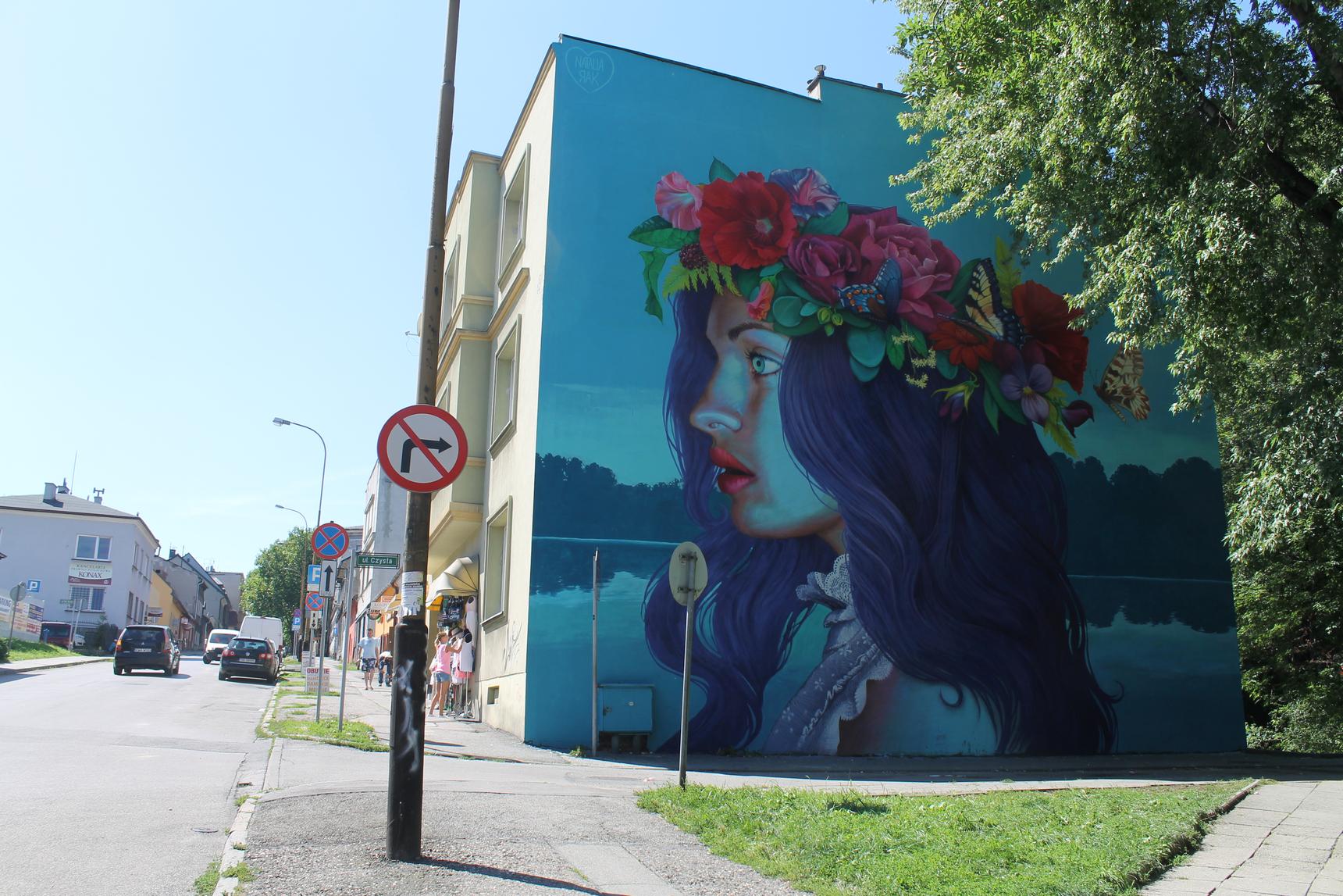 The project by this artist alludes to Midsummer’s Eve, or the Night of St John—an ancient Slavic celebration connected with the summer solstice and, in particular, with the custom of young girls plaiting hair garlands. The mural depicts the profile of a woman against the background of a lake and wearing a garland of Polish flowers. Also included in the mural is a local species of butterfly (the southern festoon). Between 2012 and 2017, attempts were made to reintroduce this extinct species to the Wapienica Valley in Bielsko-Biała. The mural was painted in 2016 under the “oBBraz miasta #3” project organised by the Fundacja Galerii Bielskiej and Galeria Bielska BWA and co-financed from the Bielsko-Biała municipal budget. Project sponsor – Leroy-Merlin Polska Sp. z o.o.