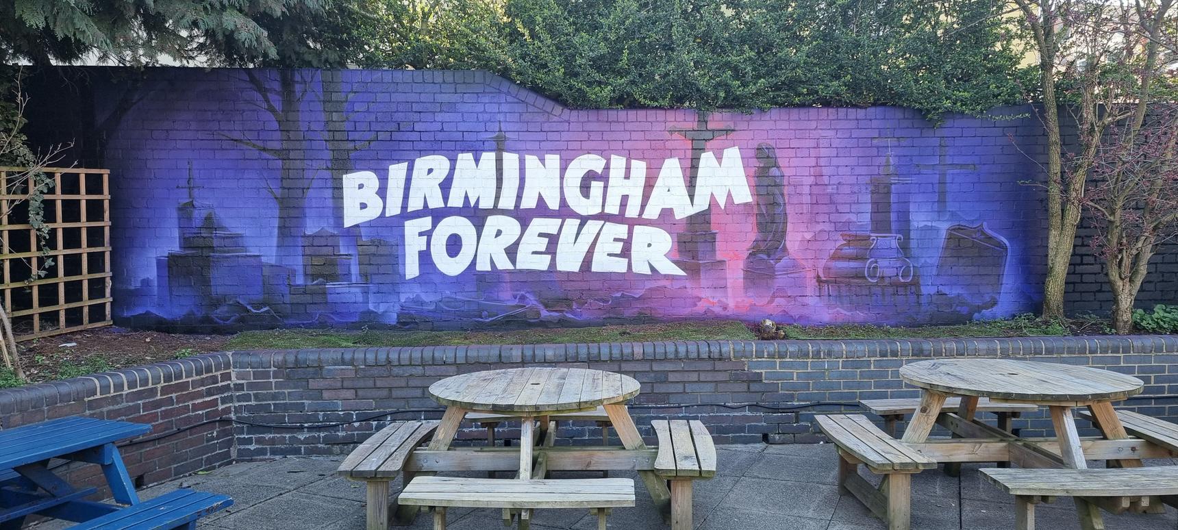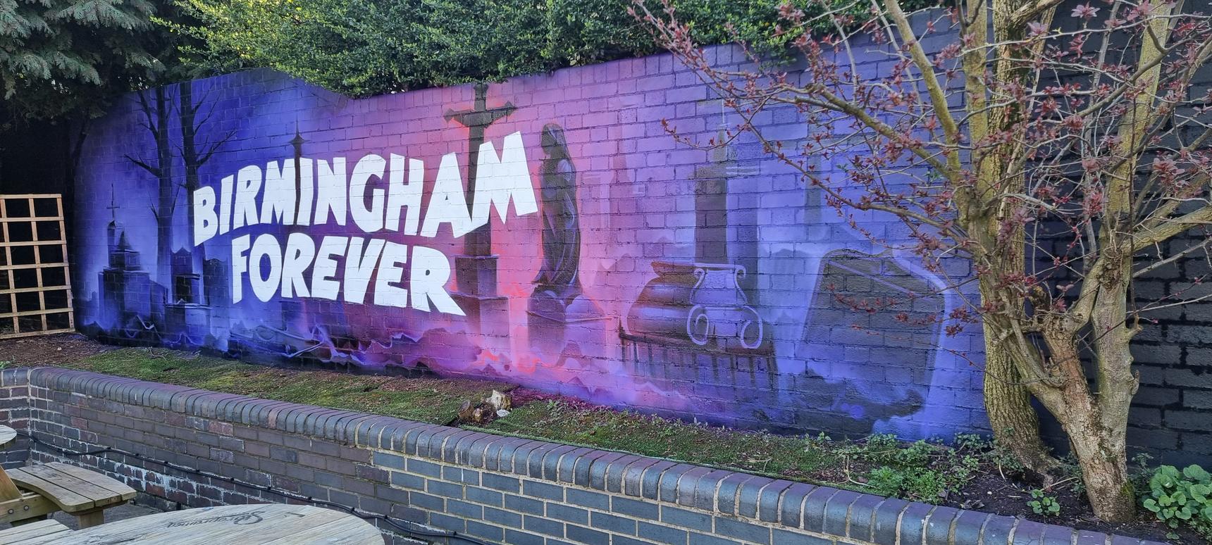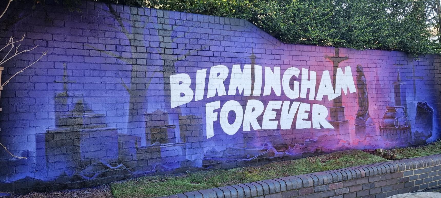Designed and painted by the Brink team, the artwork depicts a misty, purple and pink sky looming over a graveyard, with the words BIRMINGHAM FOREVER emblazoned in white across the centre.