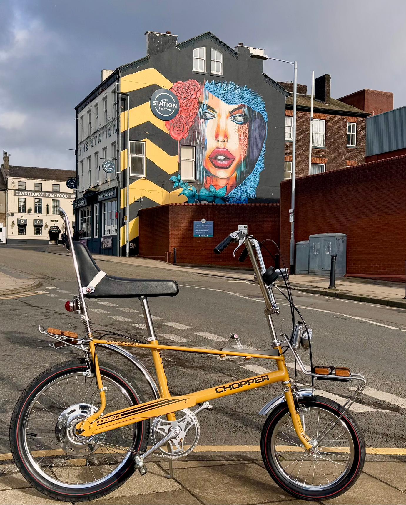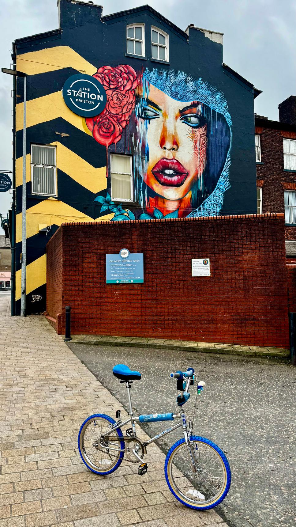 Cornish street mural artists Urban Gypset commissioned by Blind Tiger Inns to create this mural in 2020. It’s one of the most visible features as you come out of the Railway Station. The artwork features a woman with the Red Roses of Lancashire in her hair with black and yellow chevrons at the side.