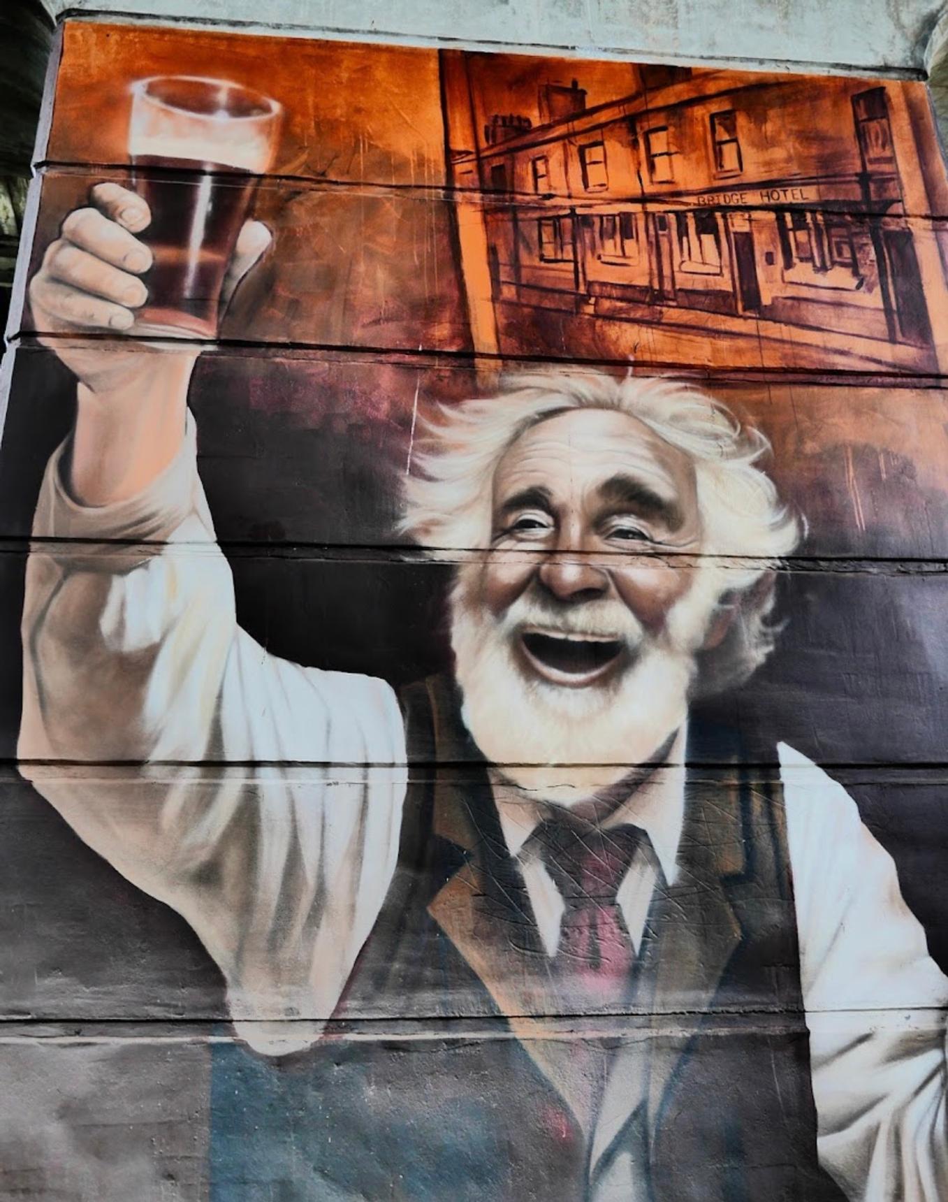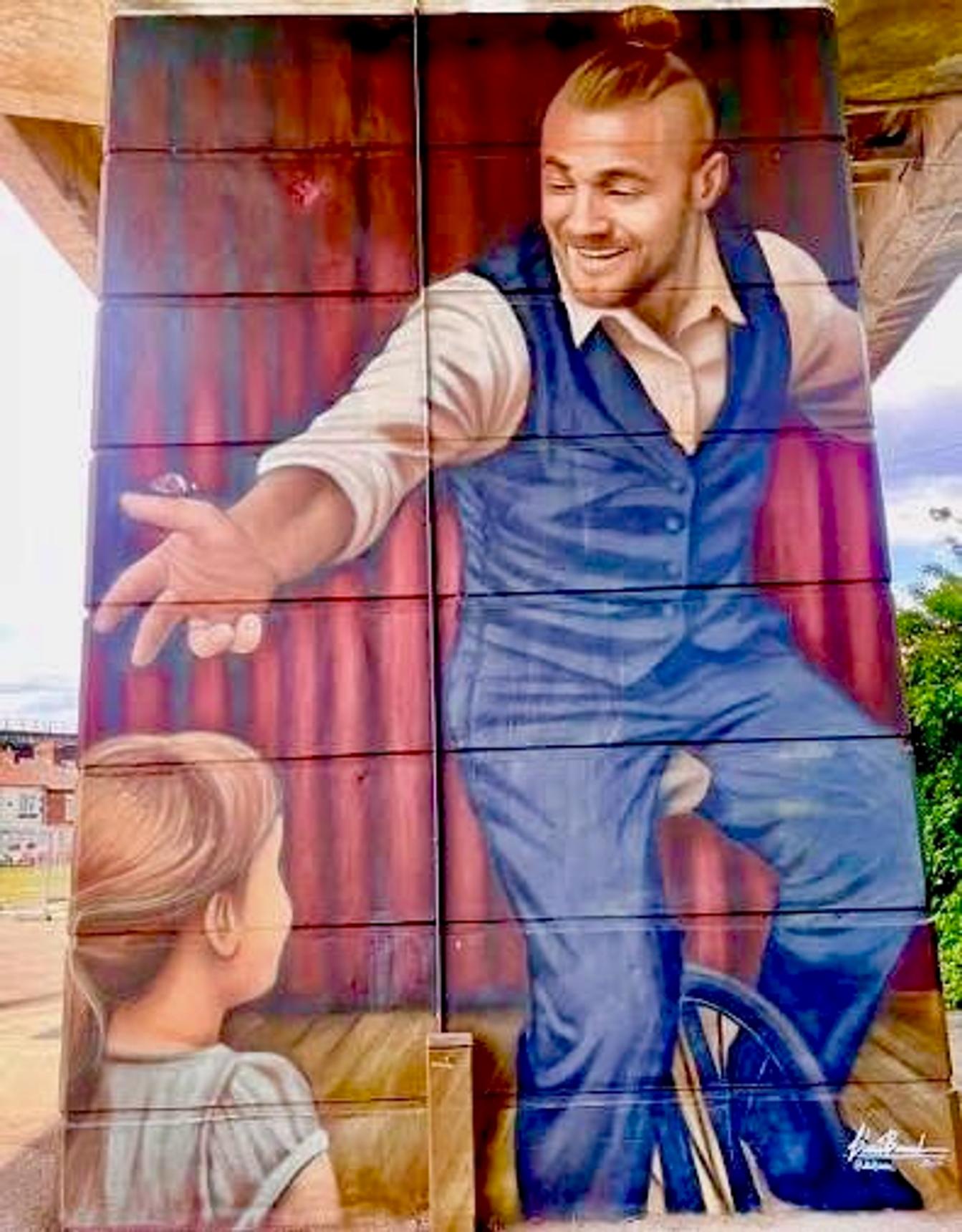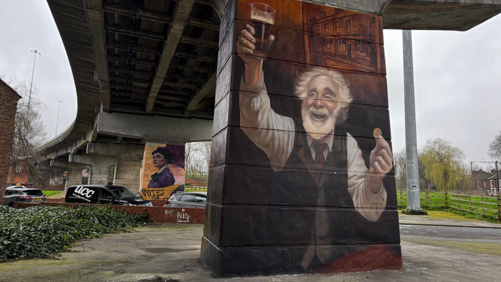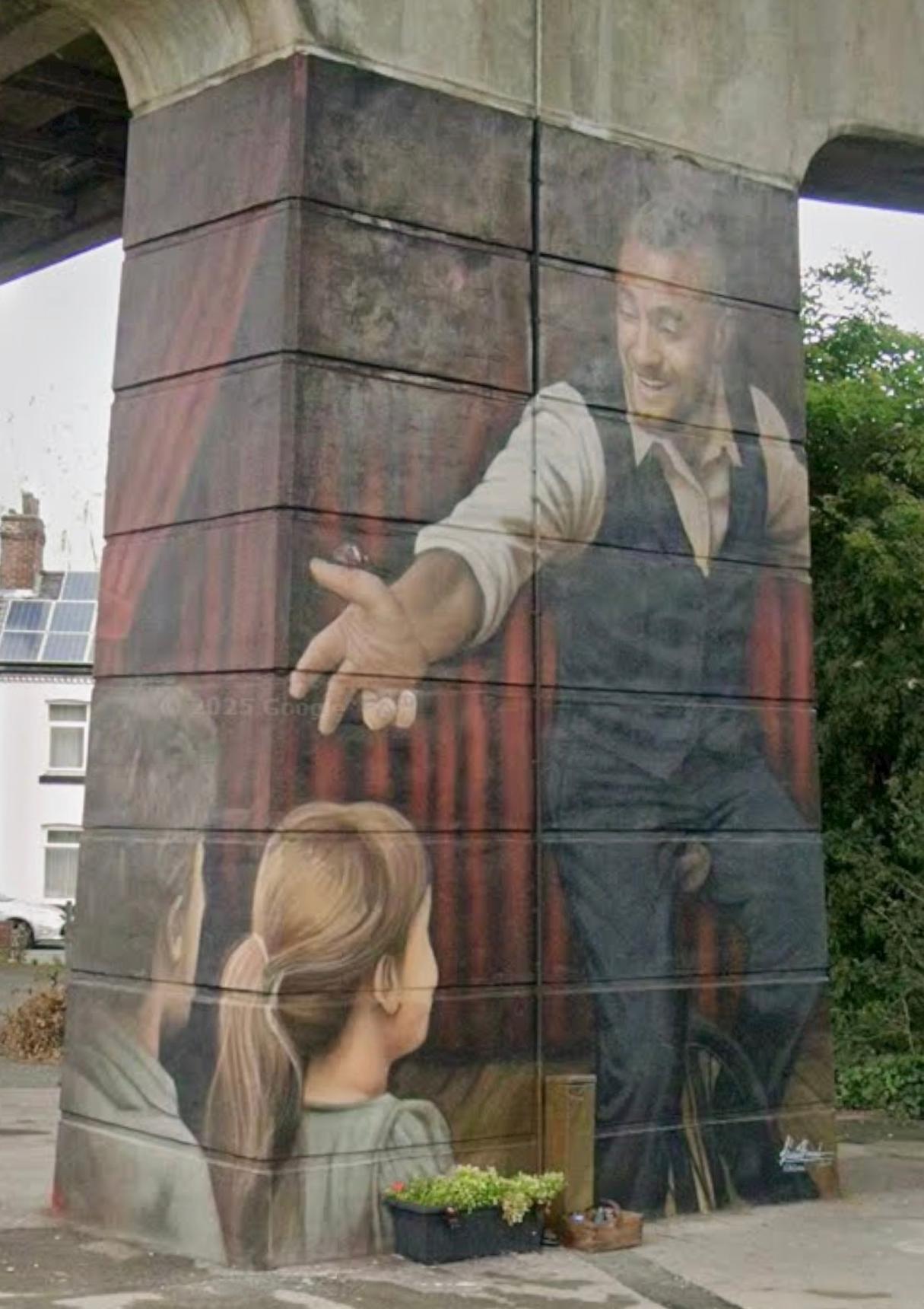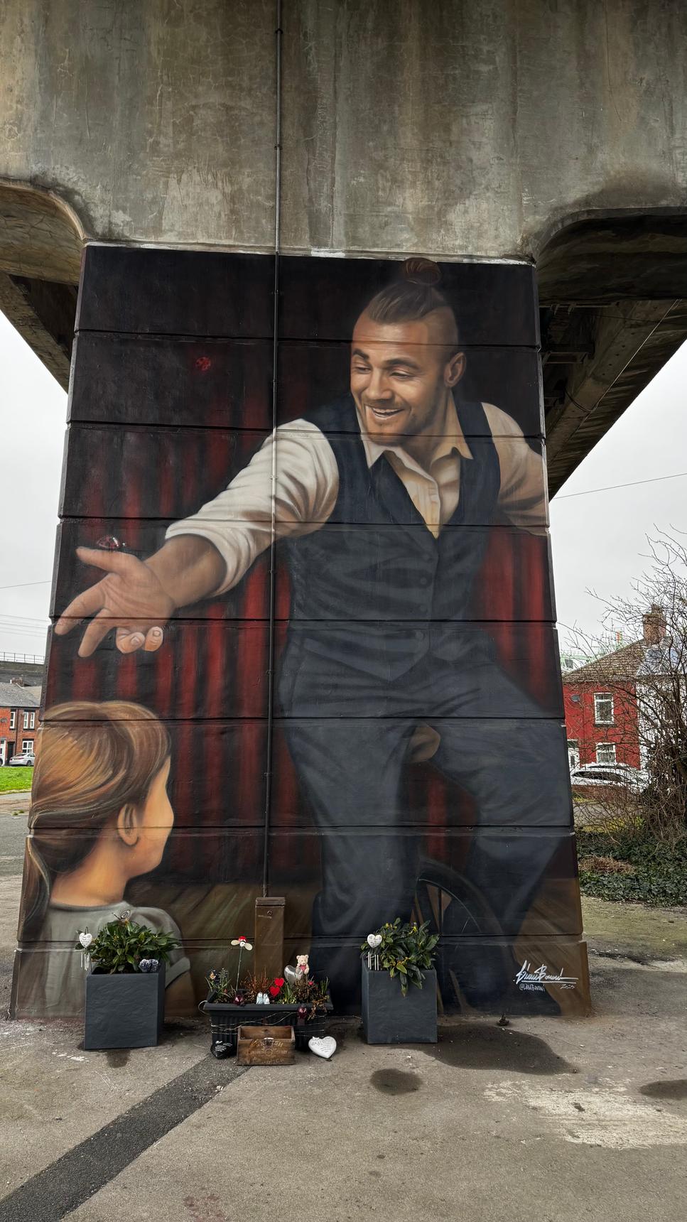 A tribute to the spirit of Runcorn where every pubs a theatre, and Alex Hallsworth a local that passed far too young. This mural is a part of the Dukesfield Murals commissioned by Runcorn and painted in September 2024 by Brazilian artist Liam Bononi.
