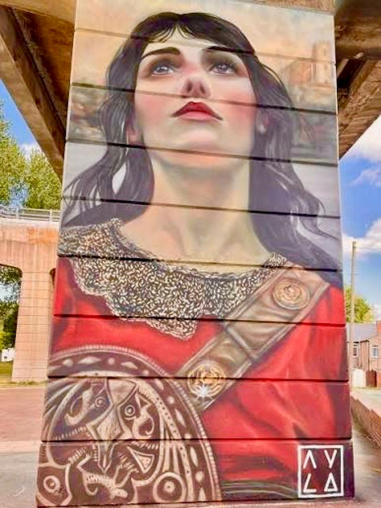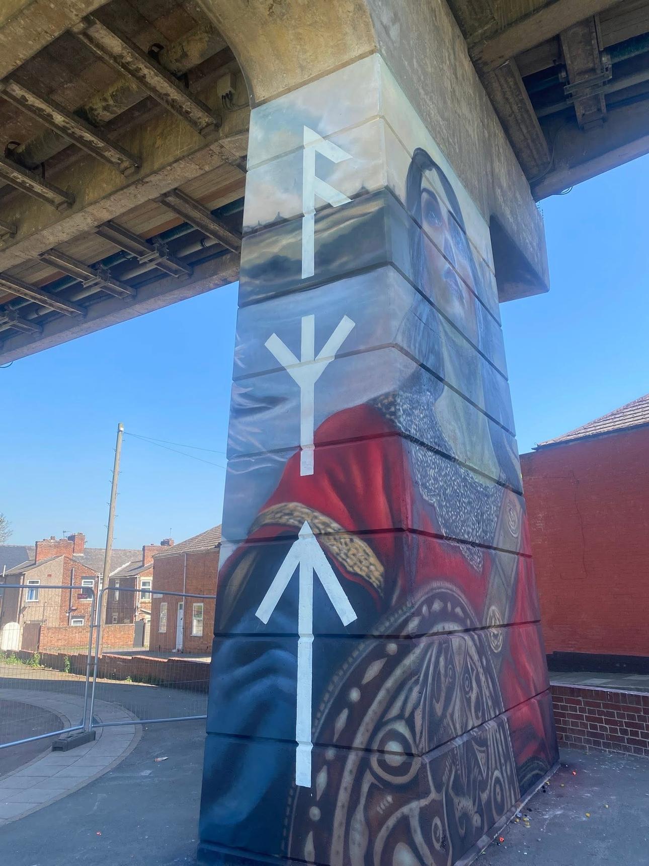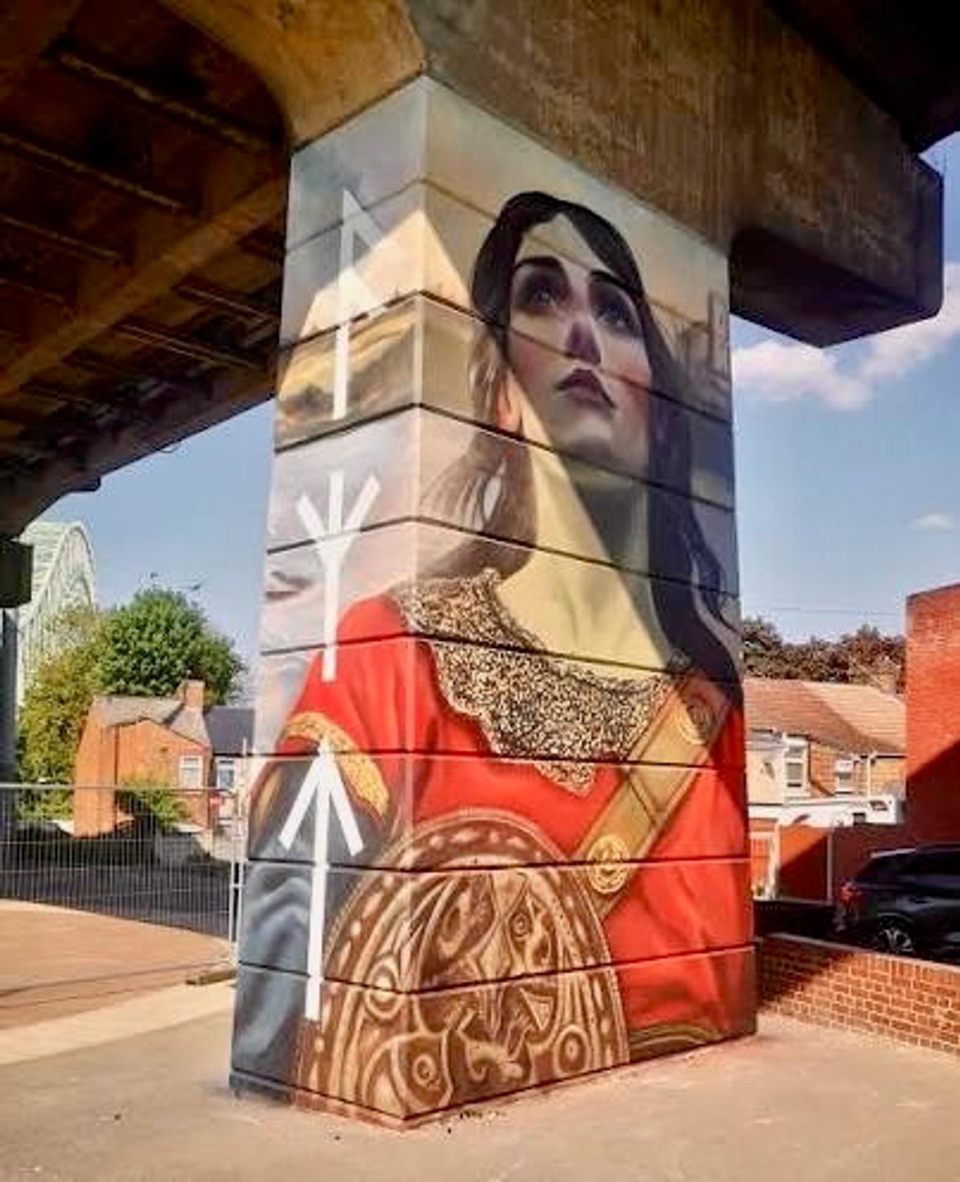 A tribute to Æthelflæd daughter of King Alfred and lady of the Mercians that built military bases in the area to defend their region from the Vikings. This mural is a part of the Dukesfield Murals commissioned by Runcorn and painted in September 2024.