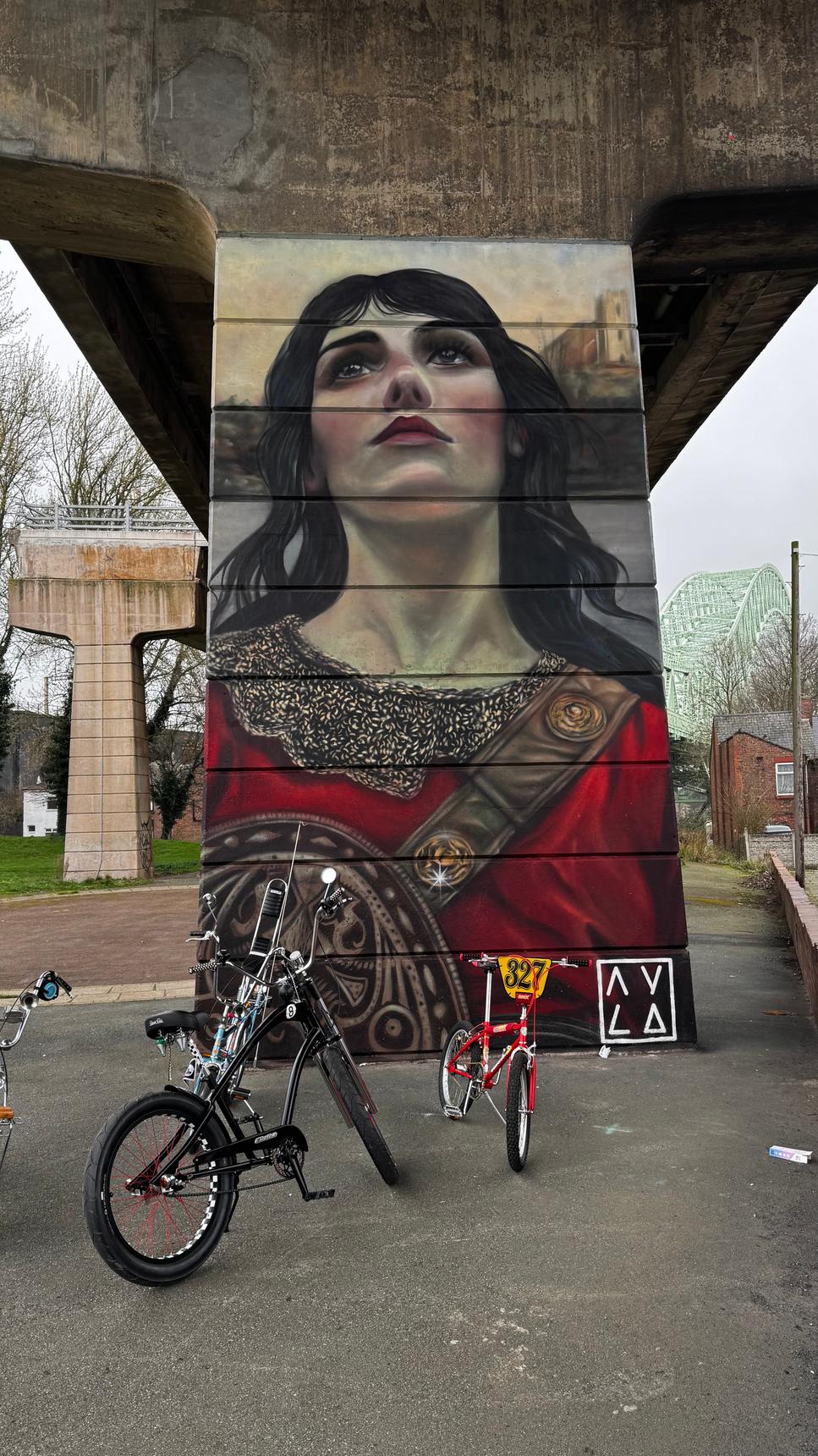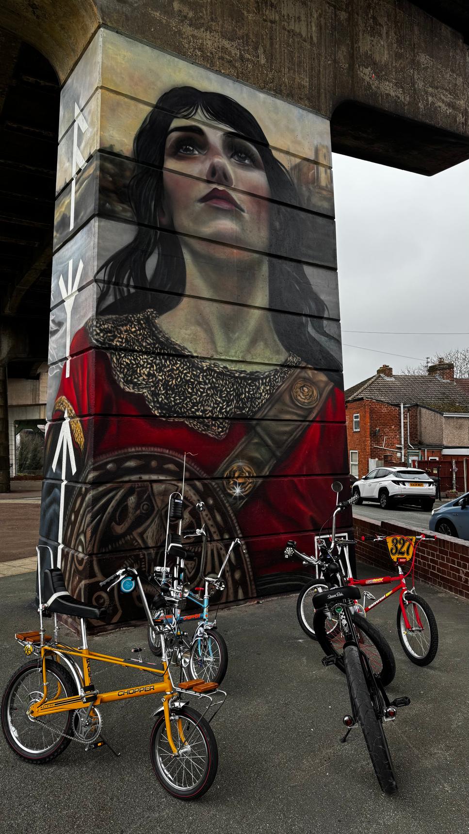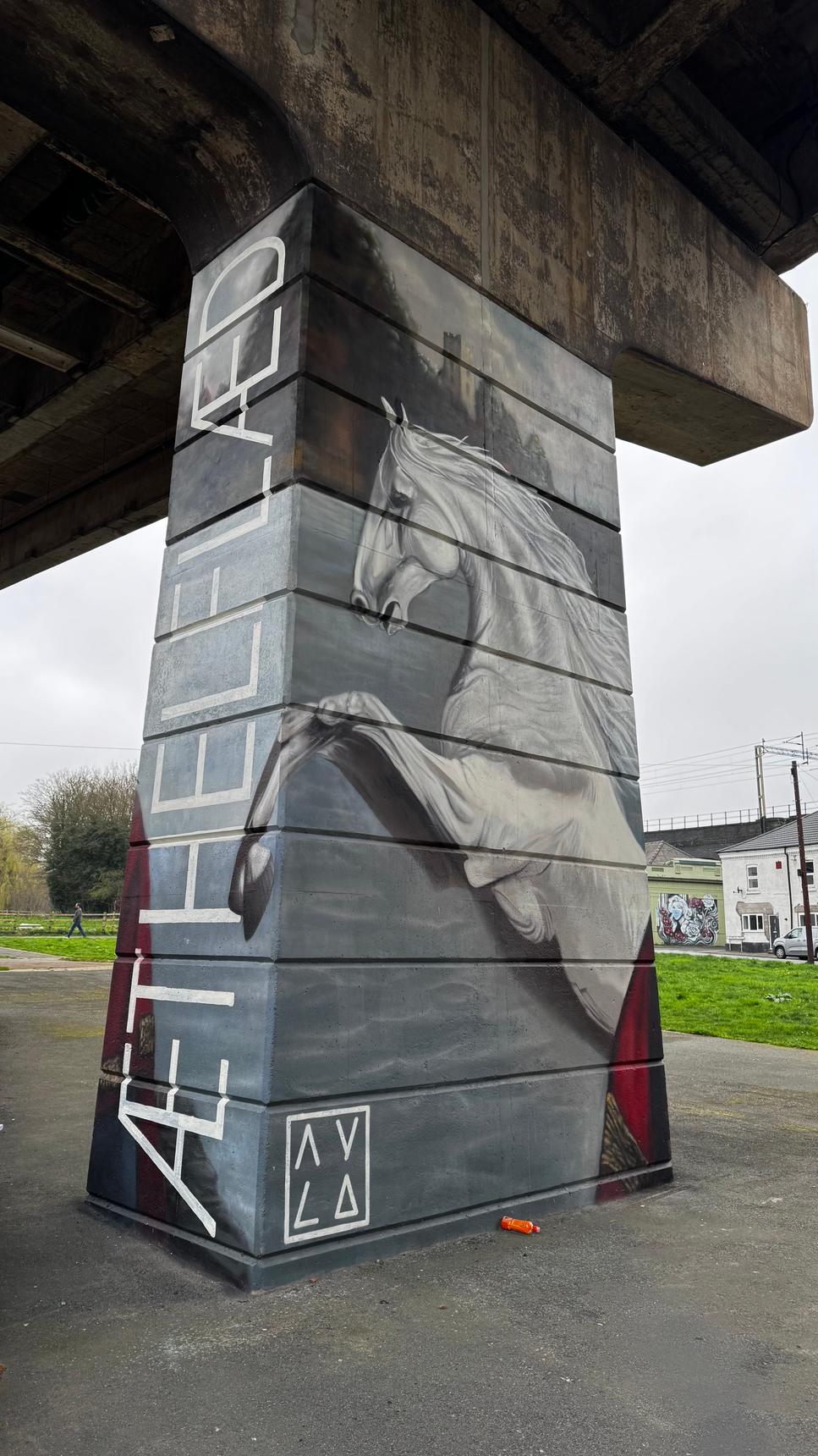 A tribute to Æthelflæd daughter of King Alfred and lady of the Mercians that built military bases in the area to defend their region from the Vikings. This mural is a part of the Dukesfield Murals commissioned by Runcorn and painted in September 2024.
