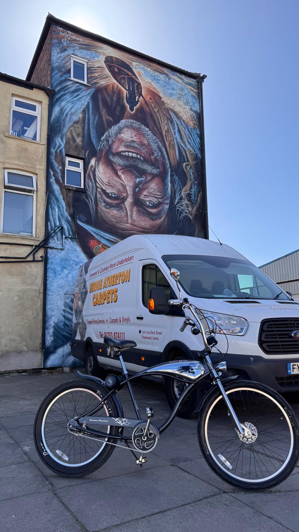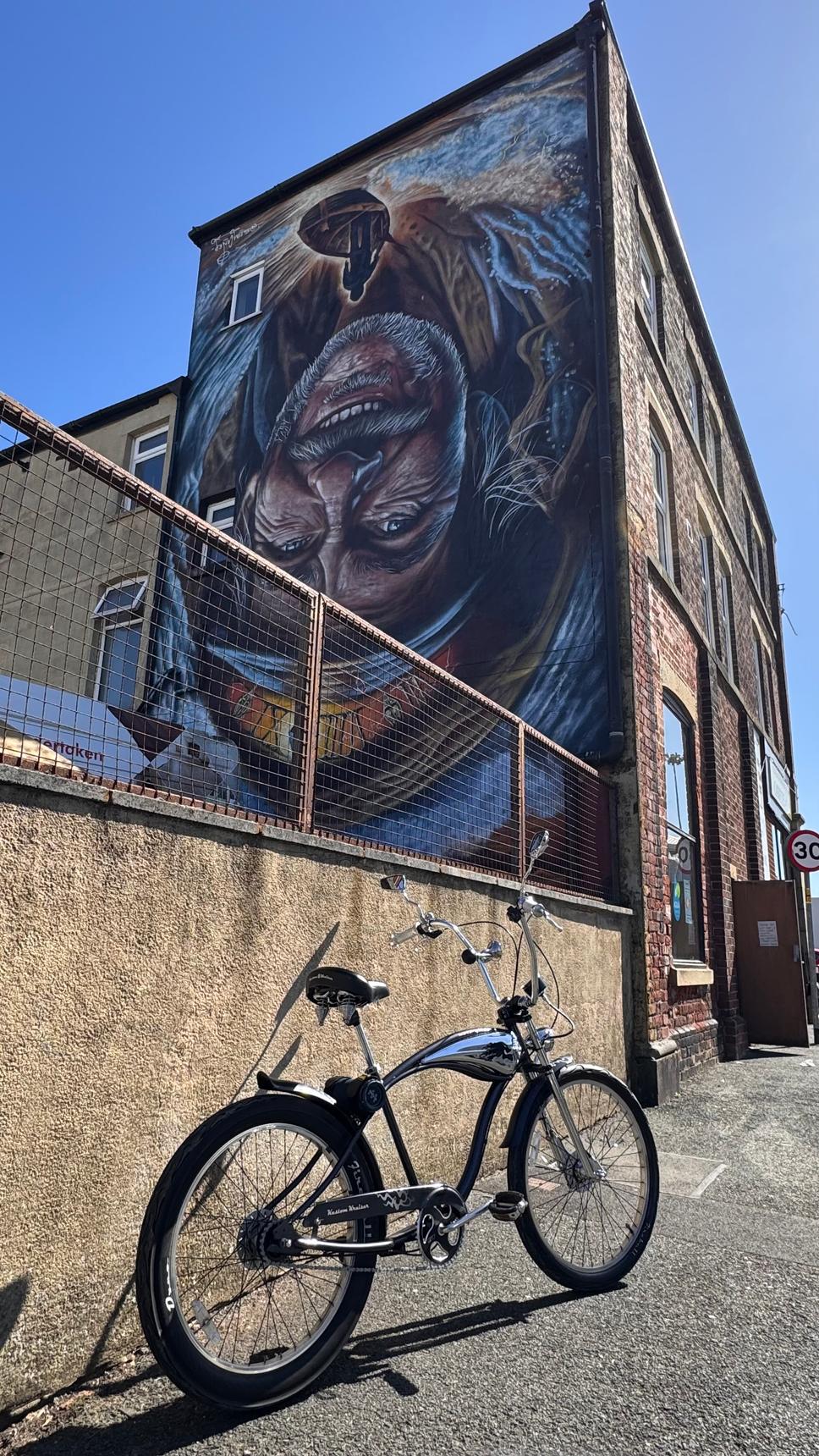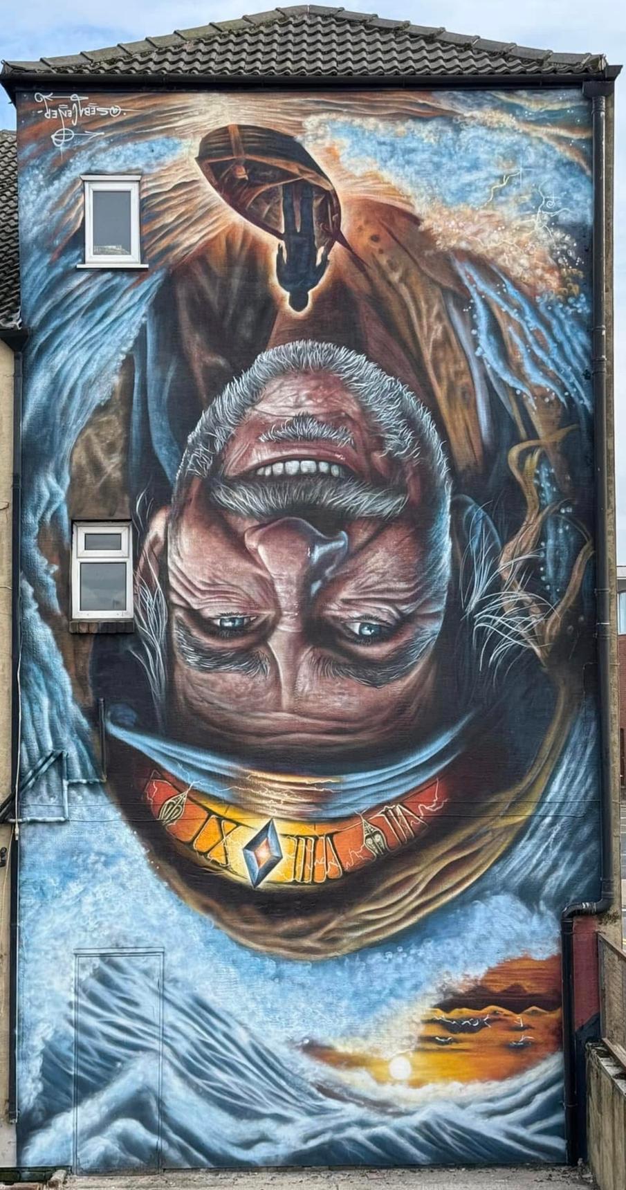 Part of the Big Heart Project in 2024. Argentinian artist Seba Cener came over to do this art work. The fisherman is upside down to provoke engagement in the piece. He is smiling as he goes into the unknown. Smiling as a positive way of facing challenges. Seba met Seca One and Aylo on another project which lead to the invitation.