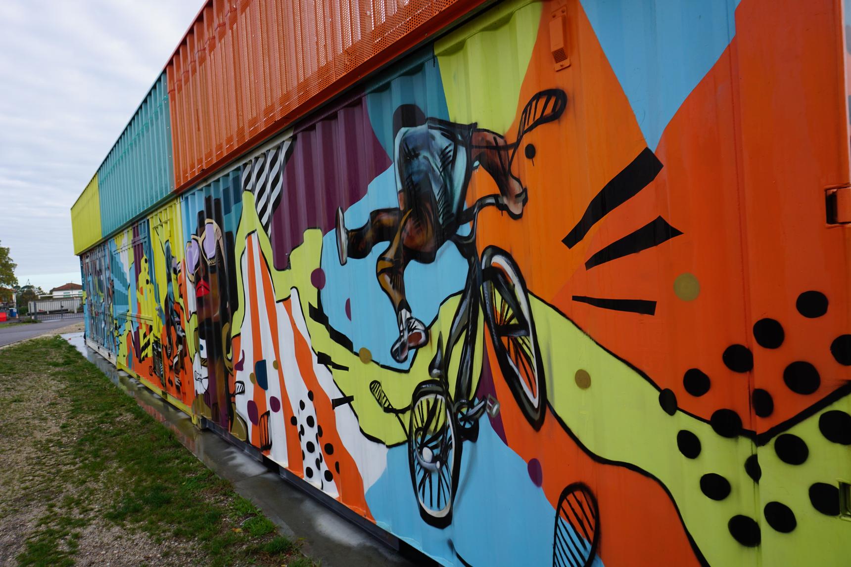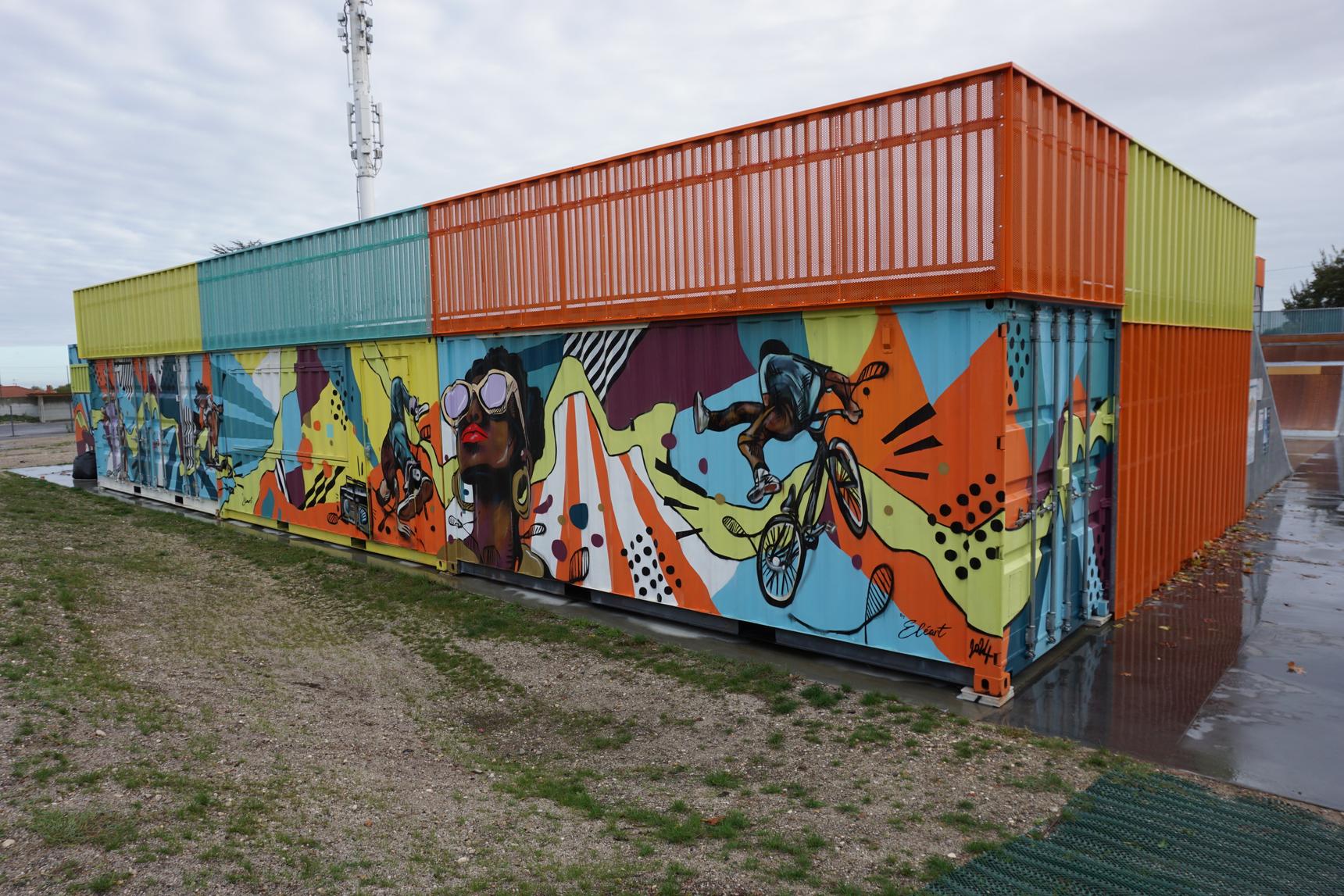 Réalisée à la suite des travaux de reconstruction du skatepark de Bellegrave en 2024, historique théâtre des contests de skate, BMX, roller et trottinette organisés lors des Vibrations Urbaines, cette grande fresque apporte une dimension artistique et colorée au site. L’ensemble des représentations figurant sur l’œuvre renforce le lien entre les différentes disciplines sportives et artistiques dites « urbaines » représentées et célébrées sur place chaque année.