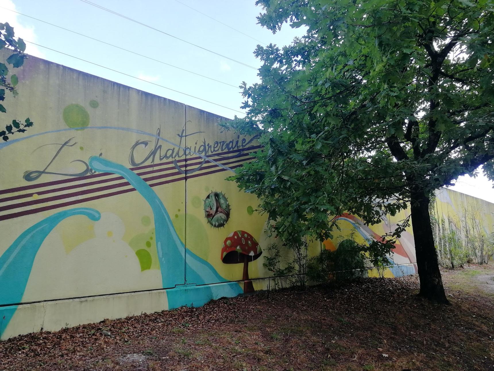 Dans un projet d’embellissement de ce mur antibruit de 880m de long, le groupe SNCF Réseau en partenariat avec la Ville de Pessac, Domofrance, le Centre Social de la Chataigneraie et Action Jeunesse a initié la réalisation de cette fresque de 90 mètres de long située entre le boulodrome et le city stade. Cette fresque a été réalisée en association avec des jeunes du quartier lors d’ateliers organisés avec le Centre Social de la Chataigneraie et orchestrée par les artistes Kendo et Jone. L’œuvre explore la géométrie, l’abstraction et les lettres avec des approches différentes.