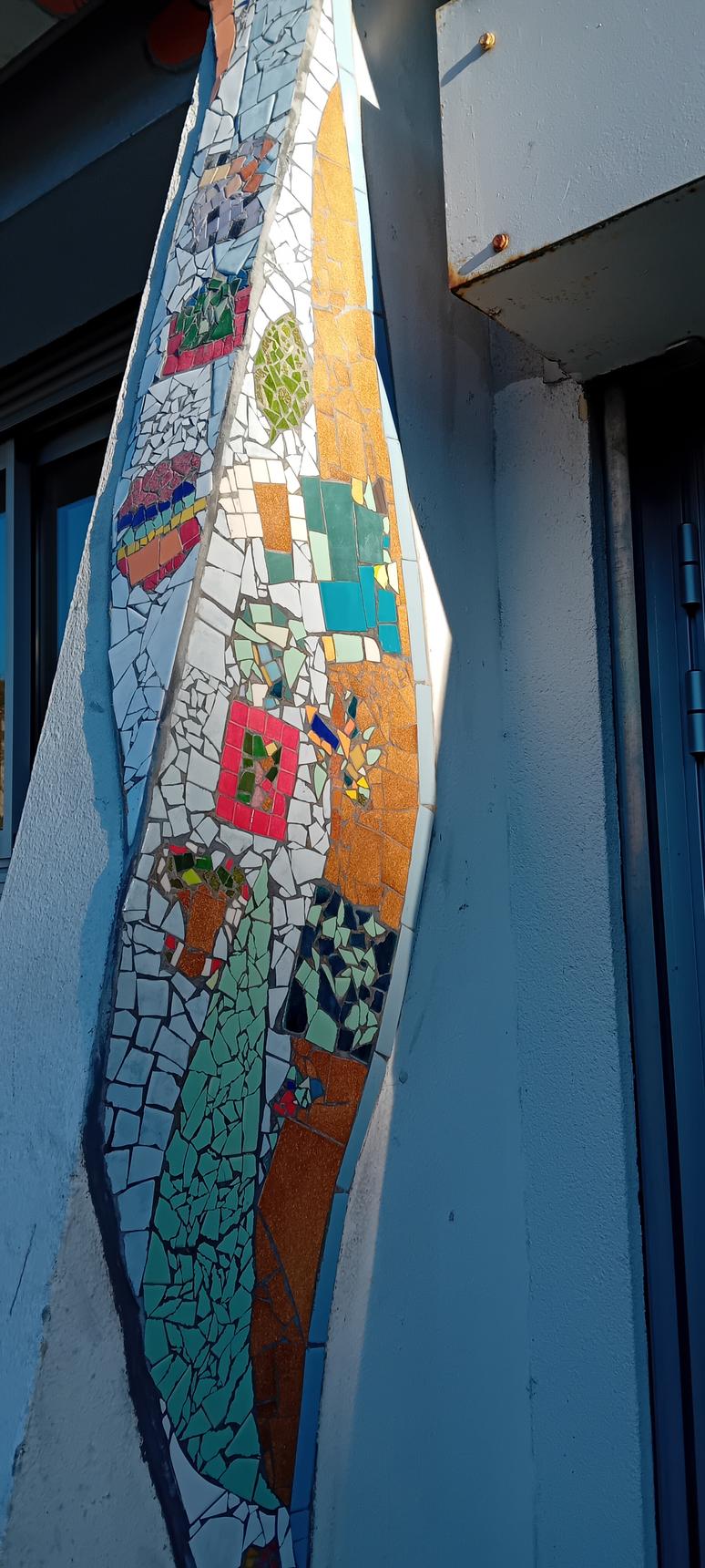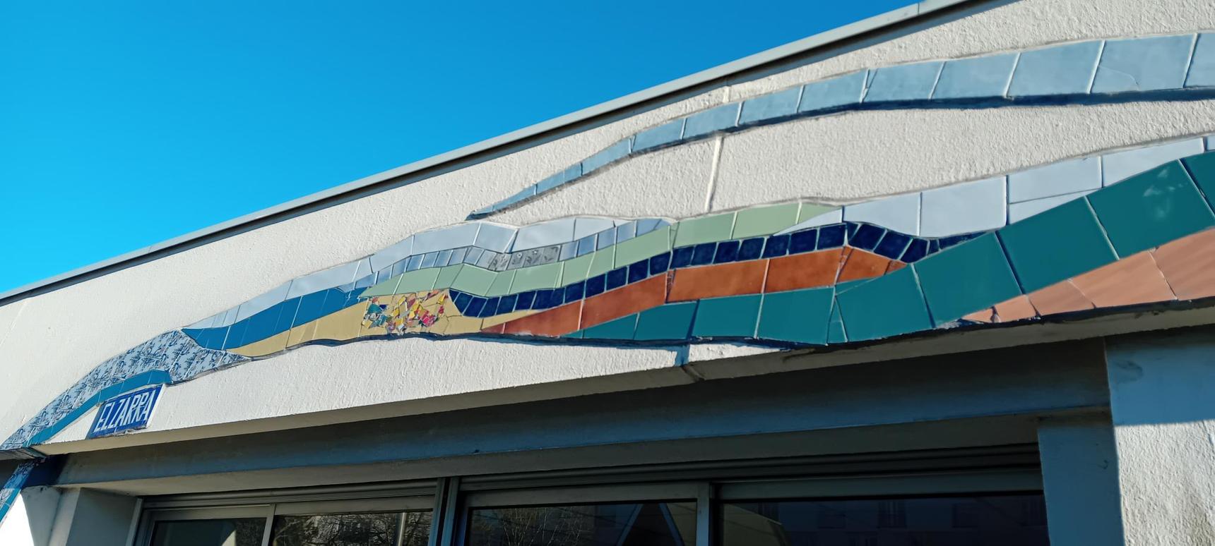 Tout au long du projet, enfants, familles, usagers du centre et passants ont été invités à manipuler la matière, assembler les fragments et participer activement à la création de cette mosaïque grandeur nature. L’ensemble de la fresque a été réalisée à partir de carrelages revalorisés, apportés en grande partie par les habitants eux-mêmes, donnant à l’œuvre une dimension à la fois écologique, intime et profondément ancrée dans le territoire. Une démarche au cœur du travail d’Elzarra, qui conçoit l’art urbain comme un outil de lien, de mémoire et d’appropriation des lieux.