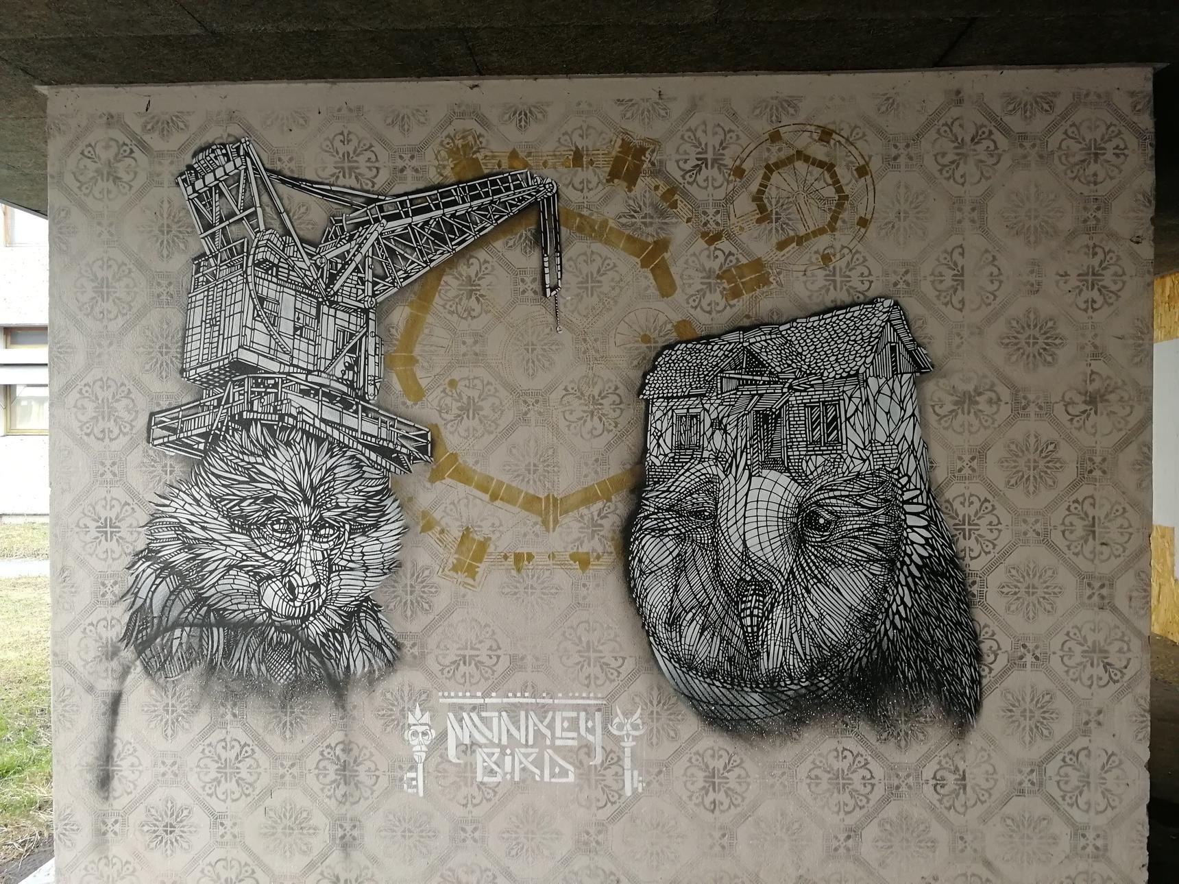 Ouvrez les yeux, plusieurs œuvres du collectif bordelais Monkey Bird Crew sont dispatchées le long de la galerie reliant le bâtiment A à la Maison des Etudiants de l’Université de Bordeaux Montaigne. Les pochoirs représentant des oiseaux et des singes sont présents sur les murs, portes, dans les recoins ou en hauteur, formant un véritable parcours artistique.