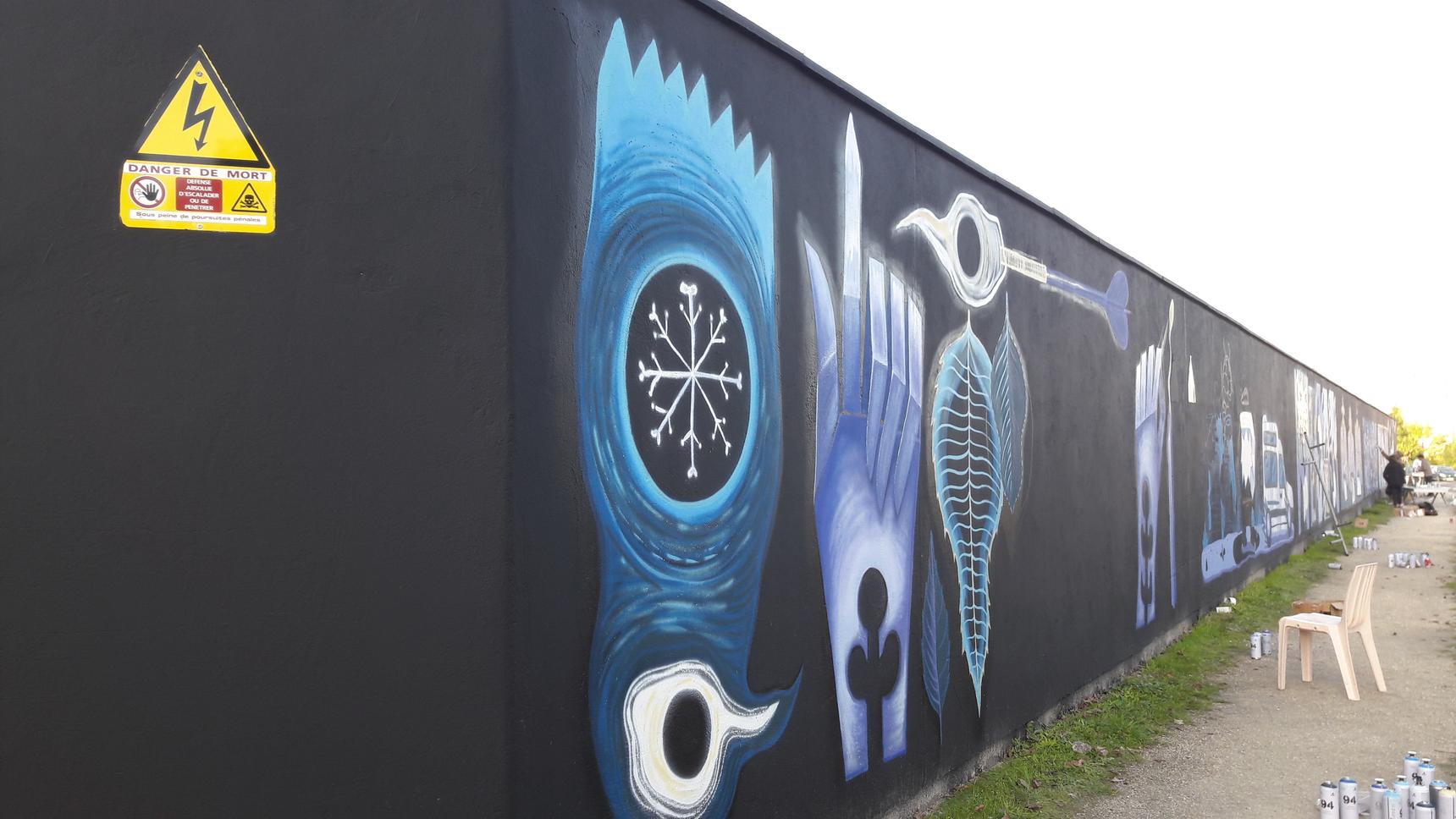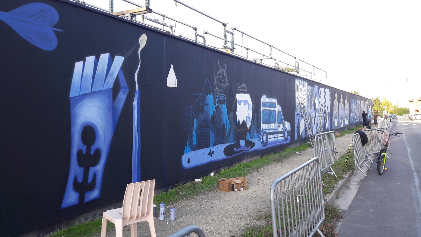 Dans le cadre d’un partenariat mené avec le festival Colorama et la Brasserie Mira durant le festival Vibrations Urbaines, ENEDIS a mis à disposition un mur de 60 mètres de long au niveau du poste de la Paillère. Seule la couleur bleue était imposée pour des raisons esthétiques et des wild card avaient été proposées aux bordelais du TT Crew (BOBAXX, JACK USINE et POLKA). 4 artistes ont aussi été sélectionnés pour compléter la liste et laisser libre court à leur imagination : Bebop, Loraine, Selah et Trakt.