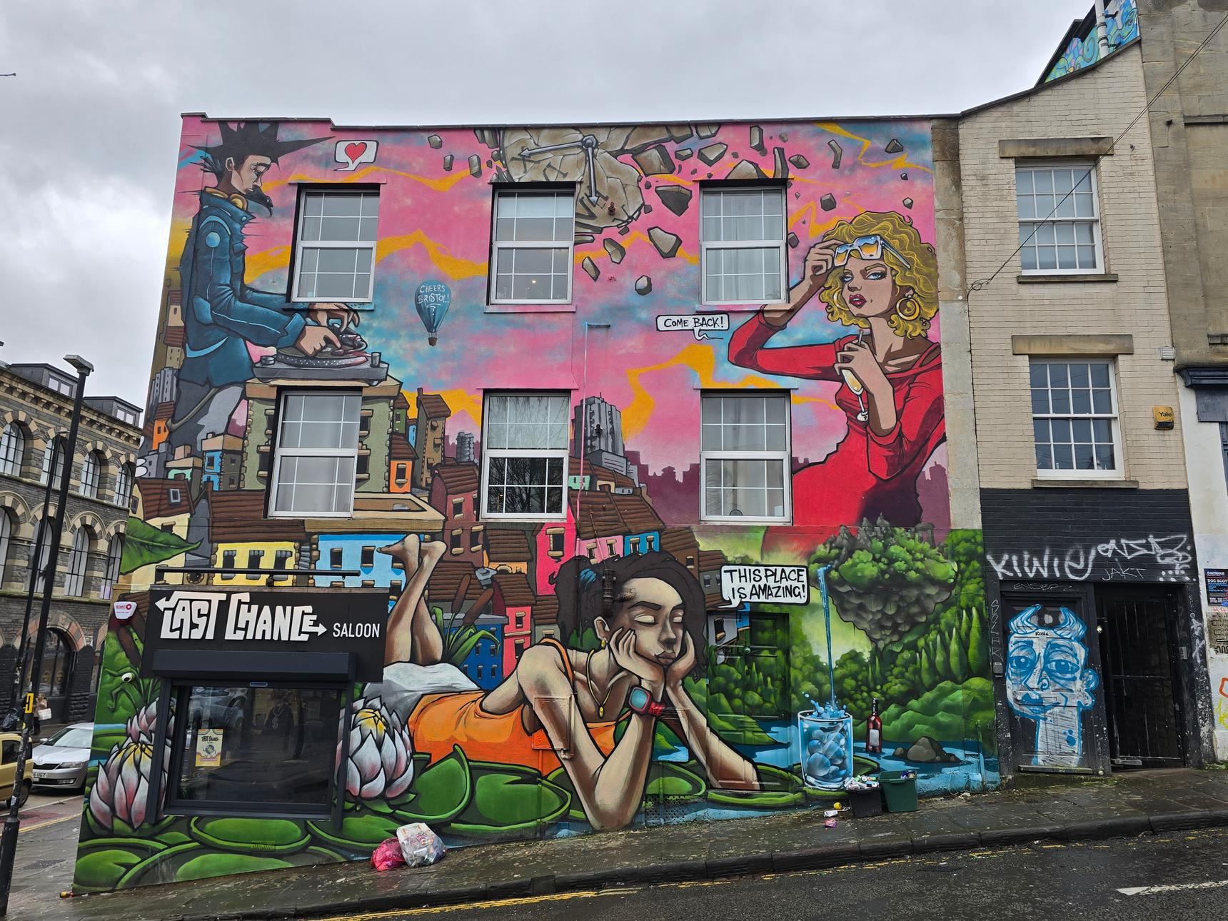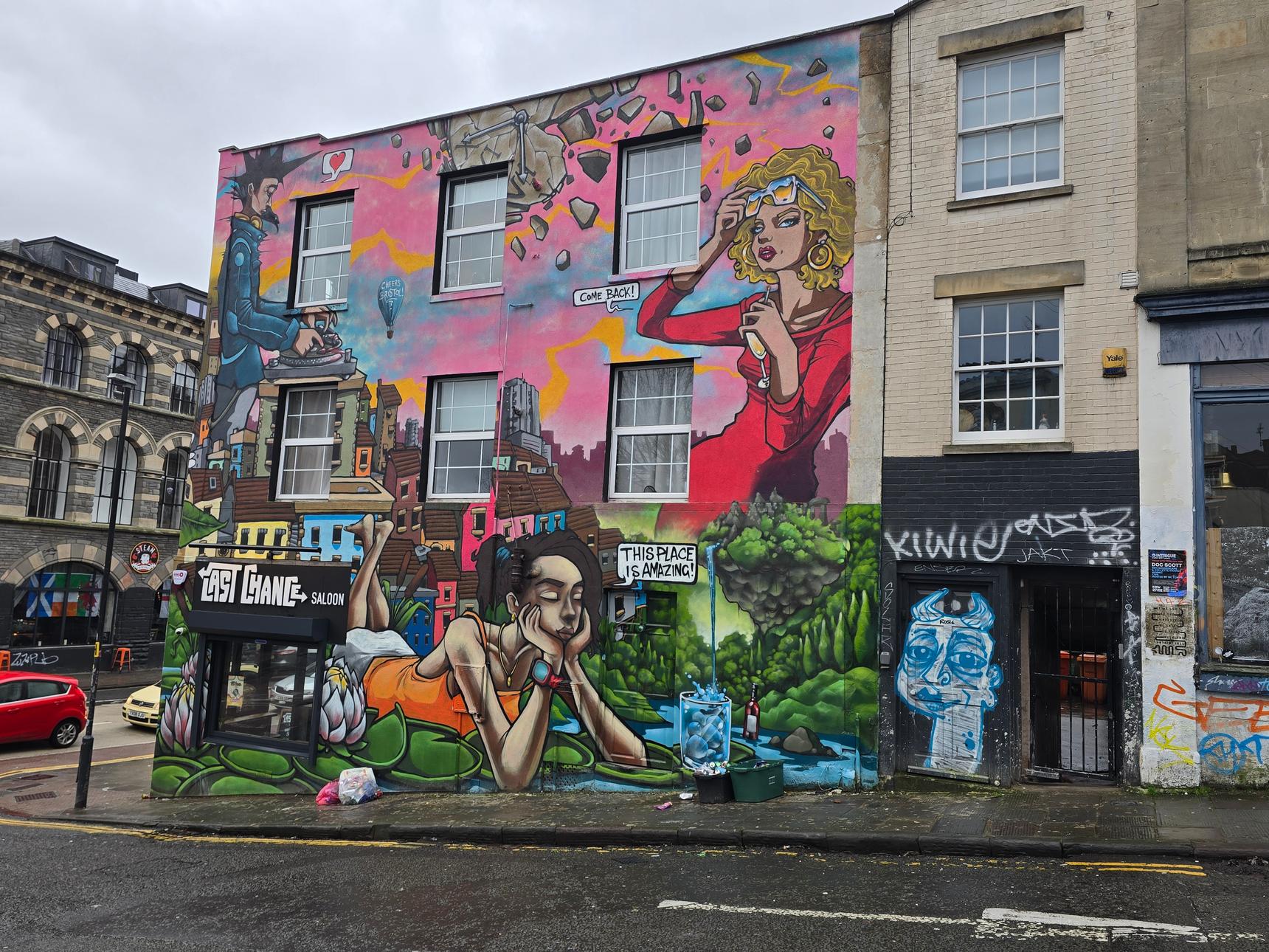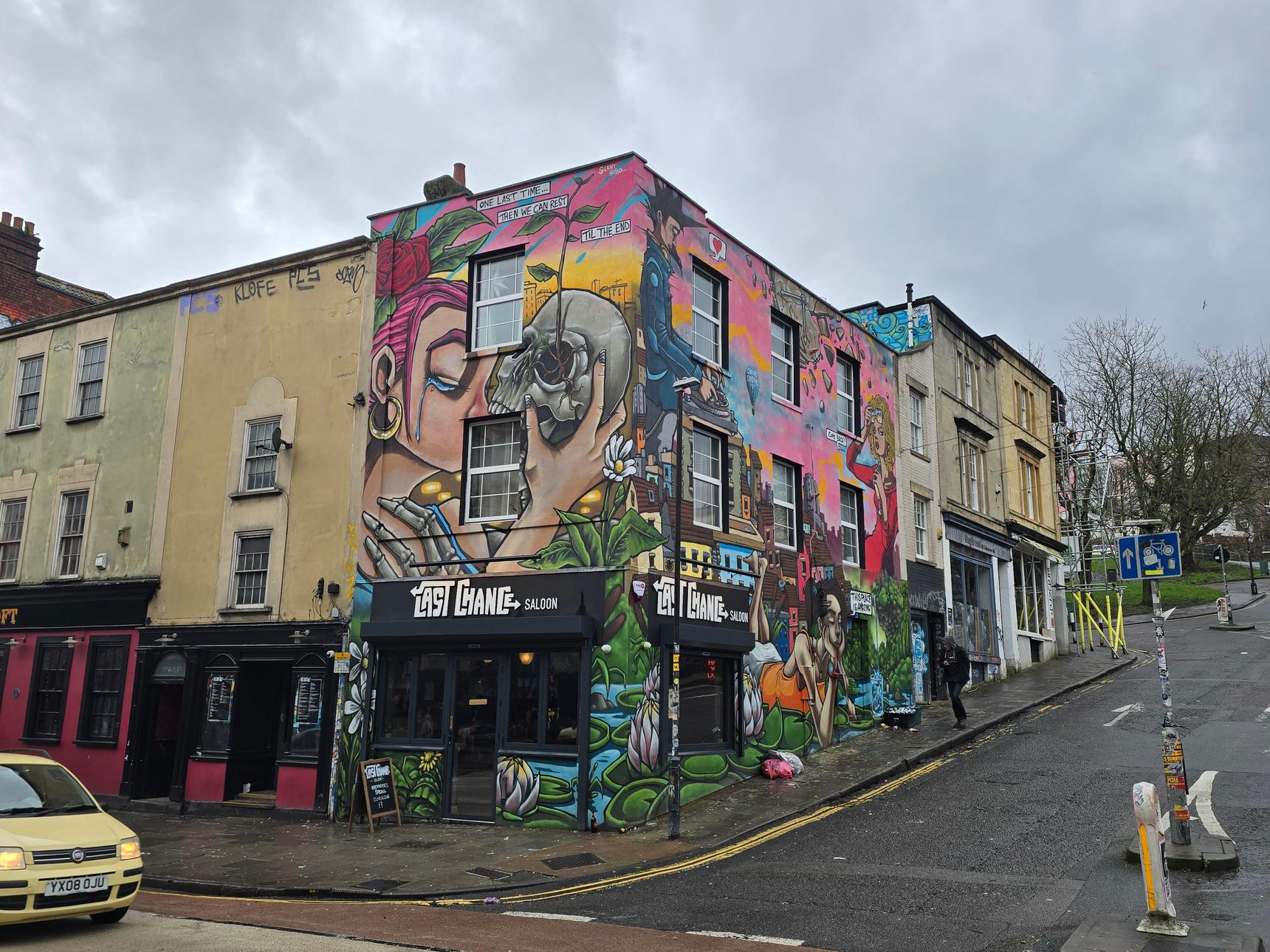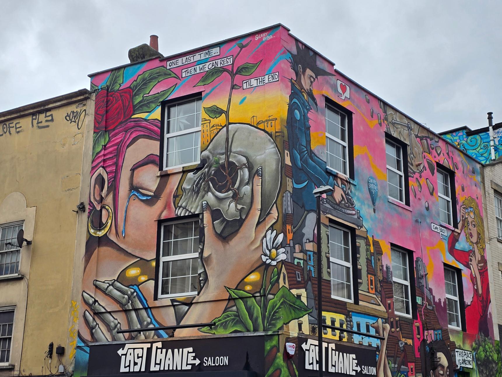 This colourful mural sits on two sides of Last Chance Saloon, and was created by local artist Silent Hobo, for the opening of the venue in October 2025.