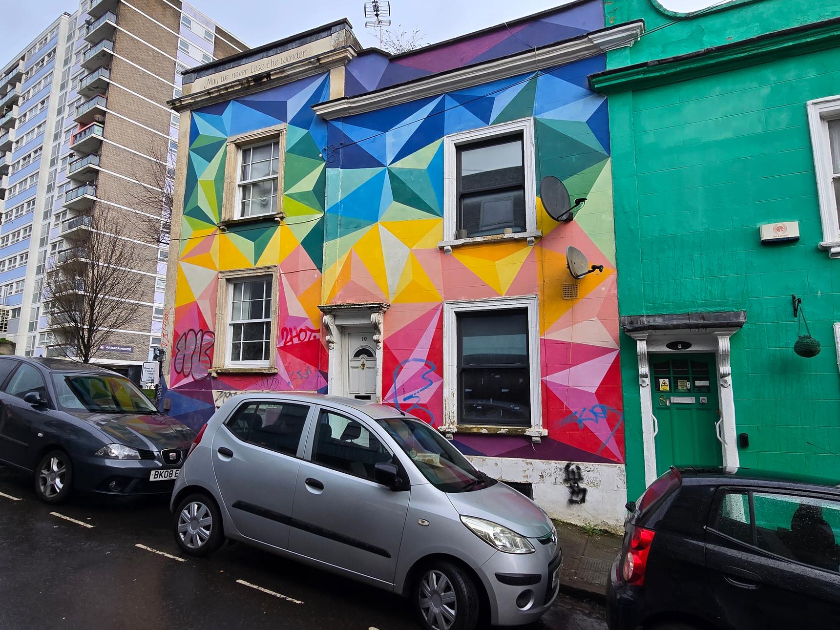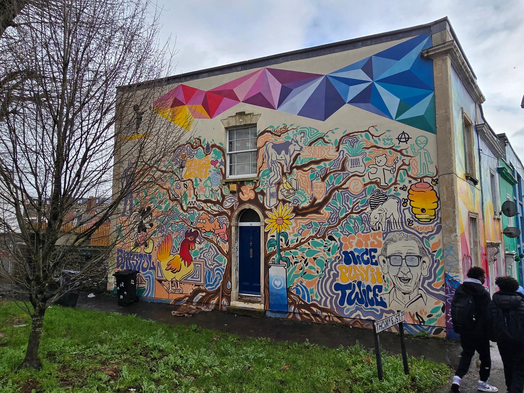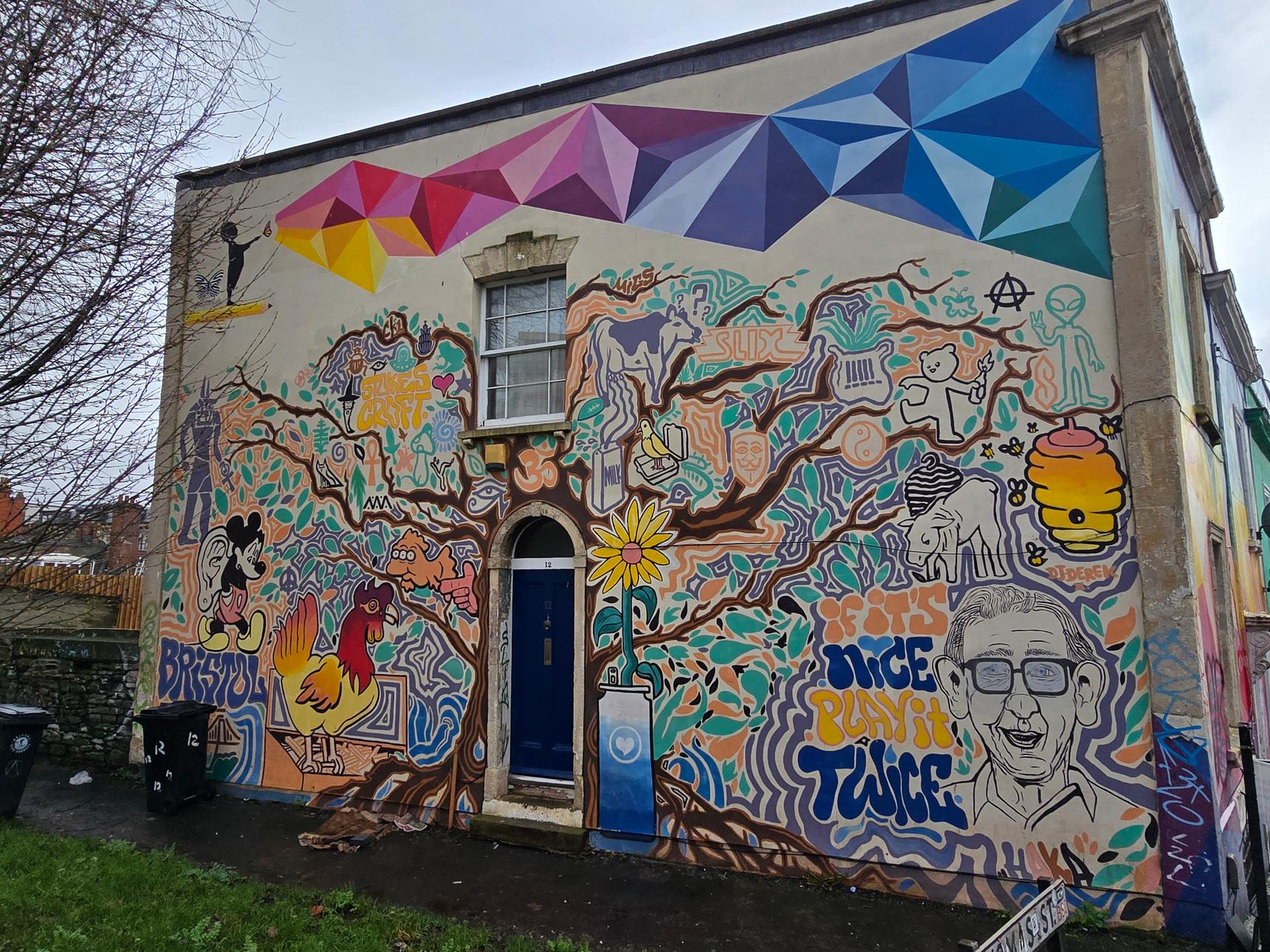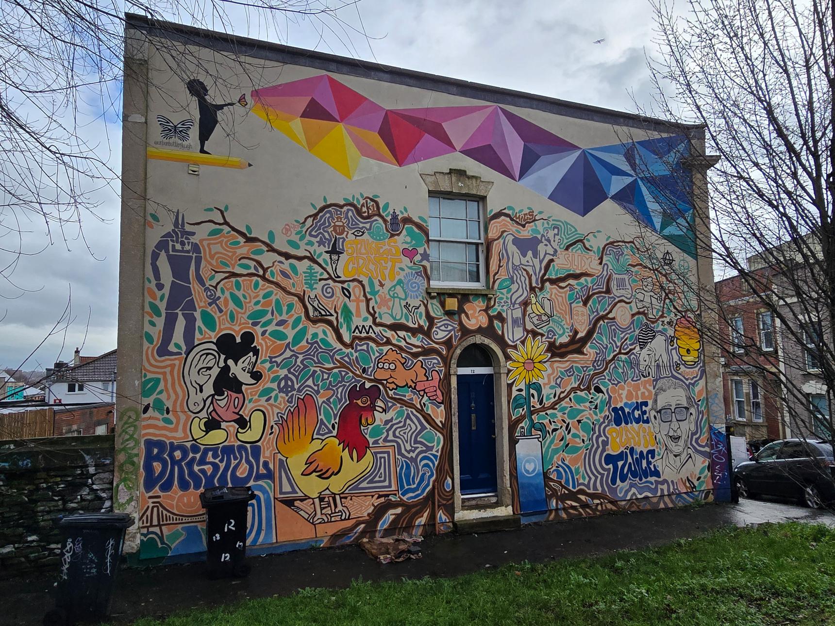 Two murals in one: The colourful mural that spans two sides of this building is by Urban Butterfly, and sits above the older mural by Haka and Slix, that depicts various figures from pop culture, such as the three-eyed fish from The Simpsons. Also hidden in this mural is the "Vacanti Mouse", the one with the ear on its back (although here, it is Mickey wearing it).