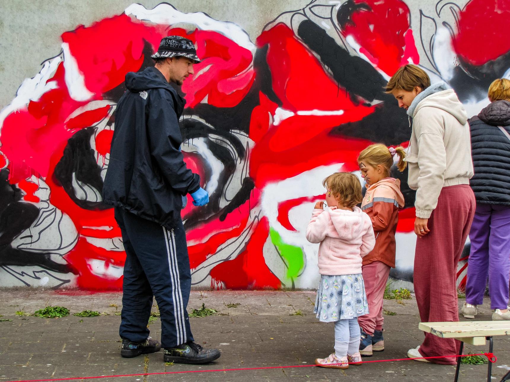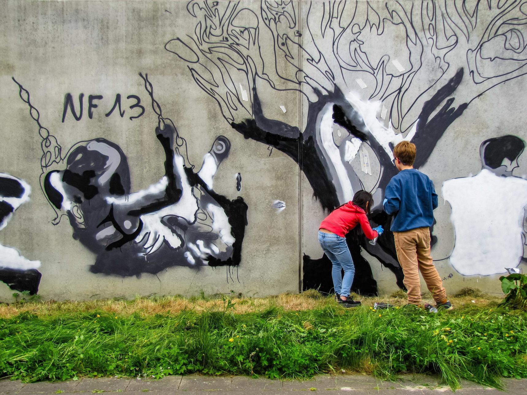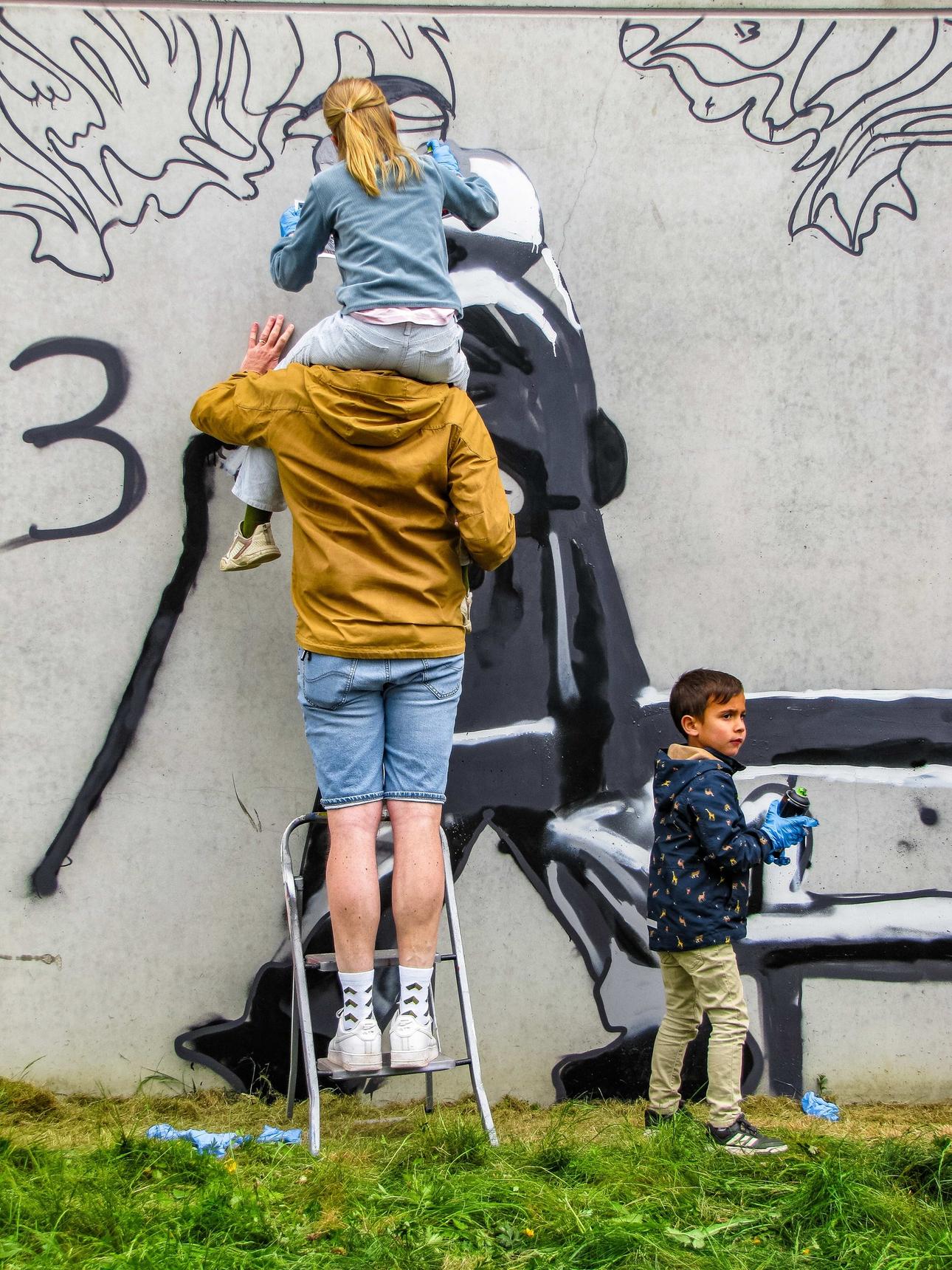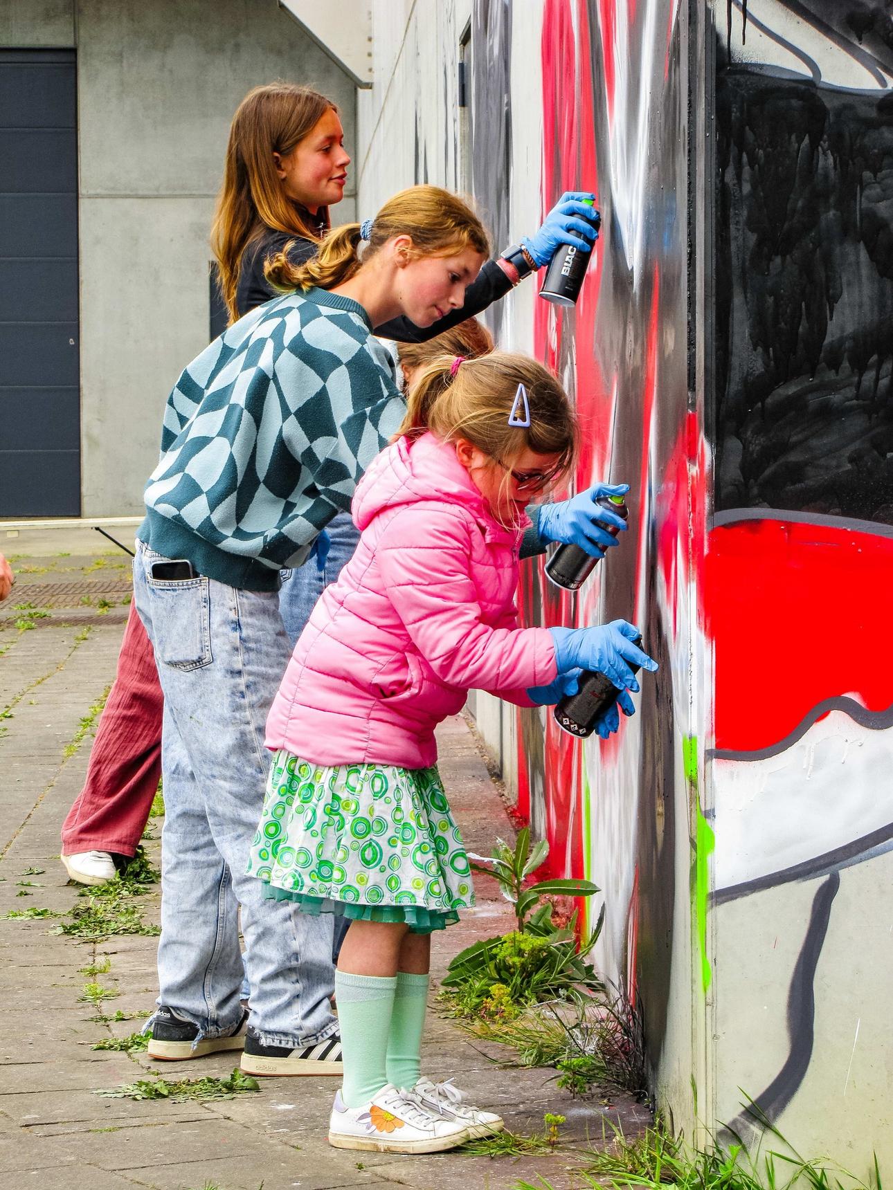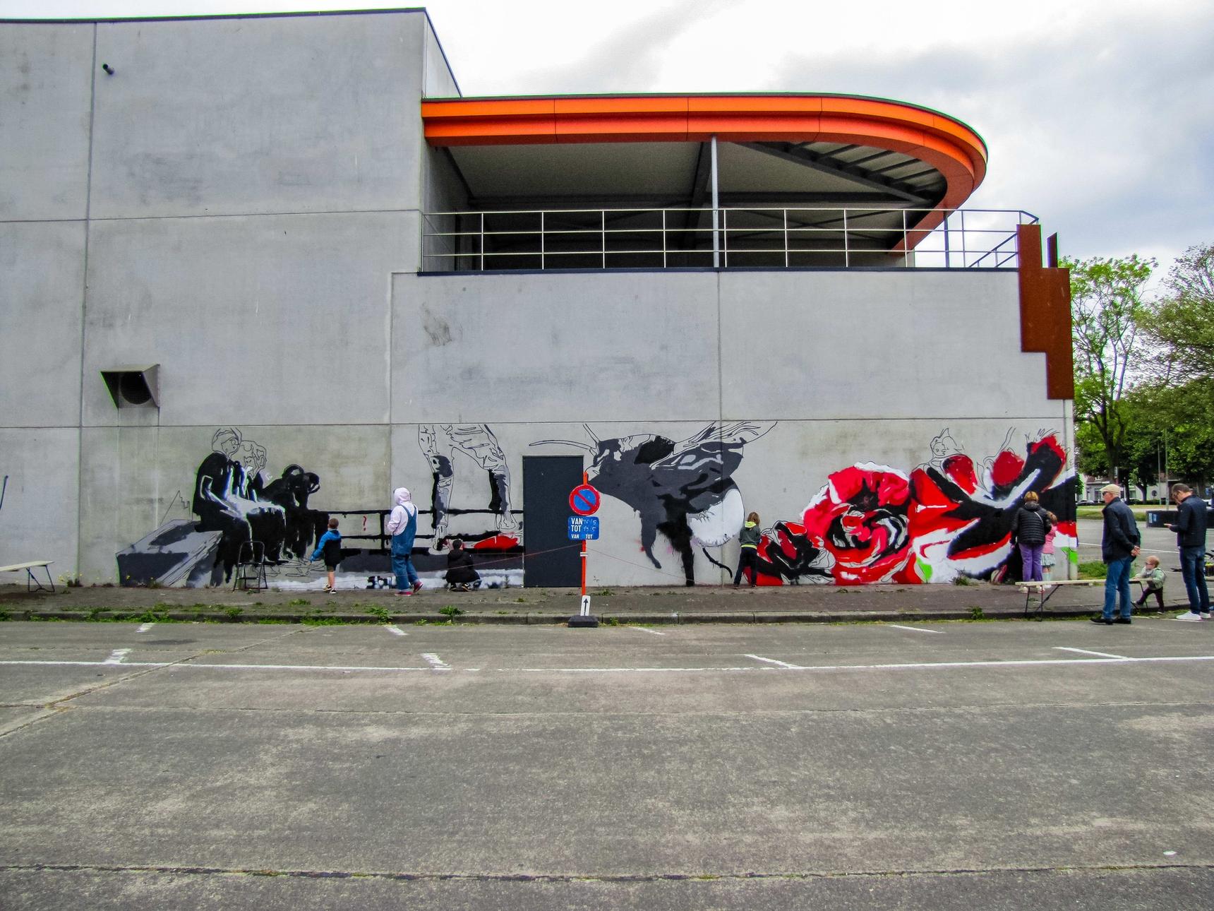 The ideas for this jam were provided by the neighborhood, after which they were further developed by PinkMan_Stuff. Following the Kaaifeest, with considerable assistance from local youth, the wall was completely finished by PinkMan_Stuff. The photos show a mix of the finished wall and the ‘making of’.