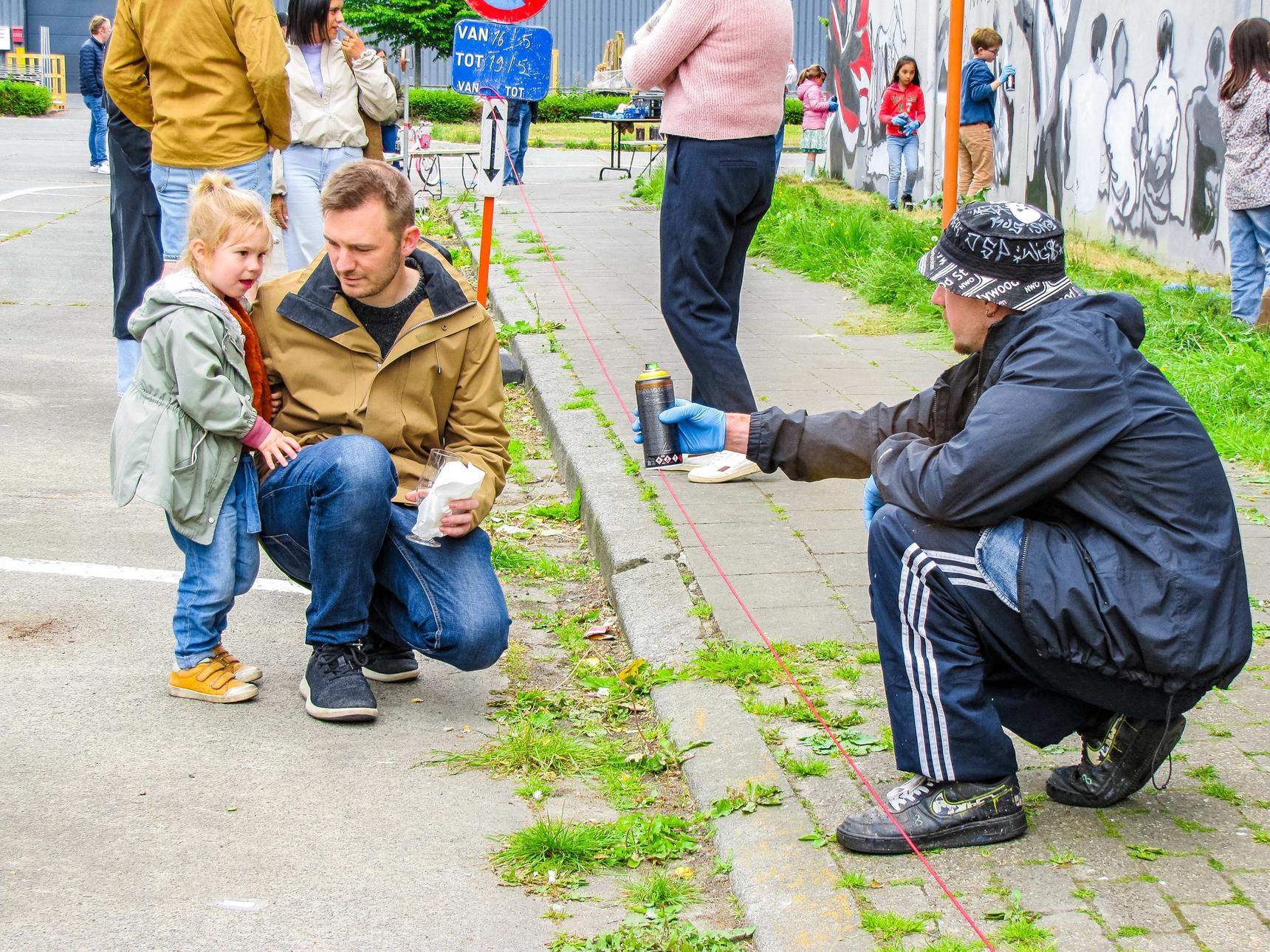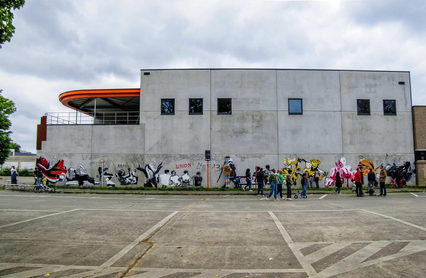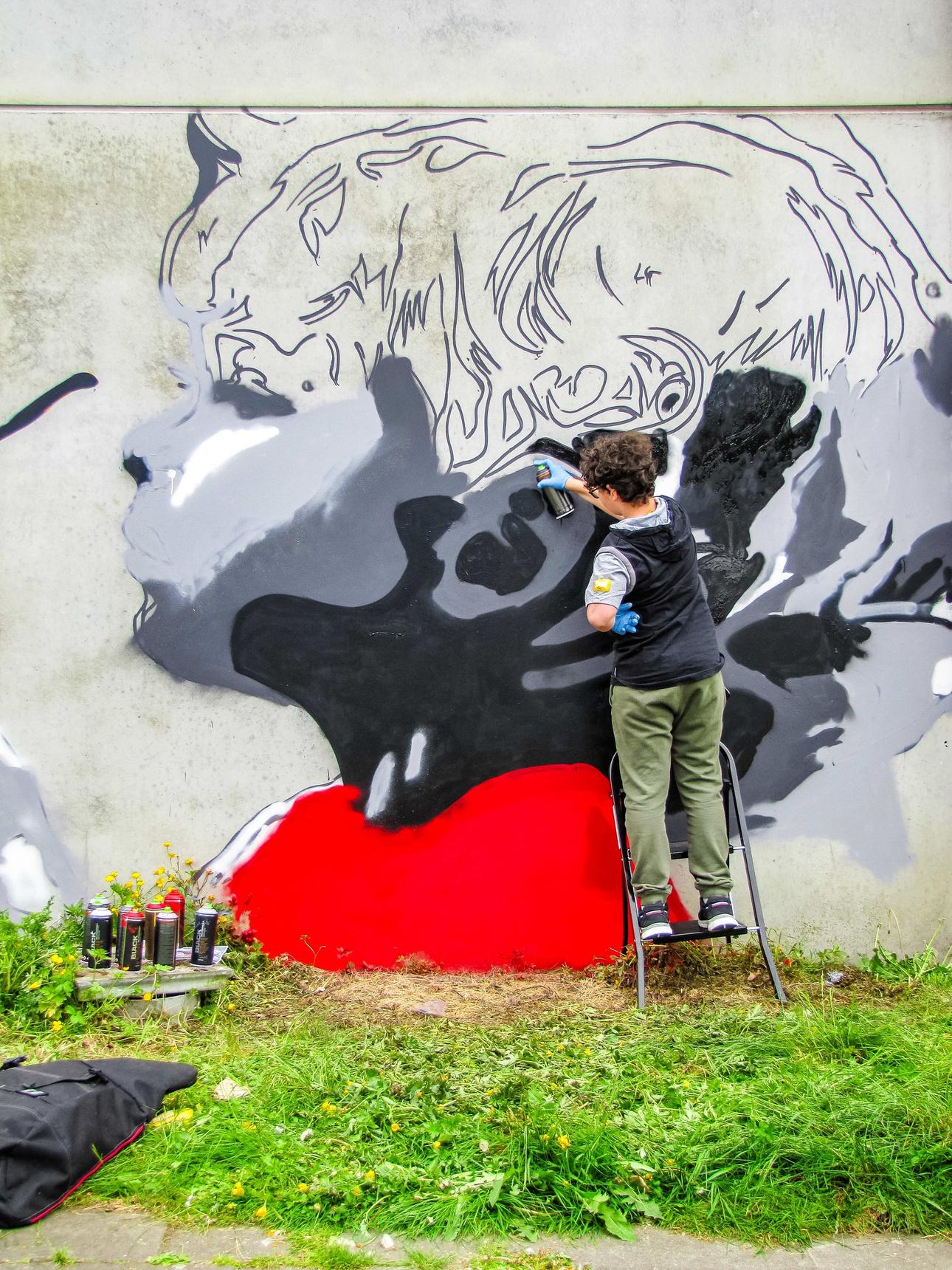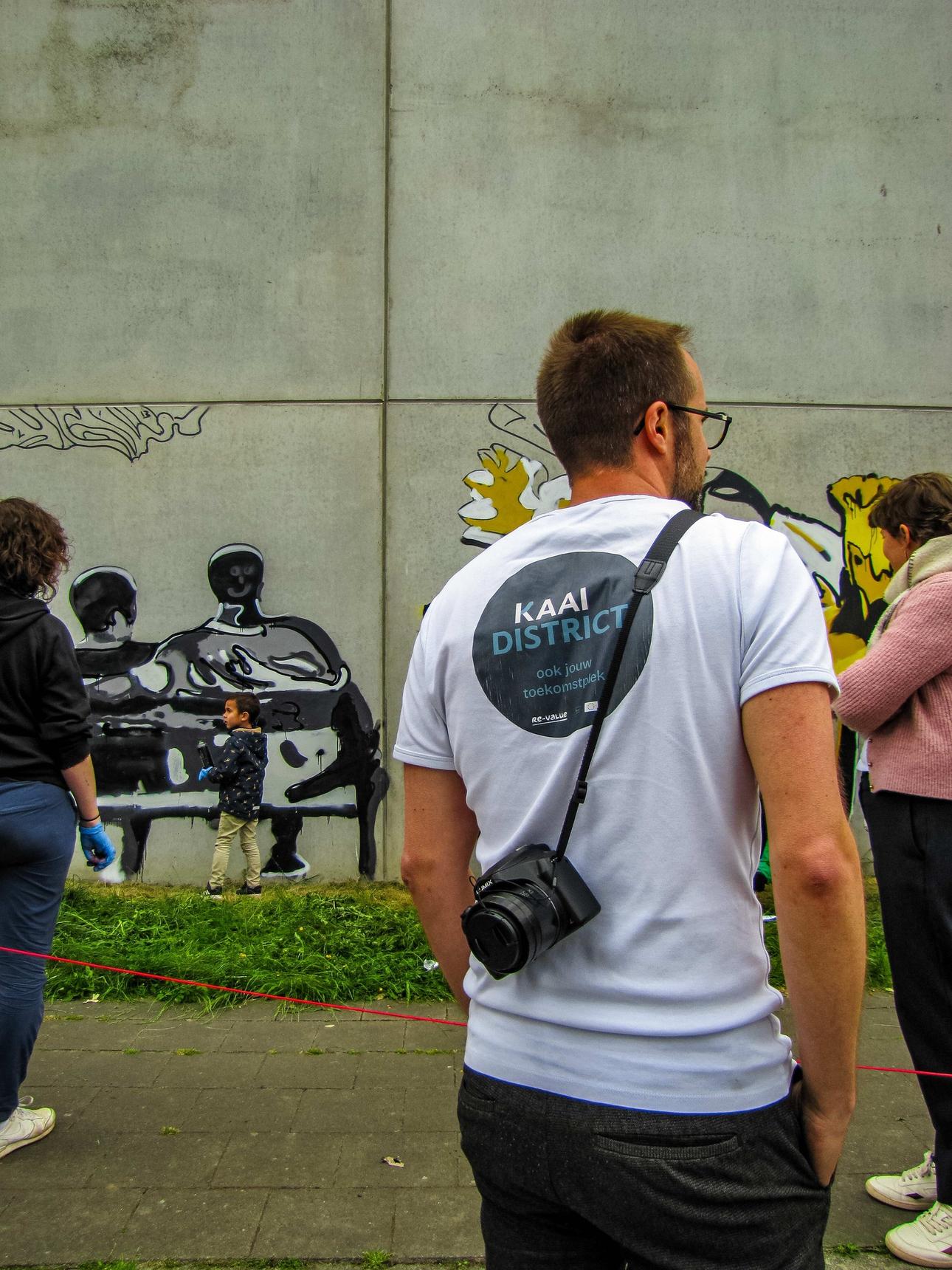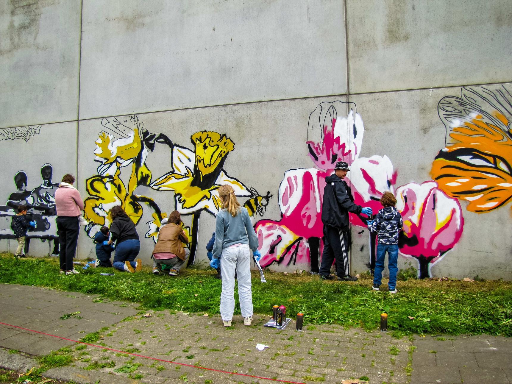 The ideas for this jam were provided by the neighborhood, after which they were further developed by PinkMan_Stuff. Following the Kaaifeest, with considerable assistance from local youth, the wall was completely finished by PinkMan_Stuff. The photos show a mix of the finished wall and the ‘making of’.