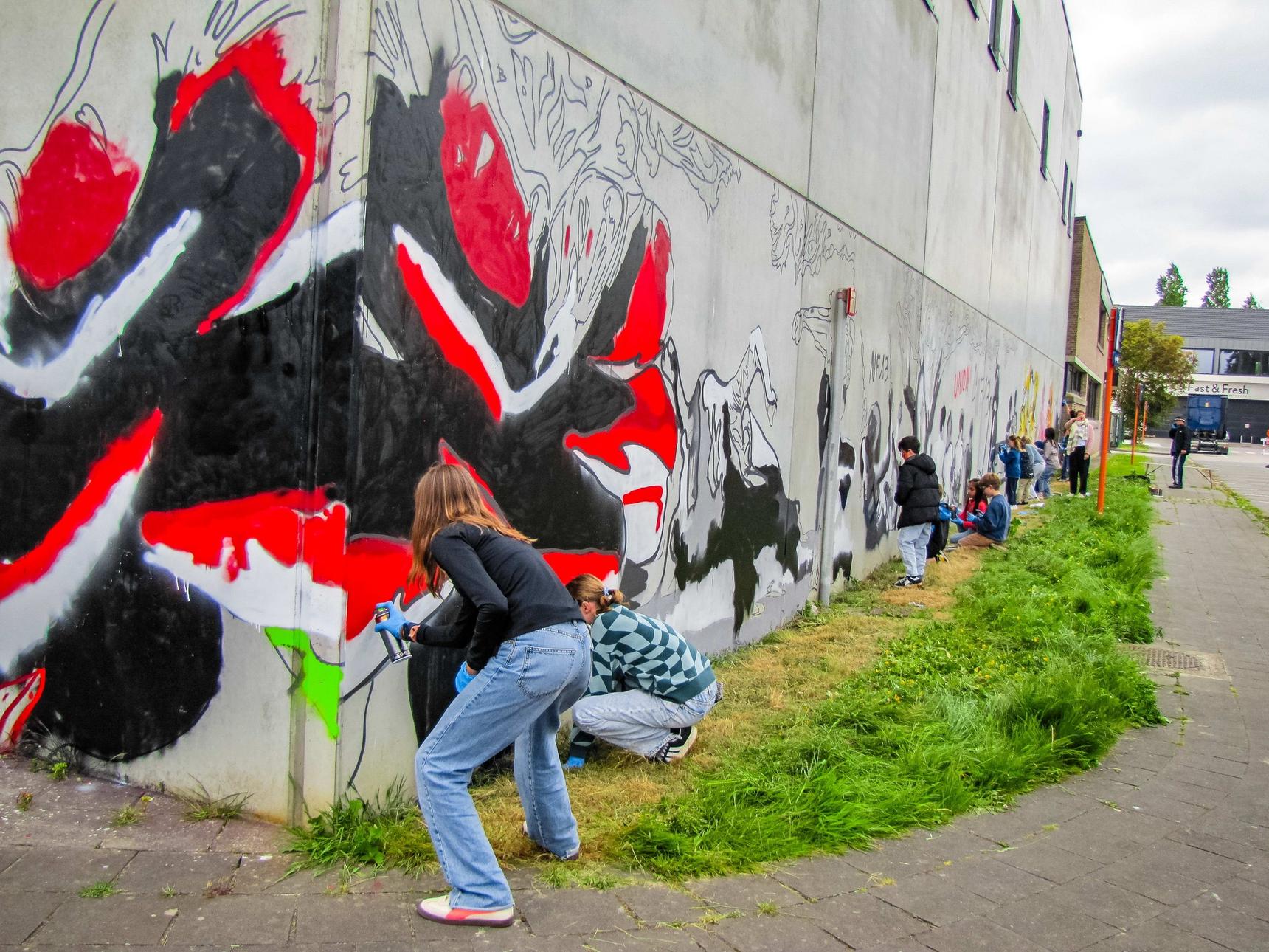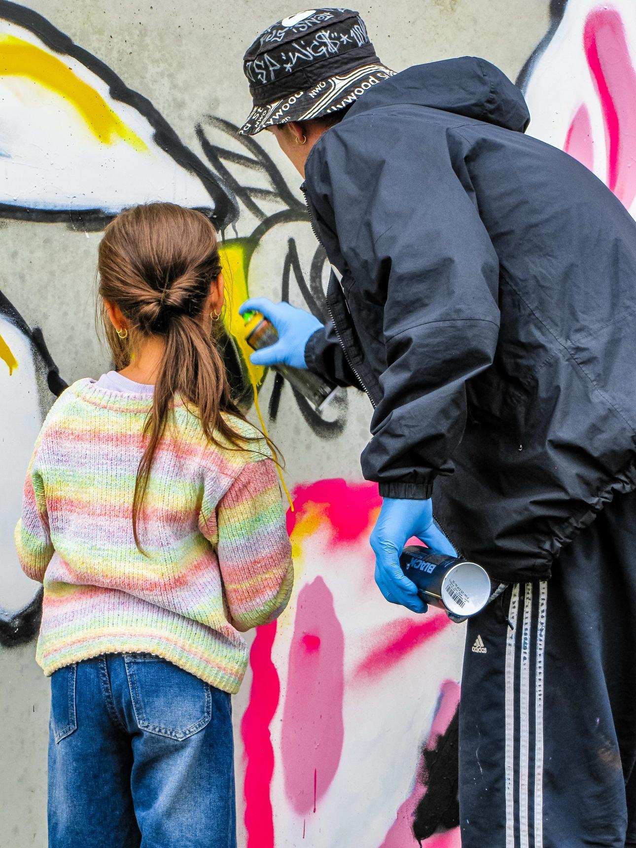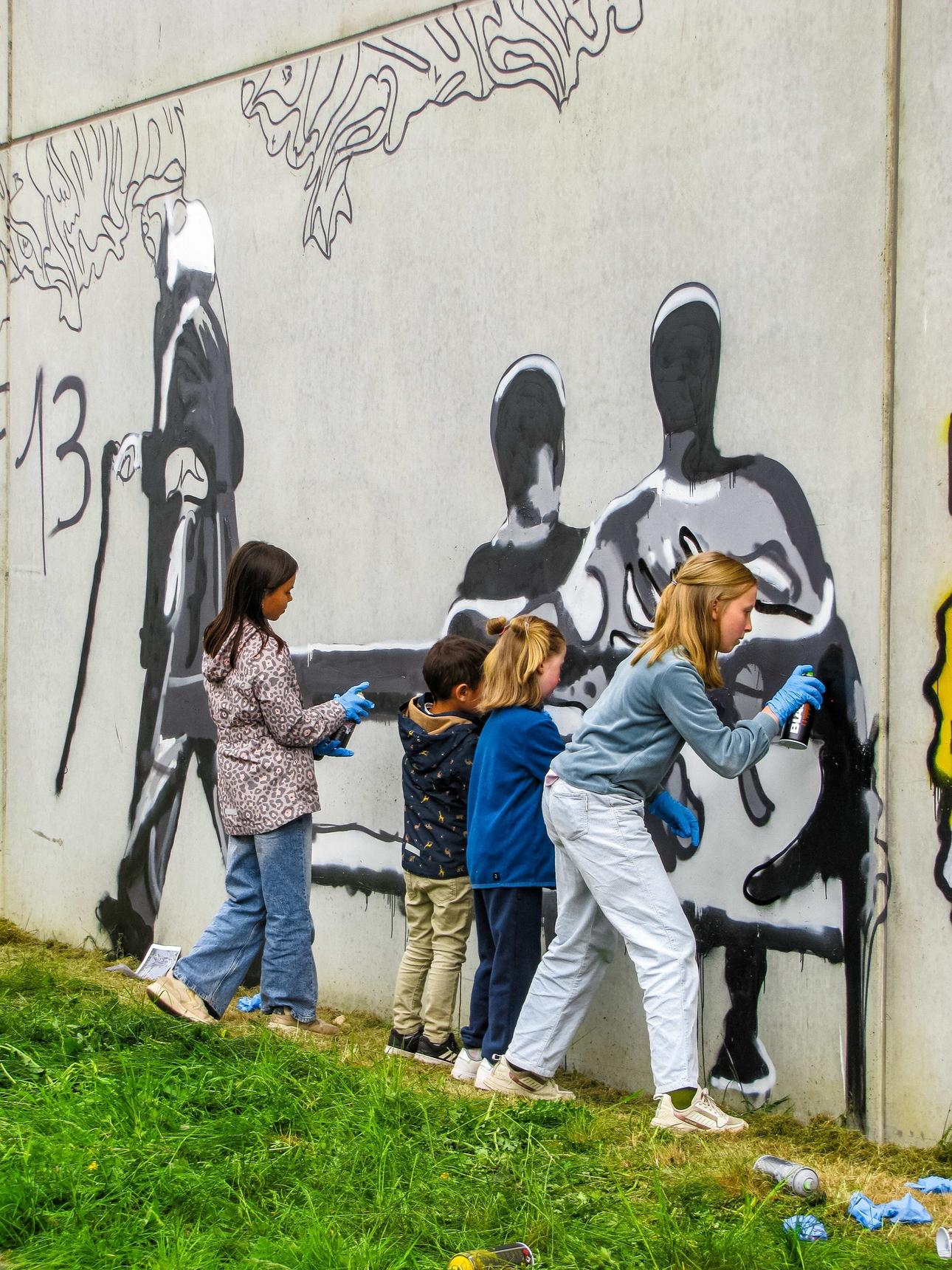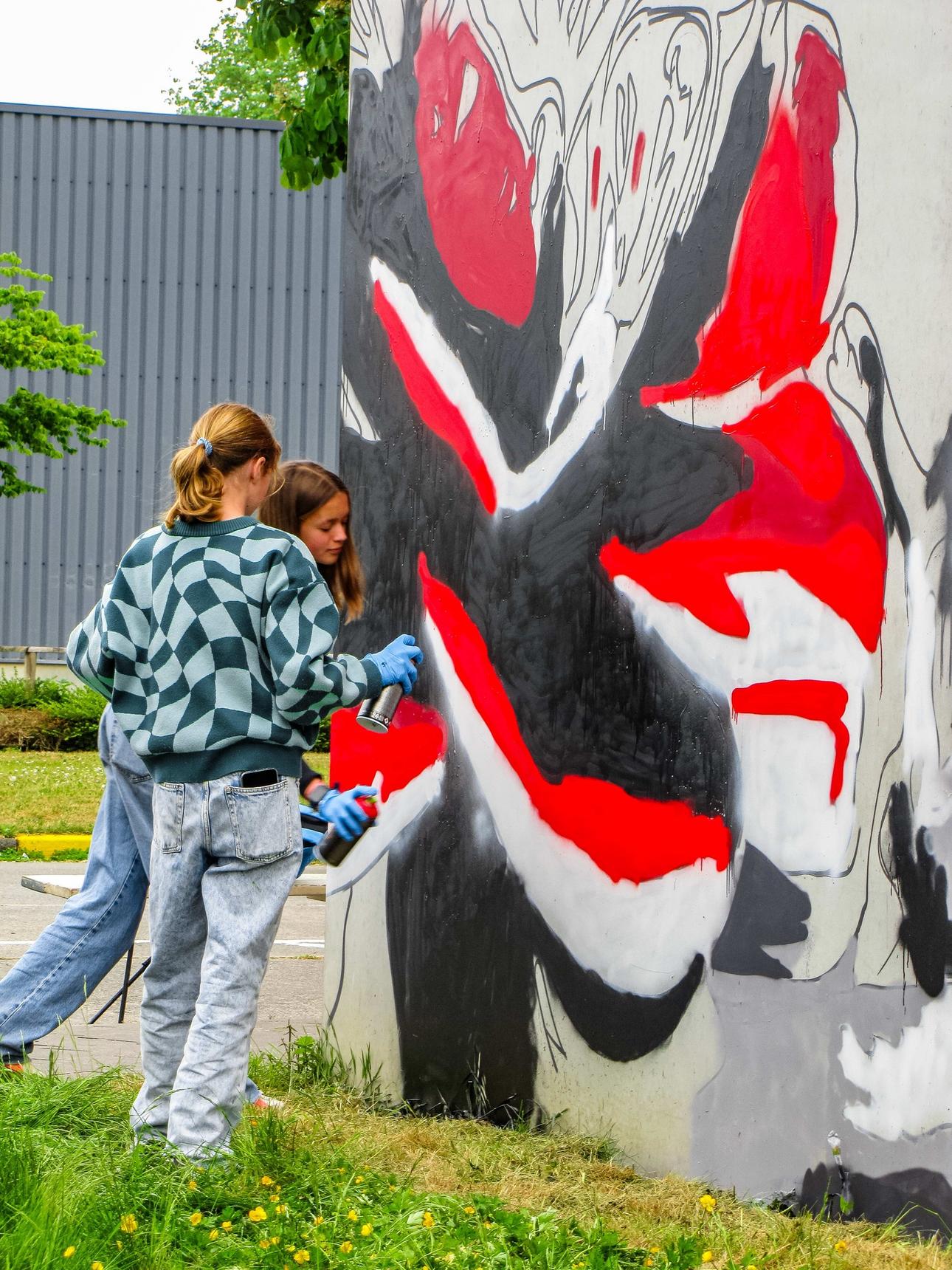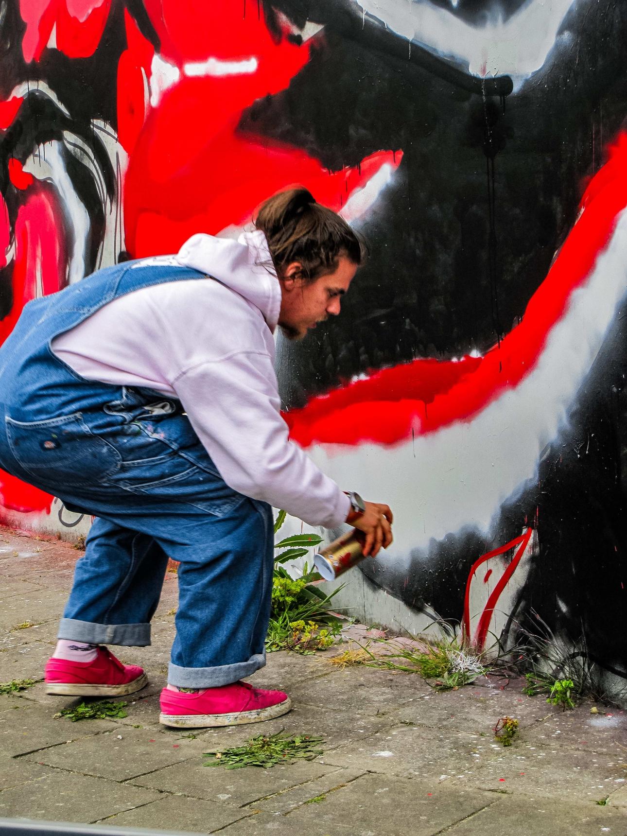 The ideas for this jam were provided by the neighborhood, after which they were further developed by PinkMan_Stuff. Following the Kaaifeest, with considerable assistance from local youth, the wall was completely finished by PinkMan_Stuff. The photos show a mix of the finished wall and the ‘making of’.