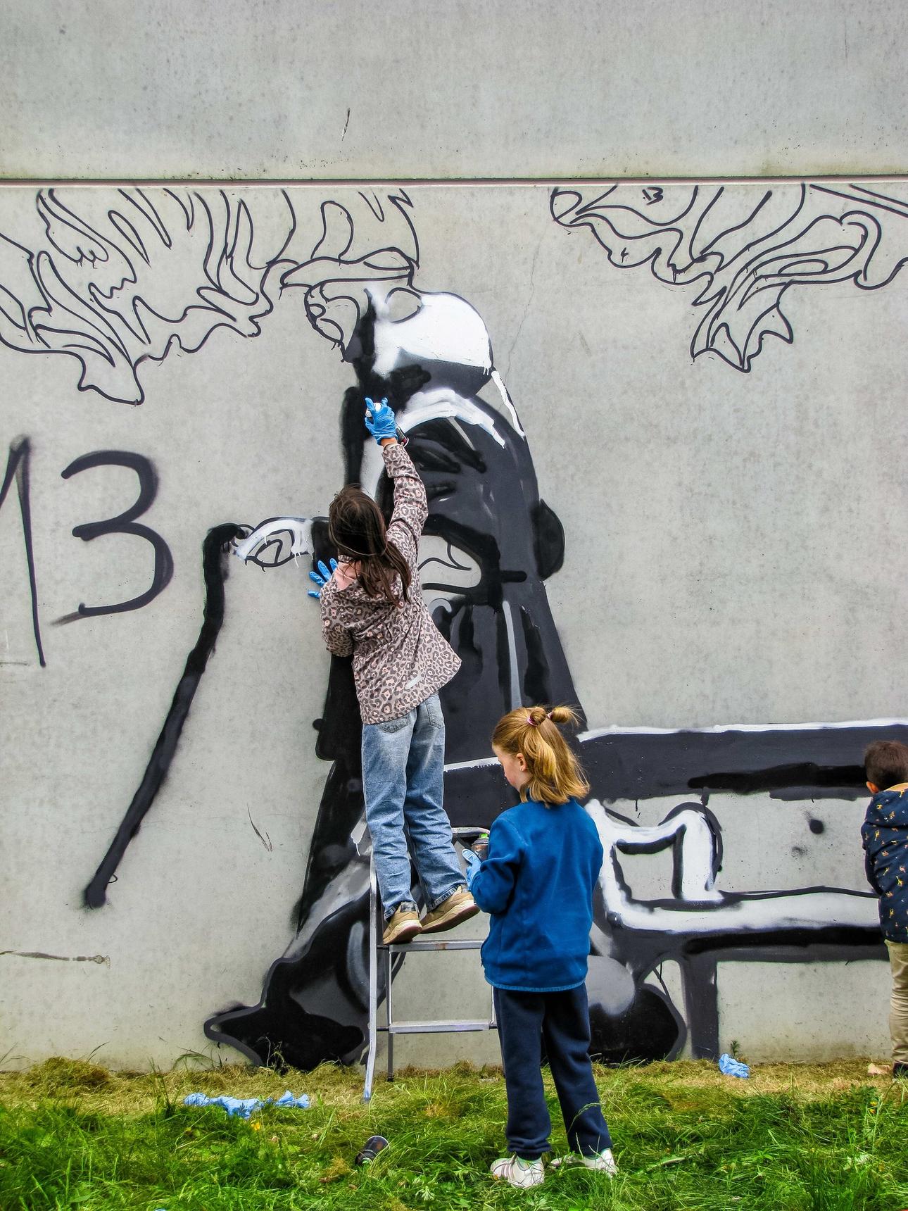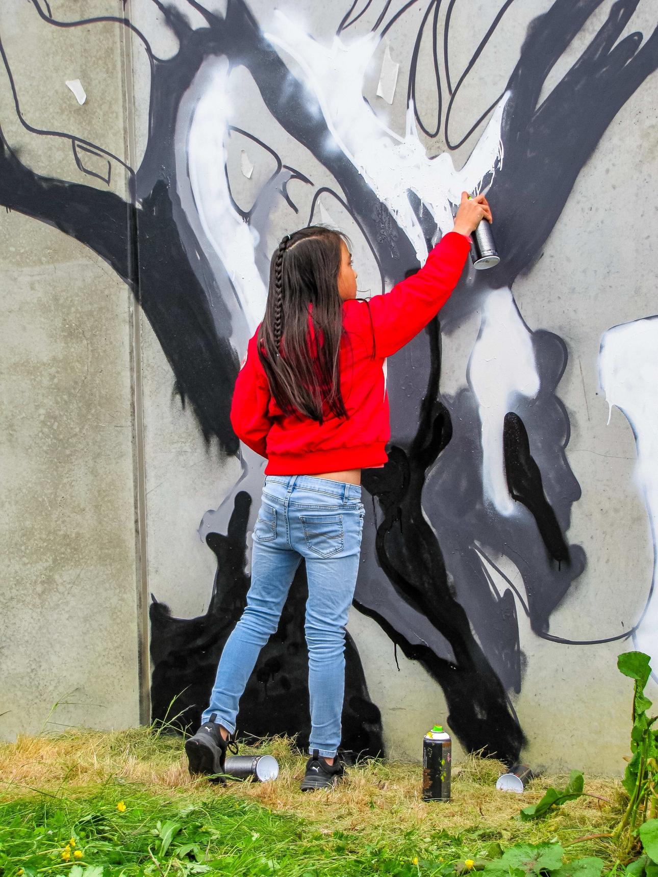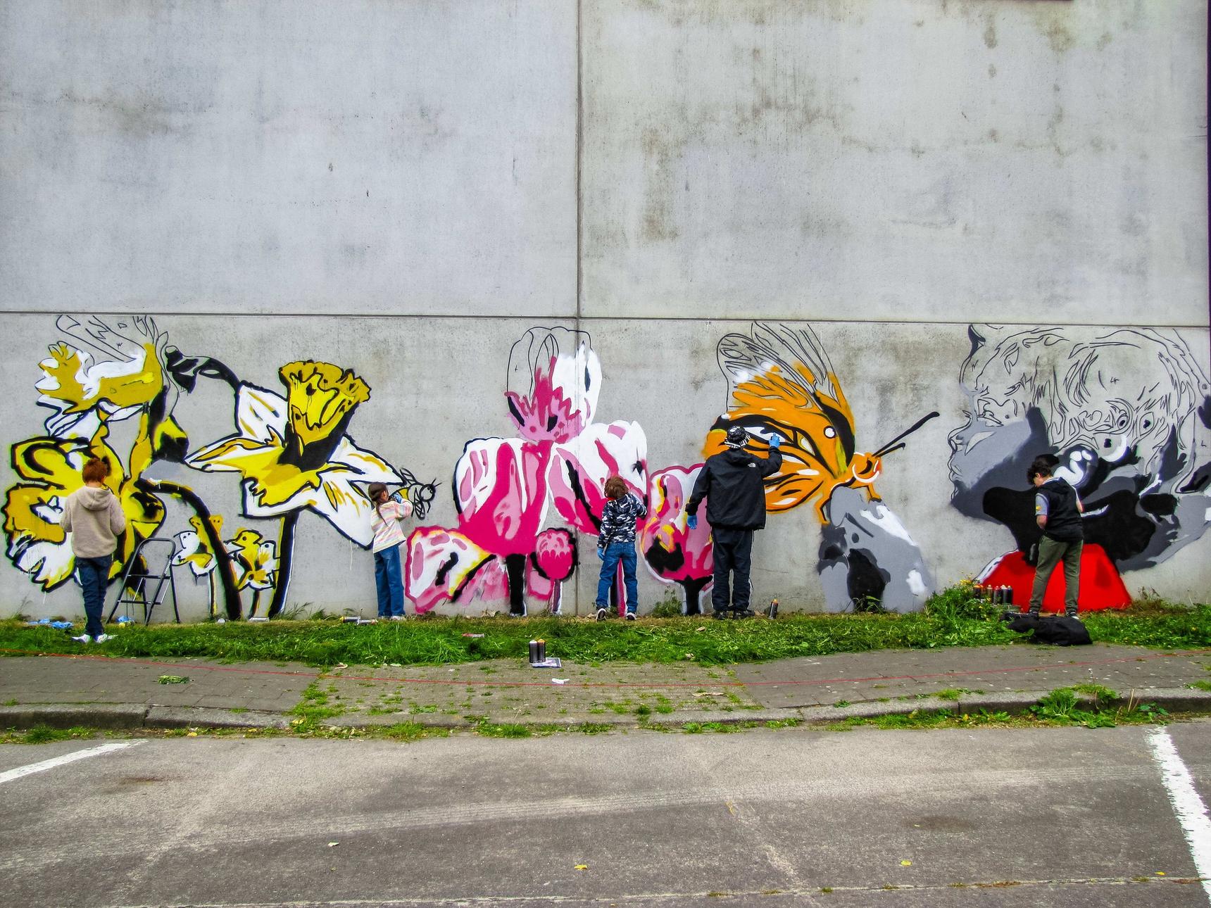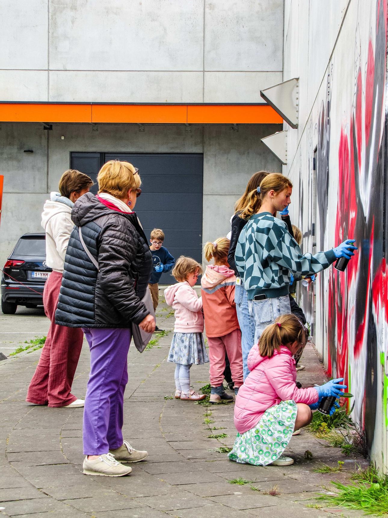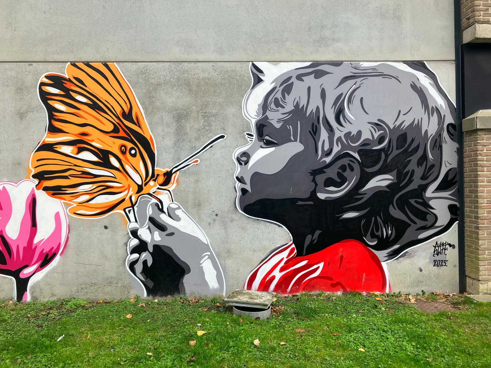 The ideas for this jam were provided by the neighborhood, after which they were further developed by PinkMan_Stuff. Following the Kaaifeest, with considerable assistance from local youth, the wall was completely finished by PinkMan_Stuff. The photos show a mix of the finished wall and the ‘making of’.