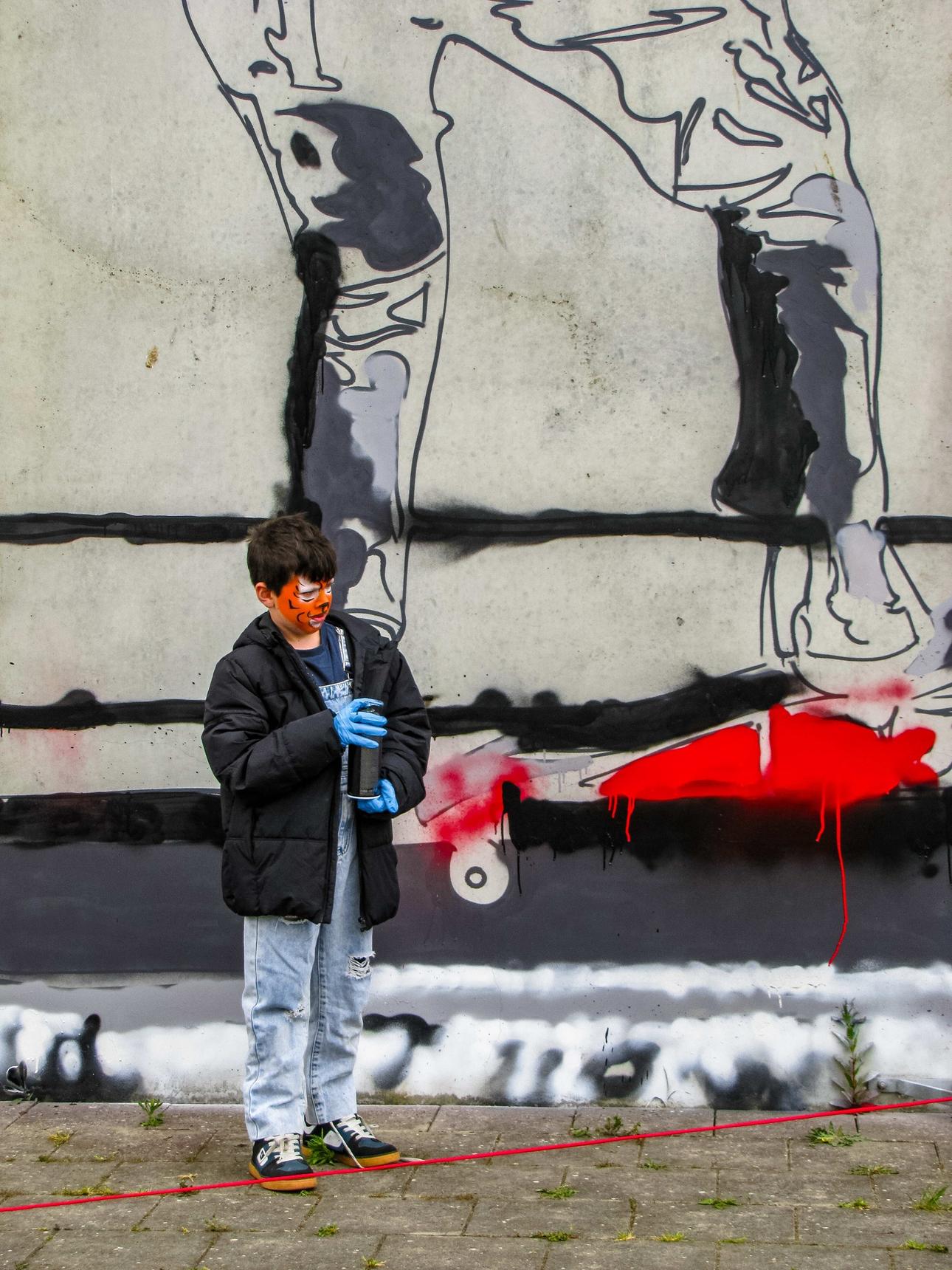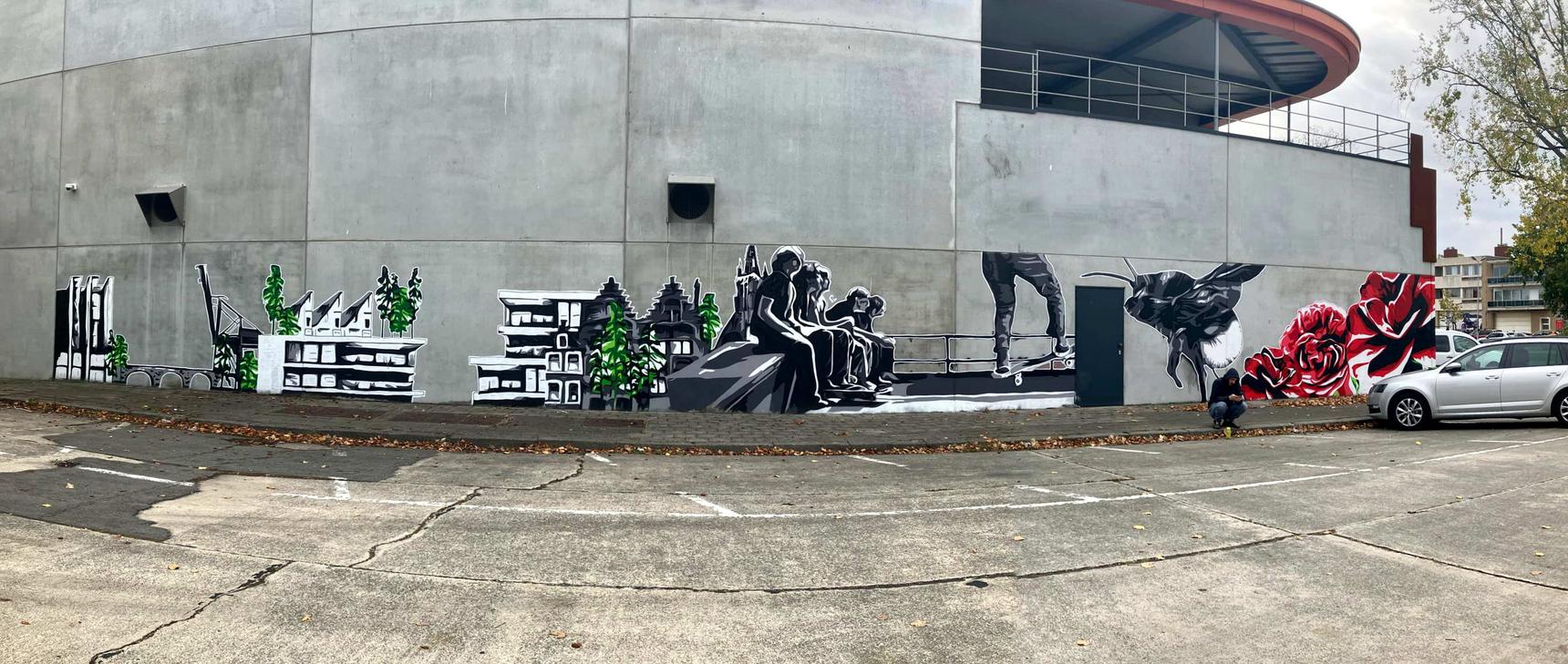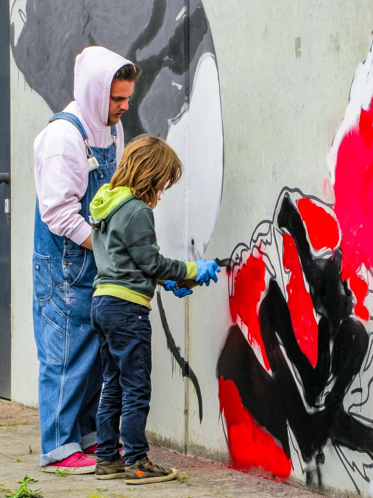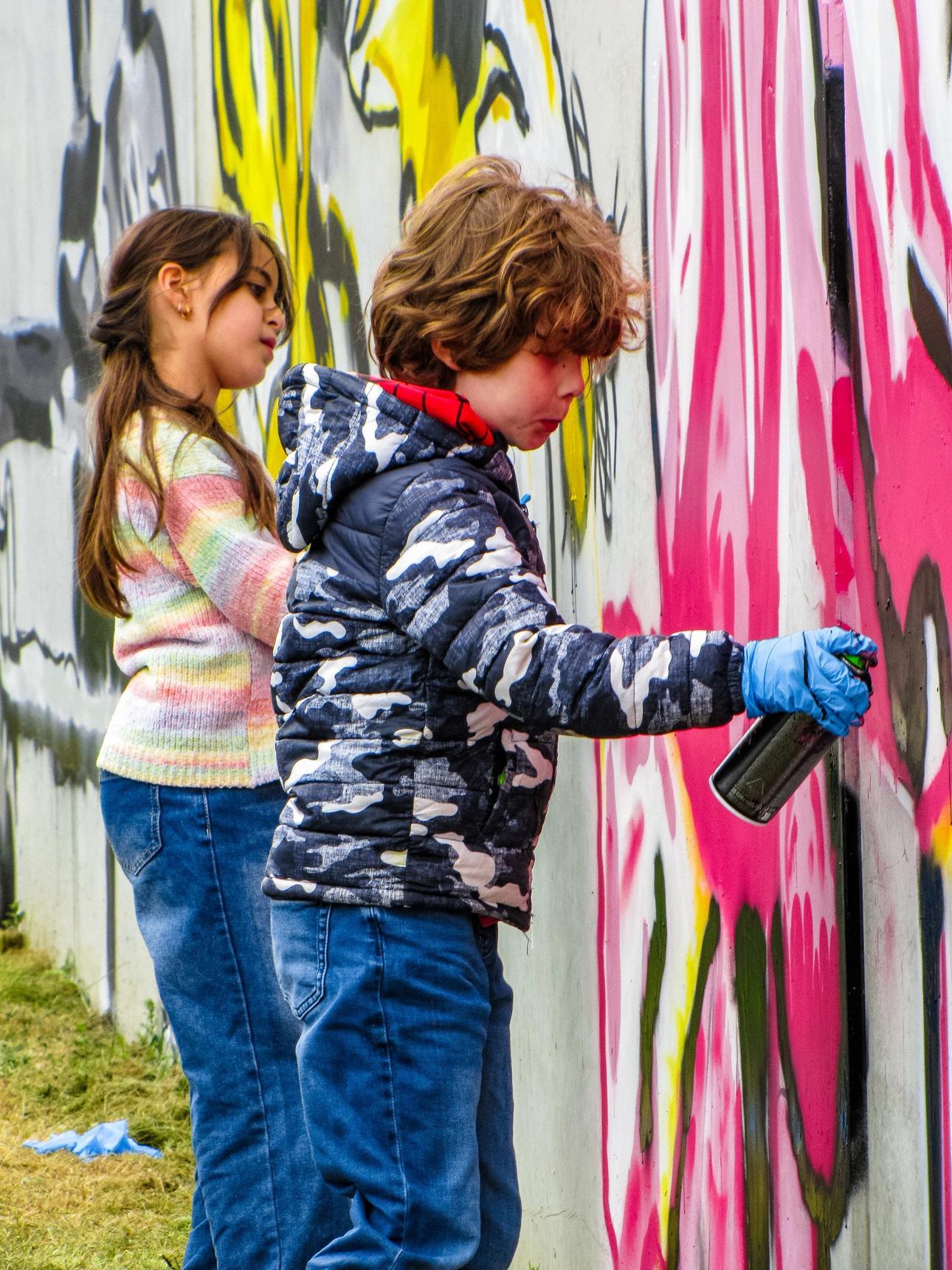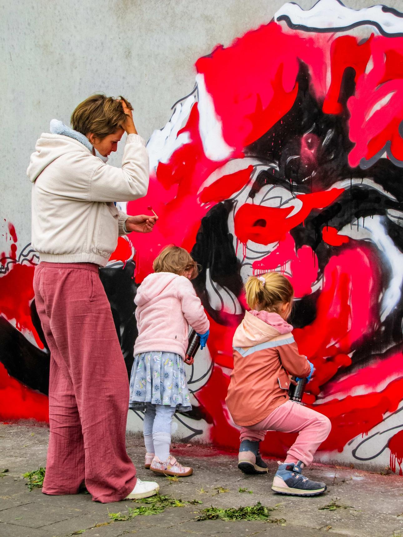 The ideas for this jam were provided by the neighborhood, after which they were further developed by PinkMan_Stuff. Following the Kaaifeest, with considerable assistance from local youth, the wall was completely finished by PinkMan_Stuff. The photos show a mix of the finished wall and the ‘making of’.