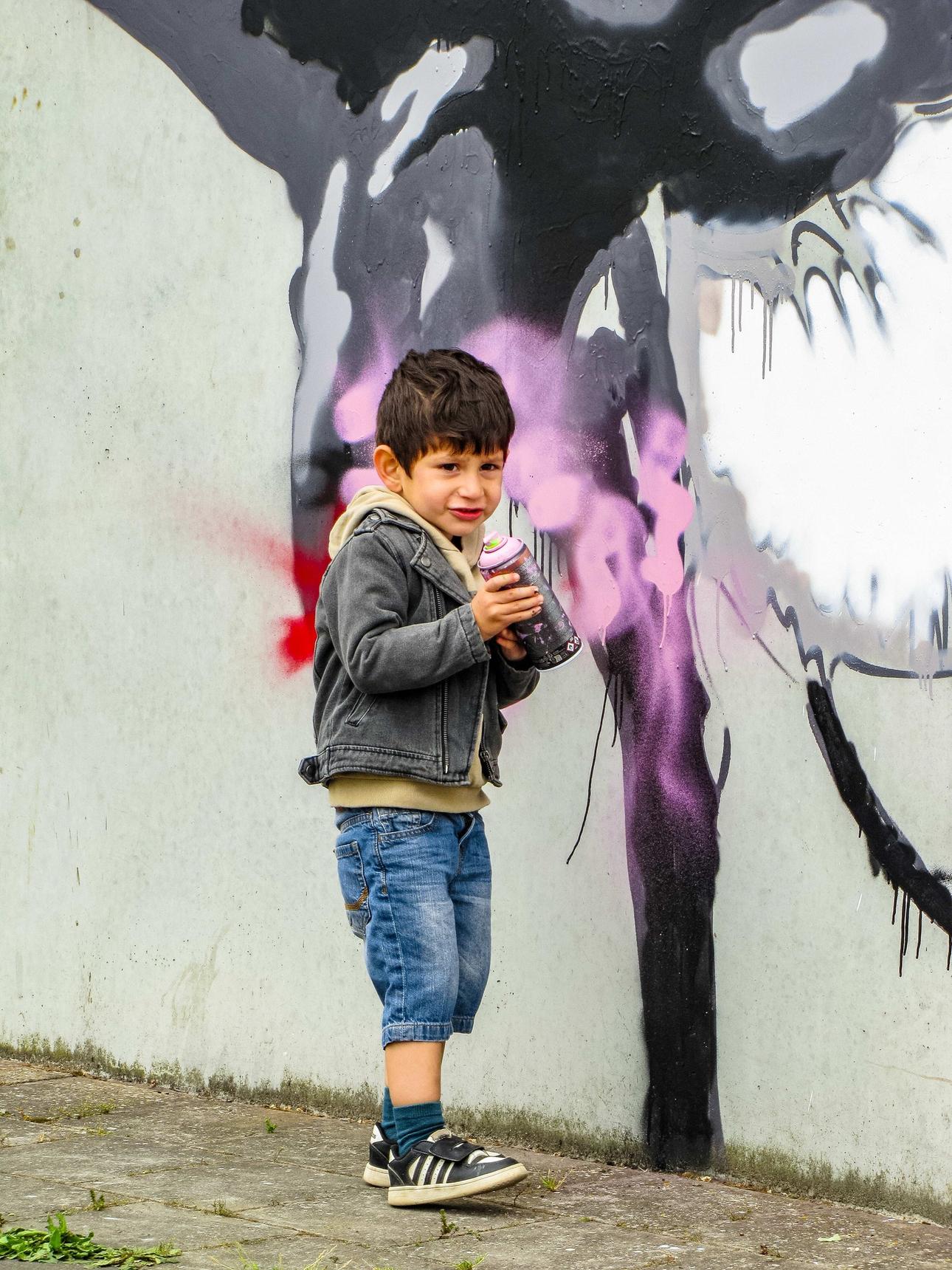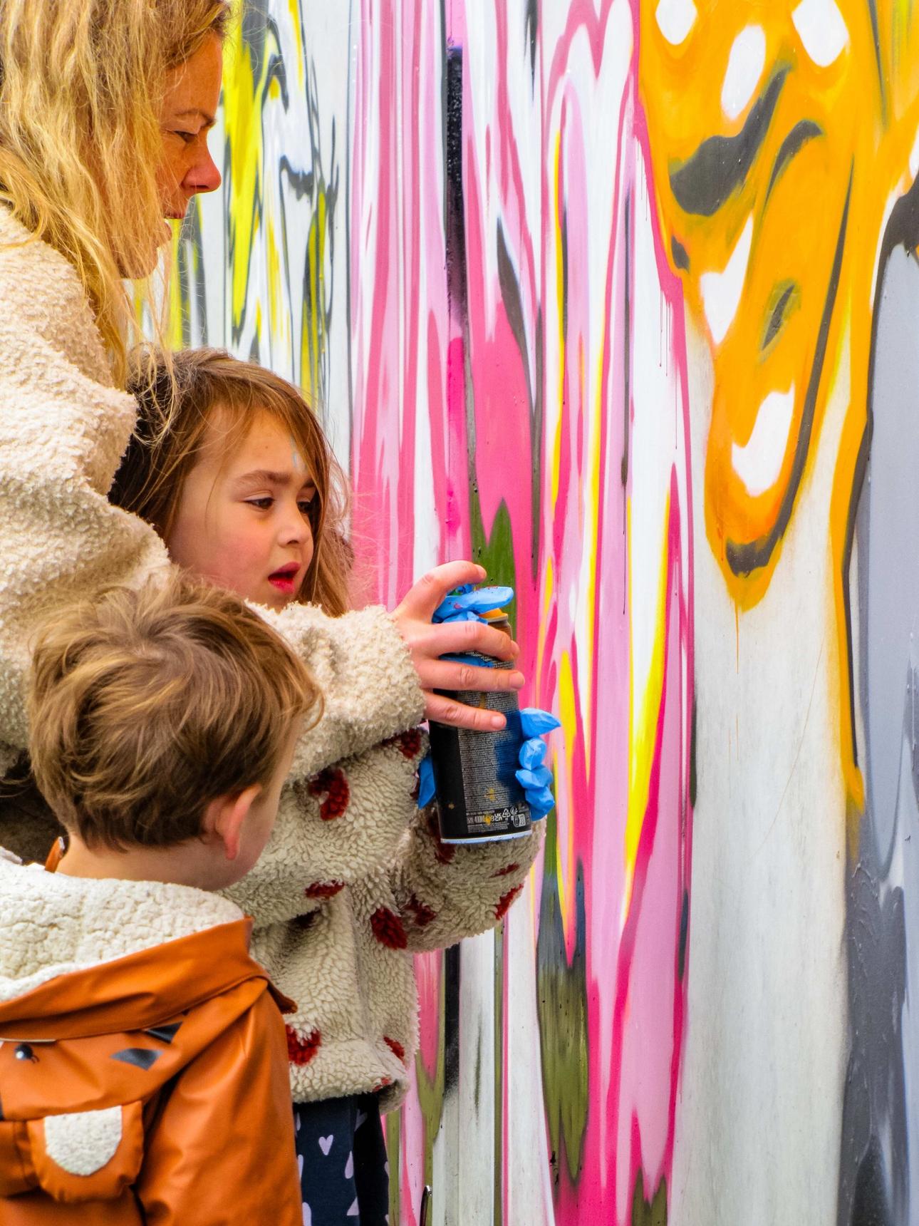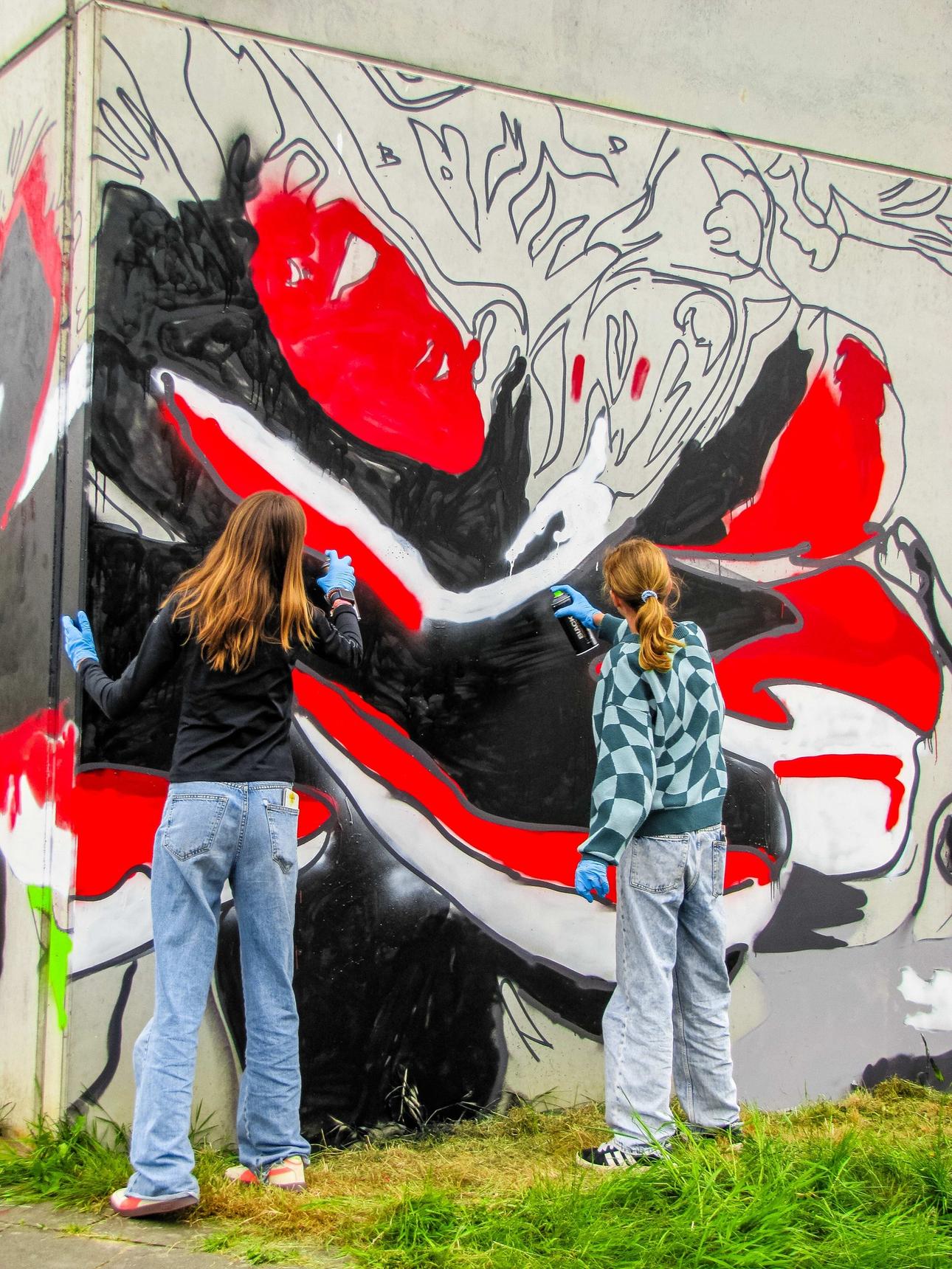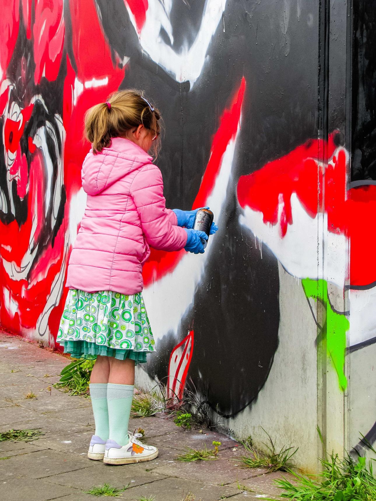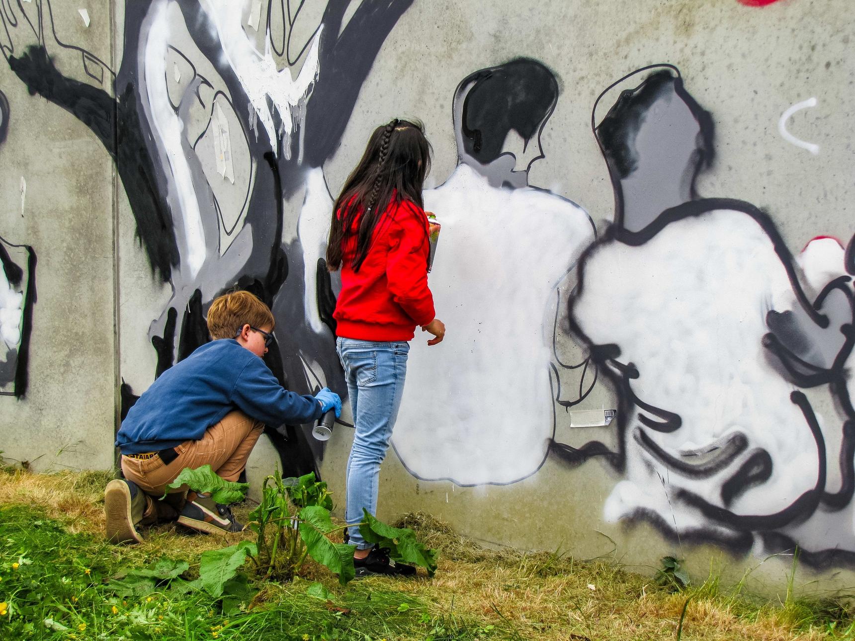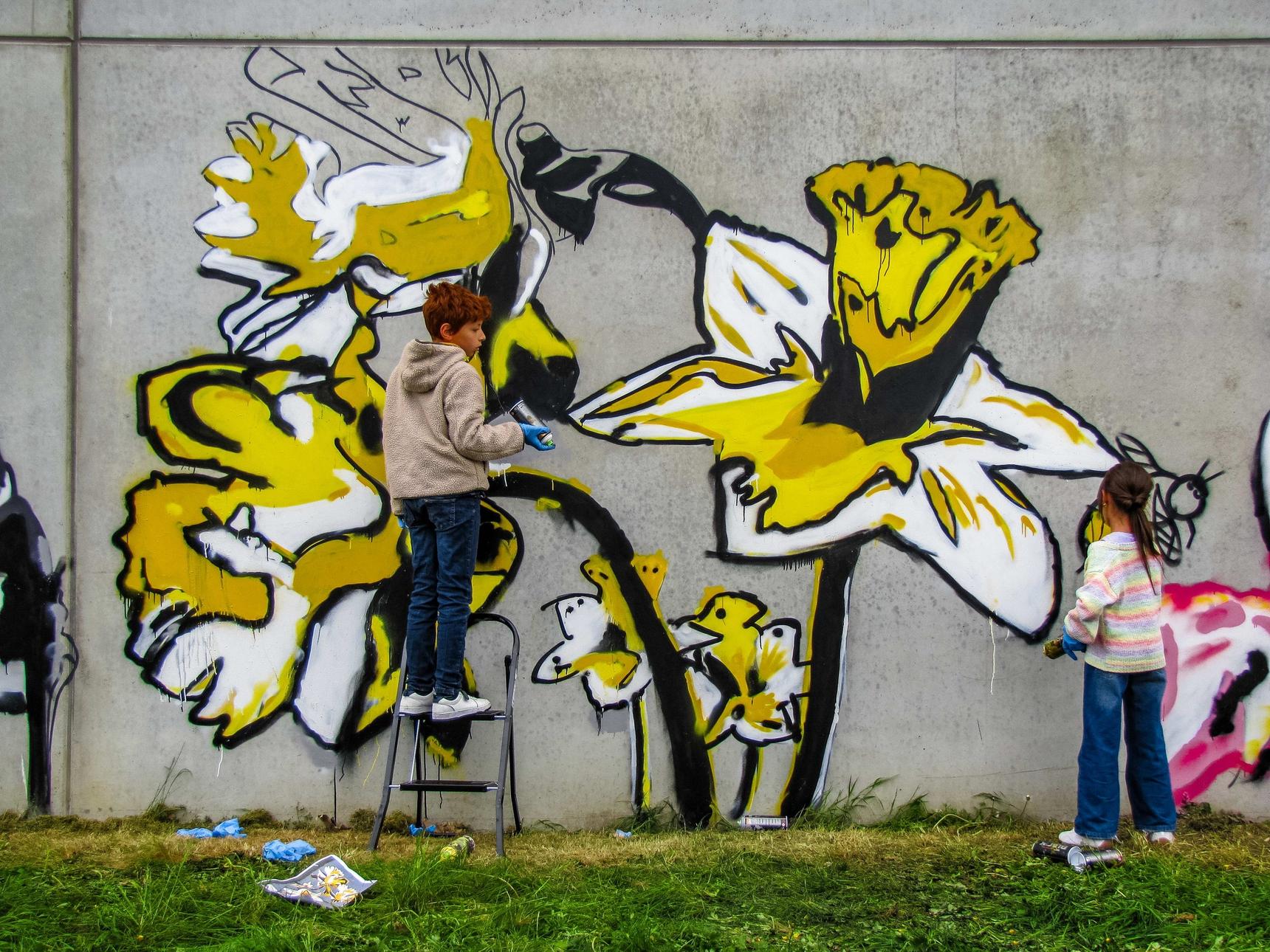The ideas for this jam were provided by the neighborhood, after which they were further developed by PinkMan_Stuff. Following the Kaaifeest, with considerable assistance from local youth, the wall was completely finished by PinkMan_Stuff. The photos show a mix of the finished wall and the ‘making of’.