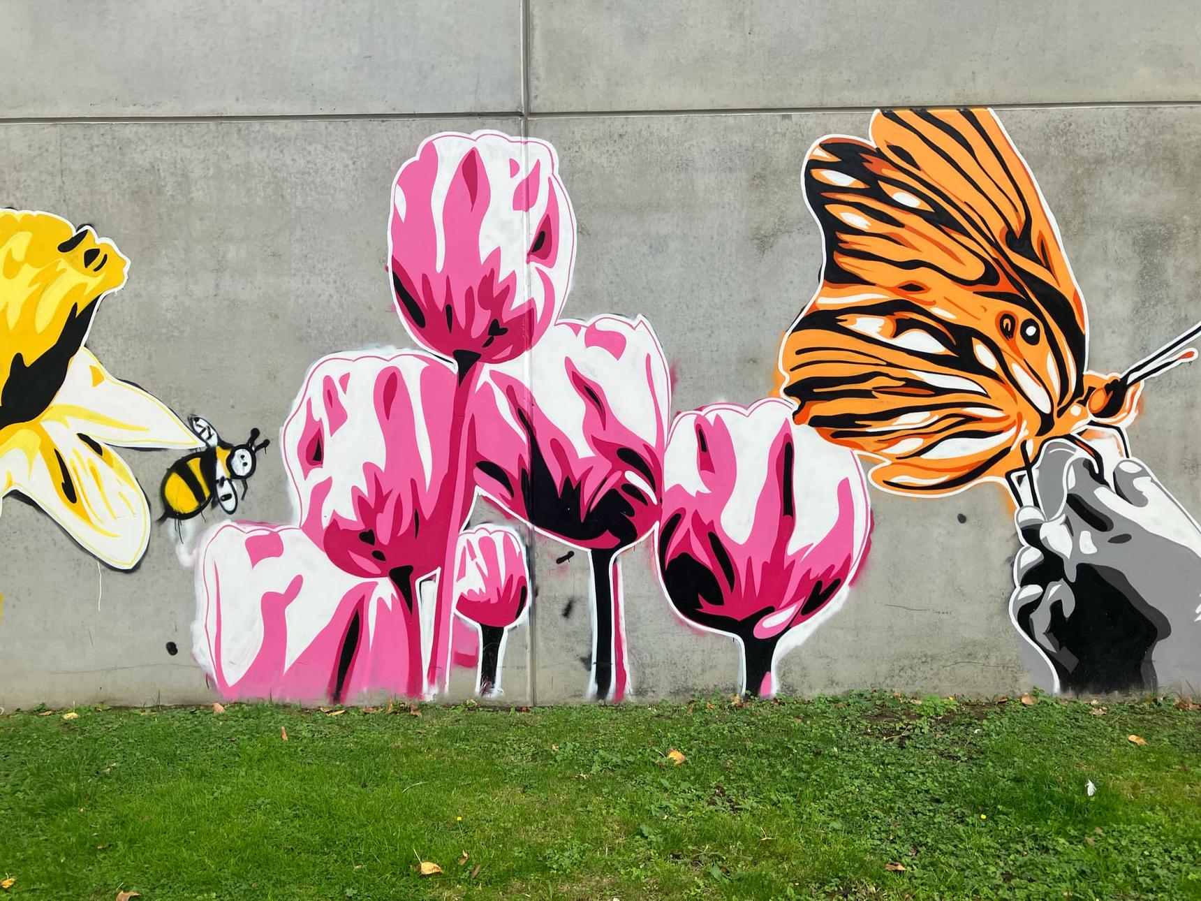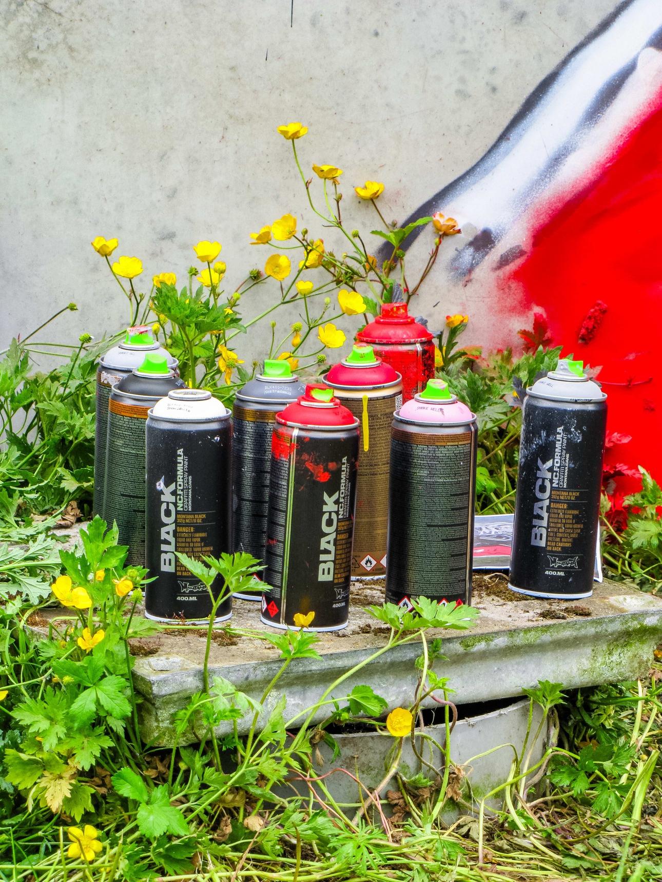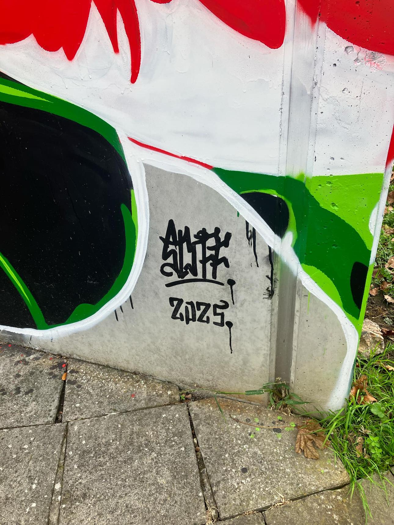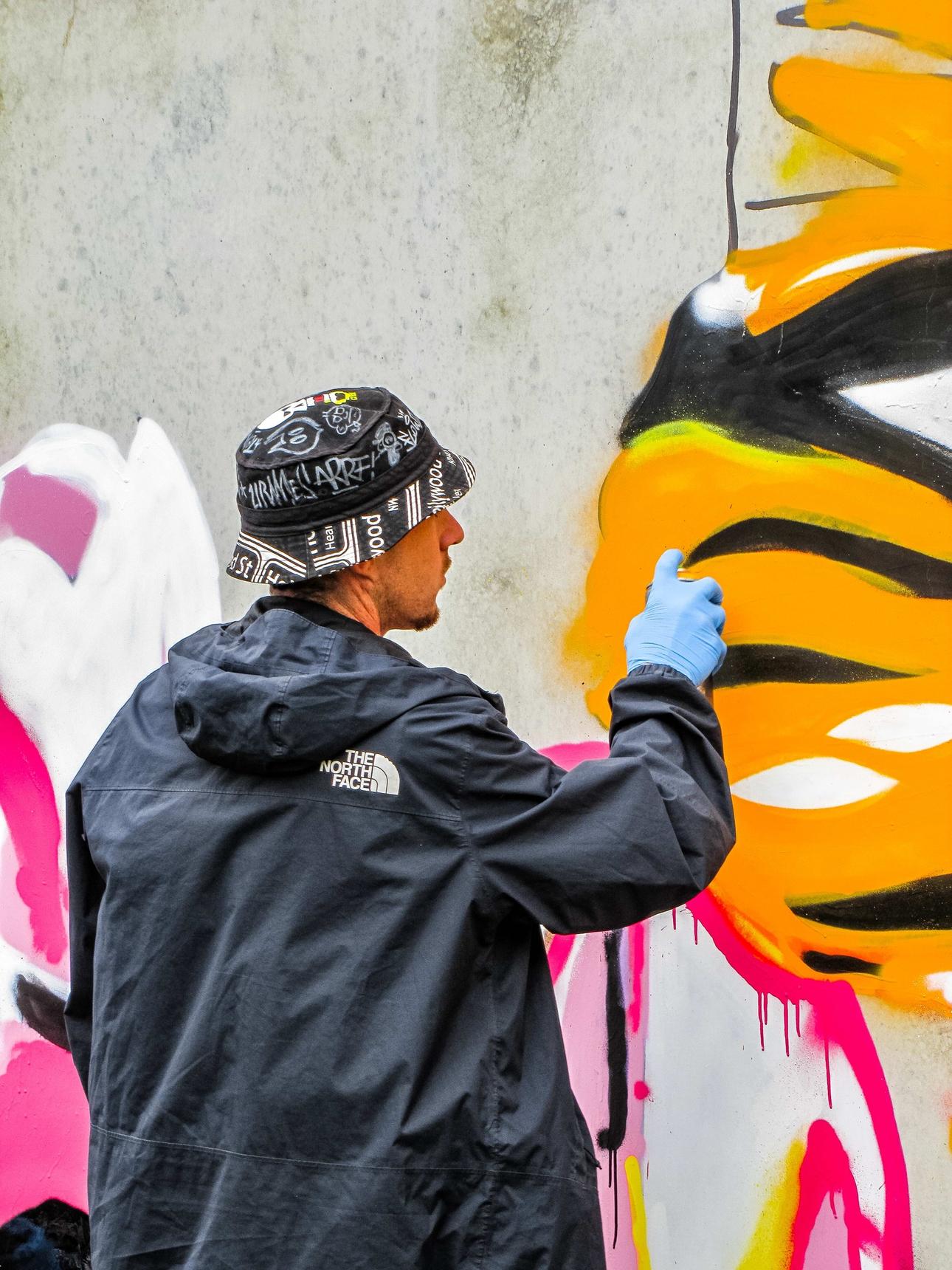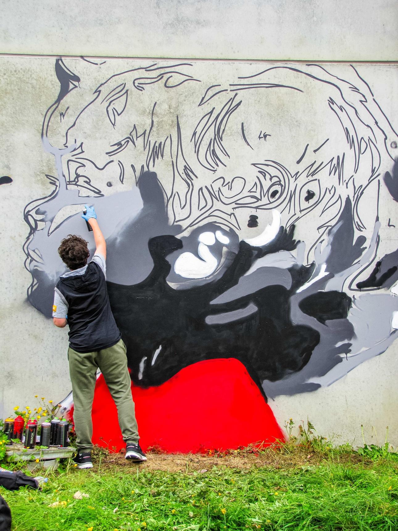 The ideas for this jam were provided by the neighborhood, after which they were further developed by PinkMan_Stuff. Following the Kaaifeest, with considerable assistance from local youth, the wall was completely finished by PinkMan_Stuff. The photos show a mix of the finished wall and the ‘making of’.