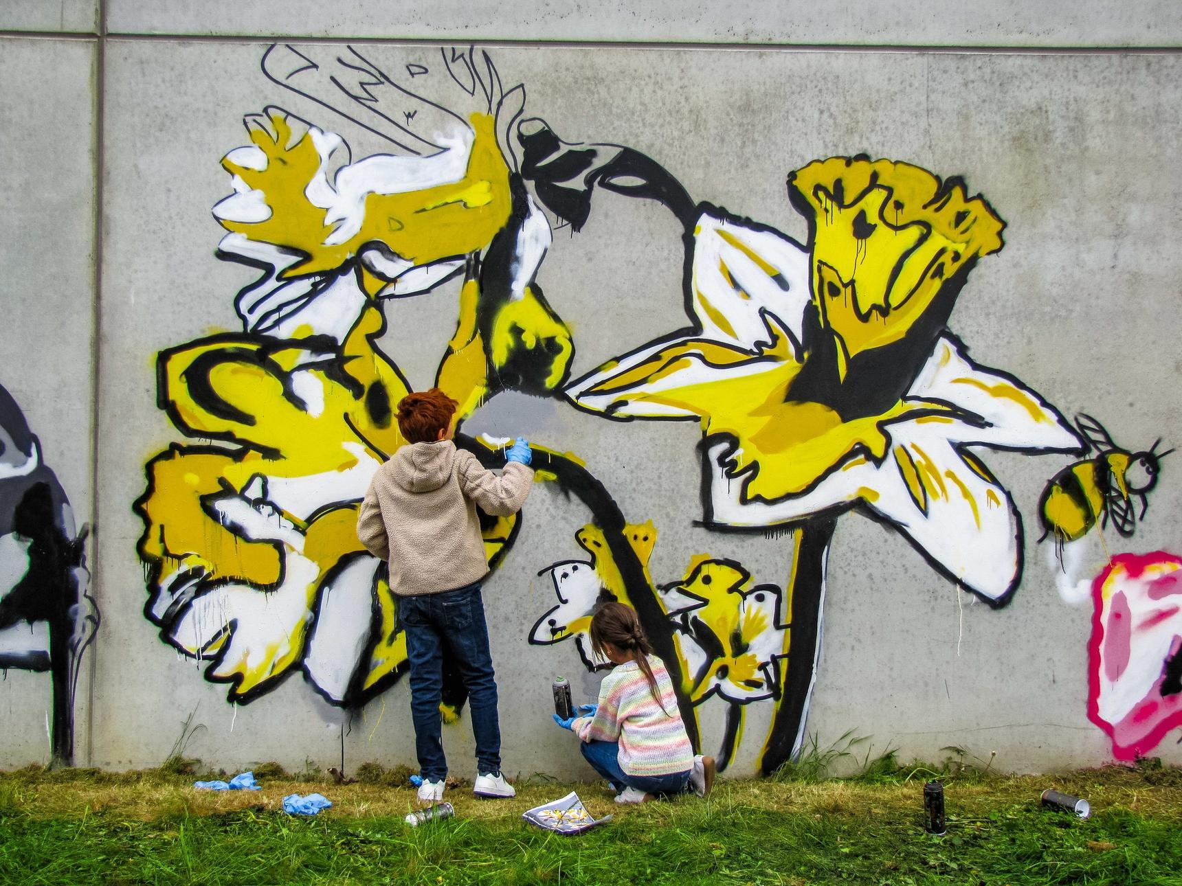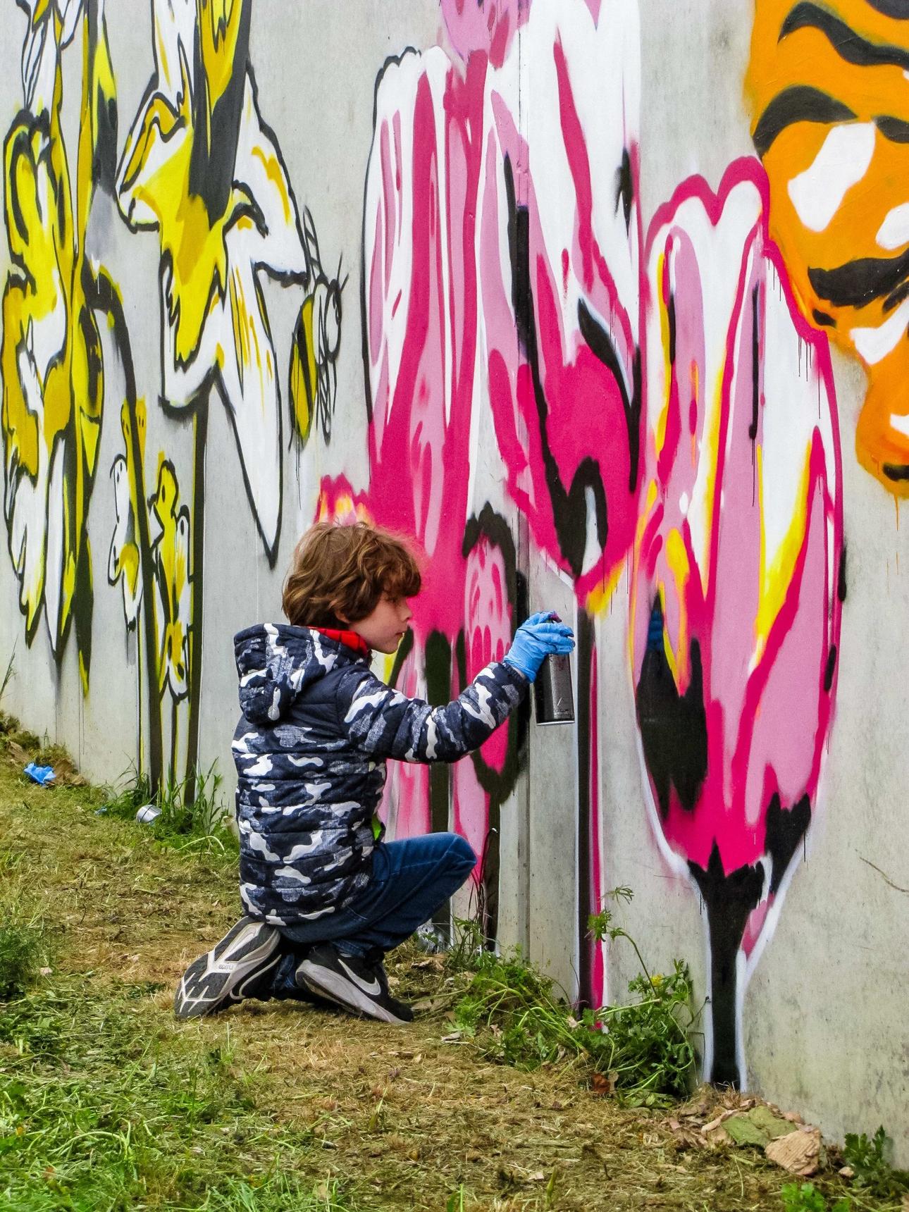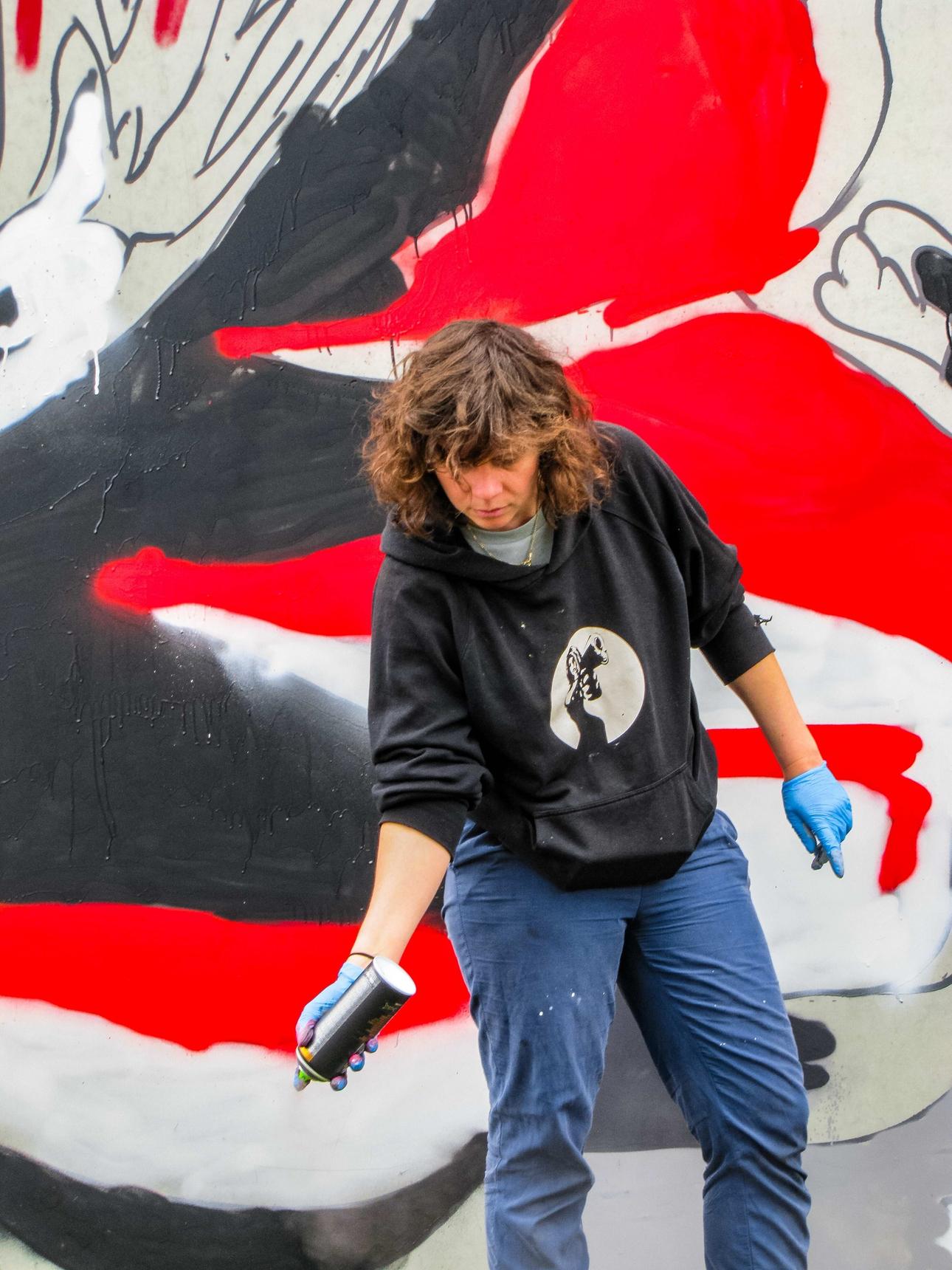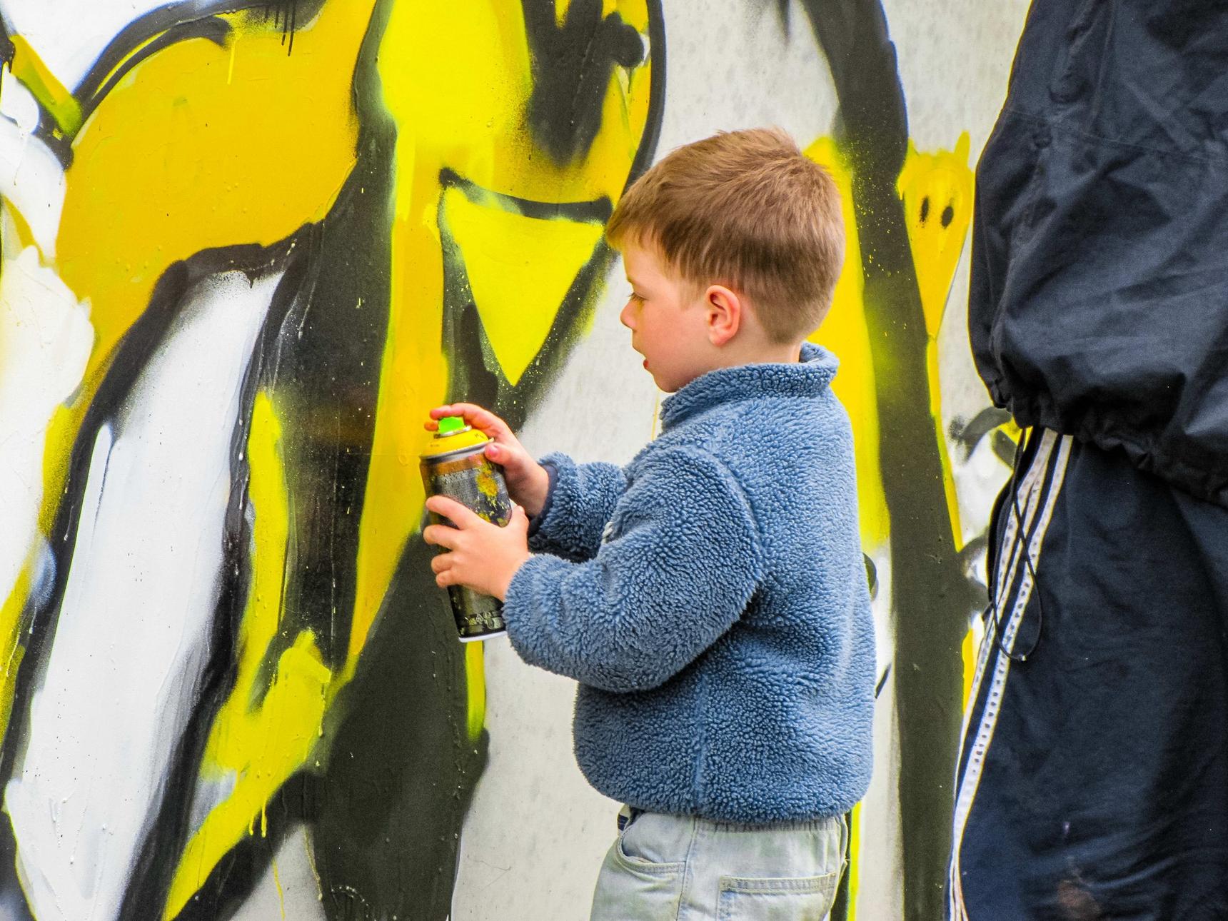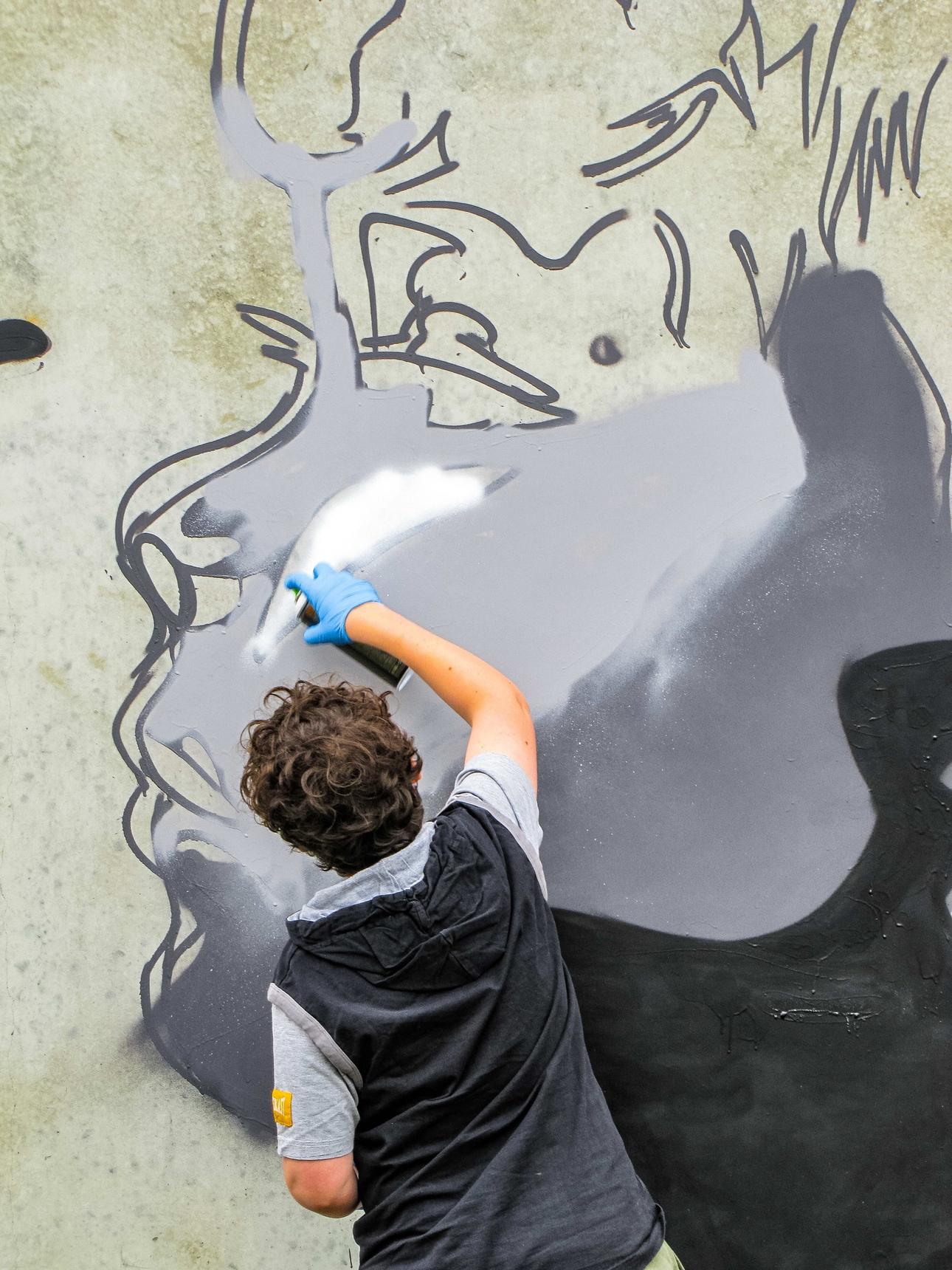 The ideas for this jam were provided by the neighborhood, after which they were further developed by PinkMan_Stuff. Following the Kaaifeest, with considerable assistance from local youth, the wall was completely finished by PinkMan_Stuff. The photos show a mix of the finished wall and the ‘making of’.
