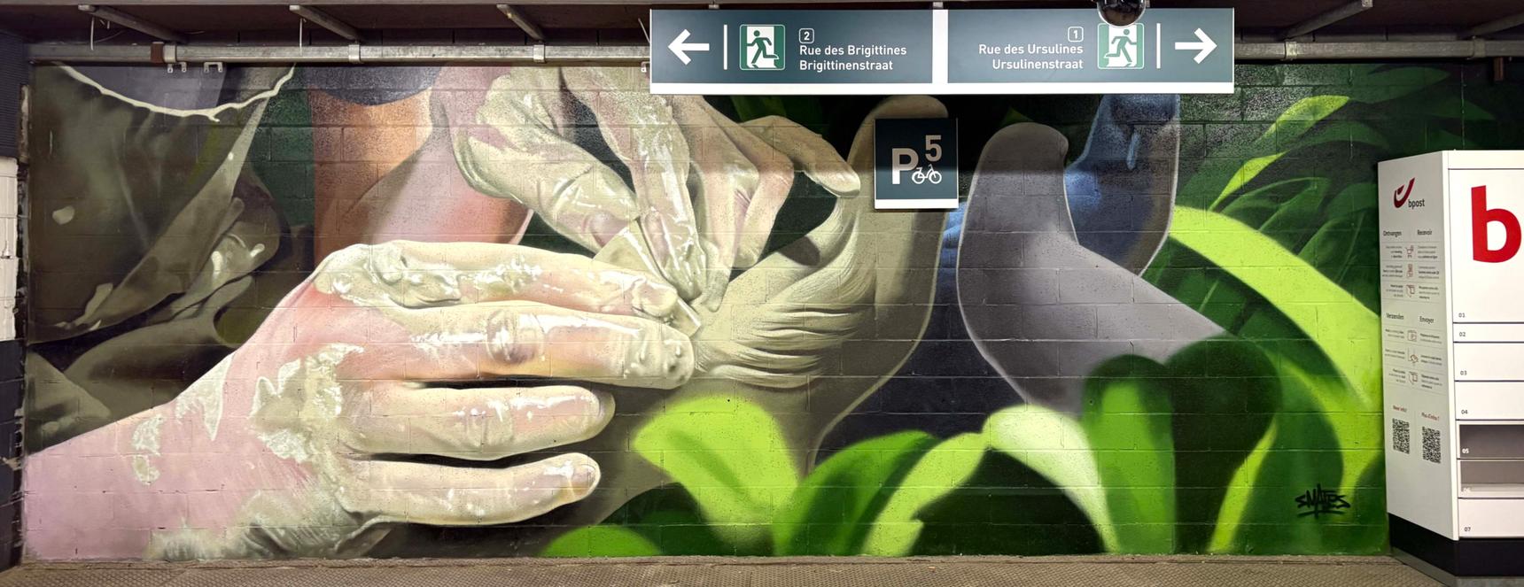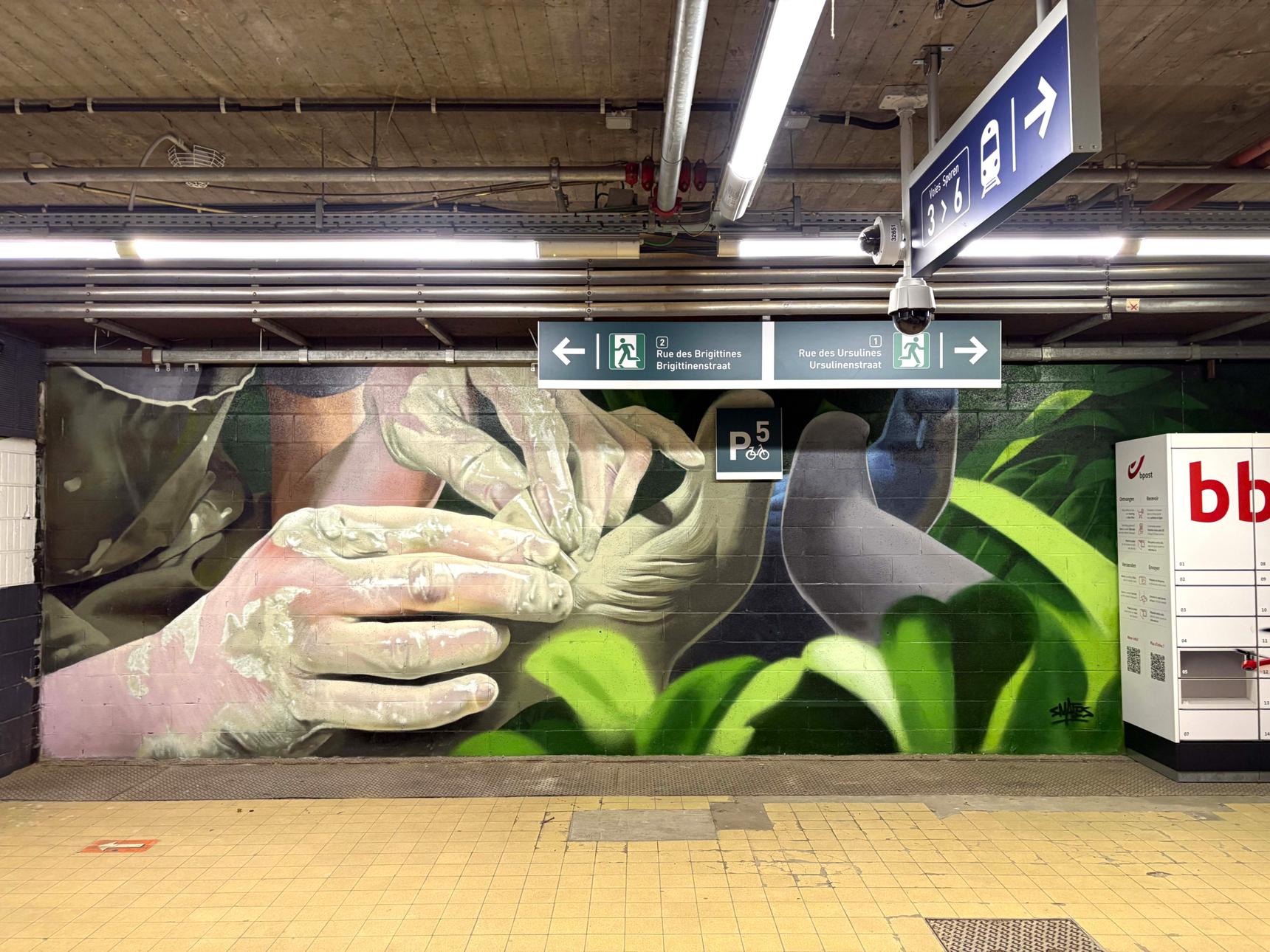 Mural by Smates commissioned by NMBS at Brussels-Kapellekerk station. The artist collaborated with Atelier La Chapelle for this project.