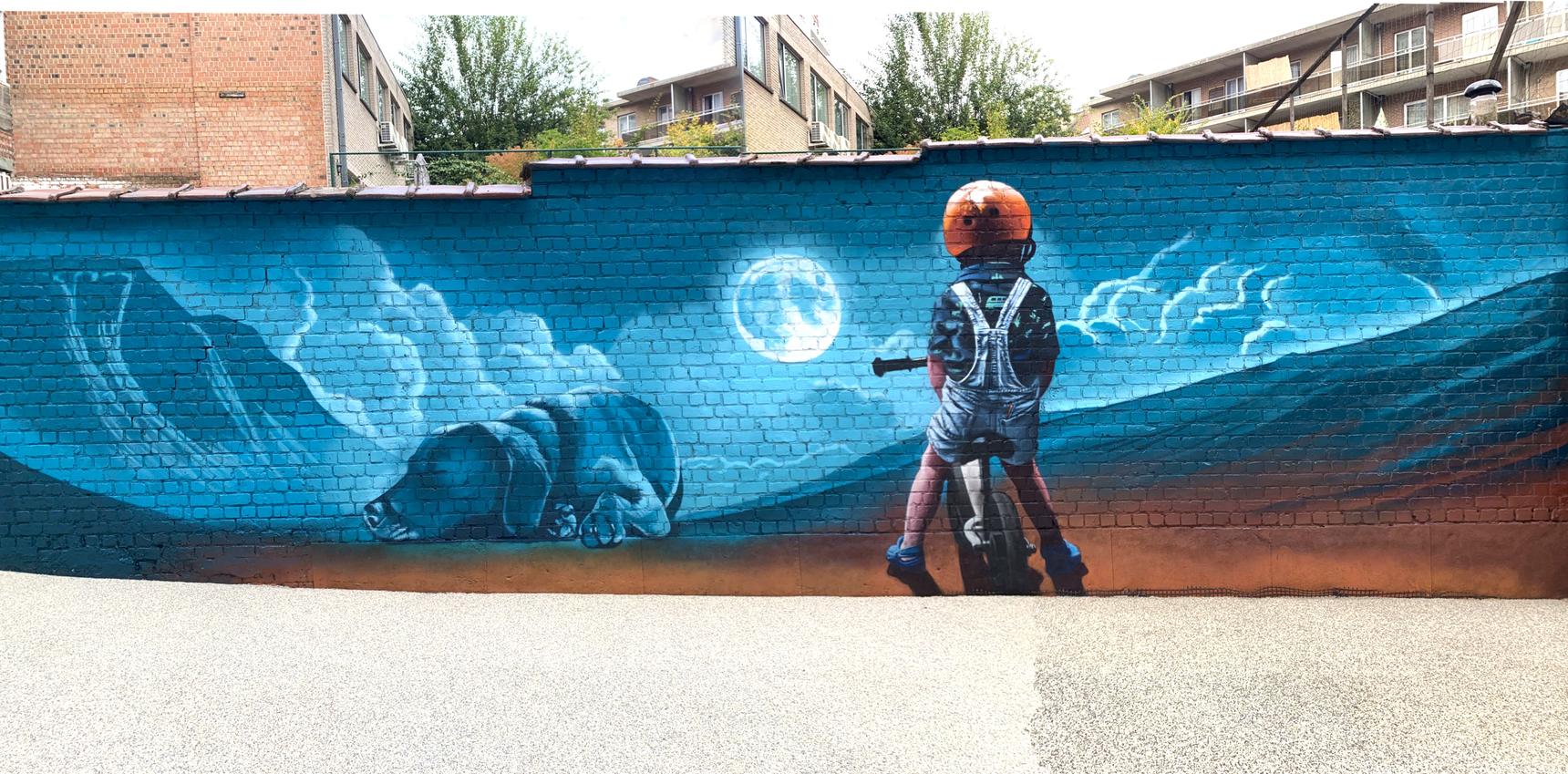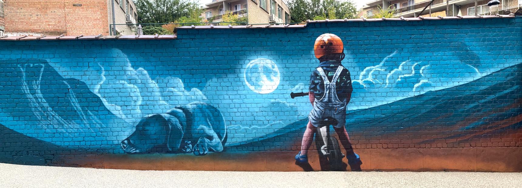Muurschildering van Smates aan basisschool Regina Pacis Campus Pioenen.