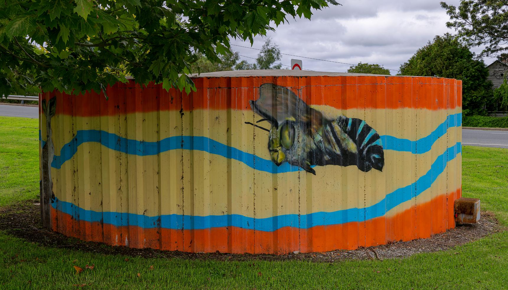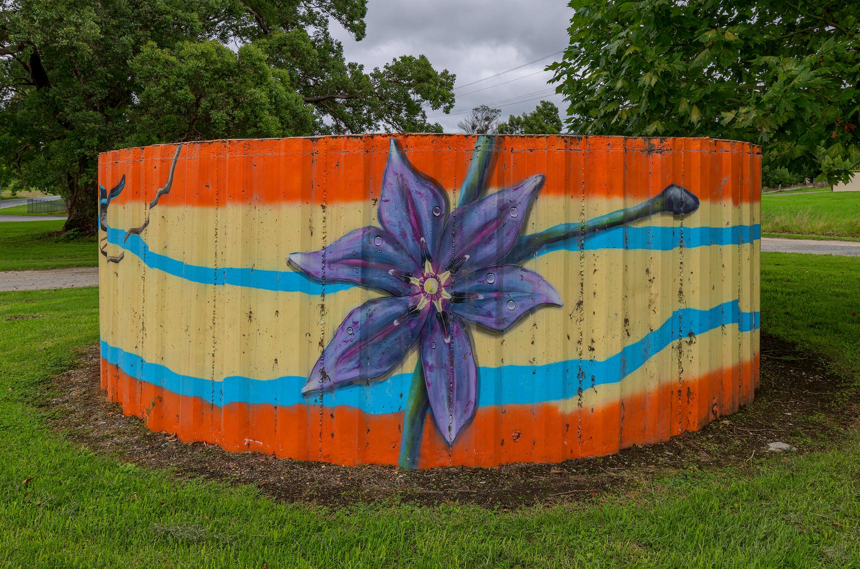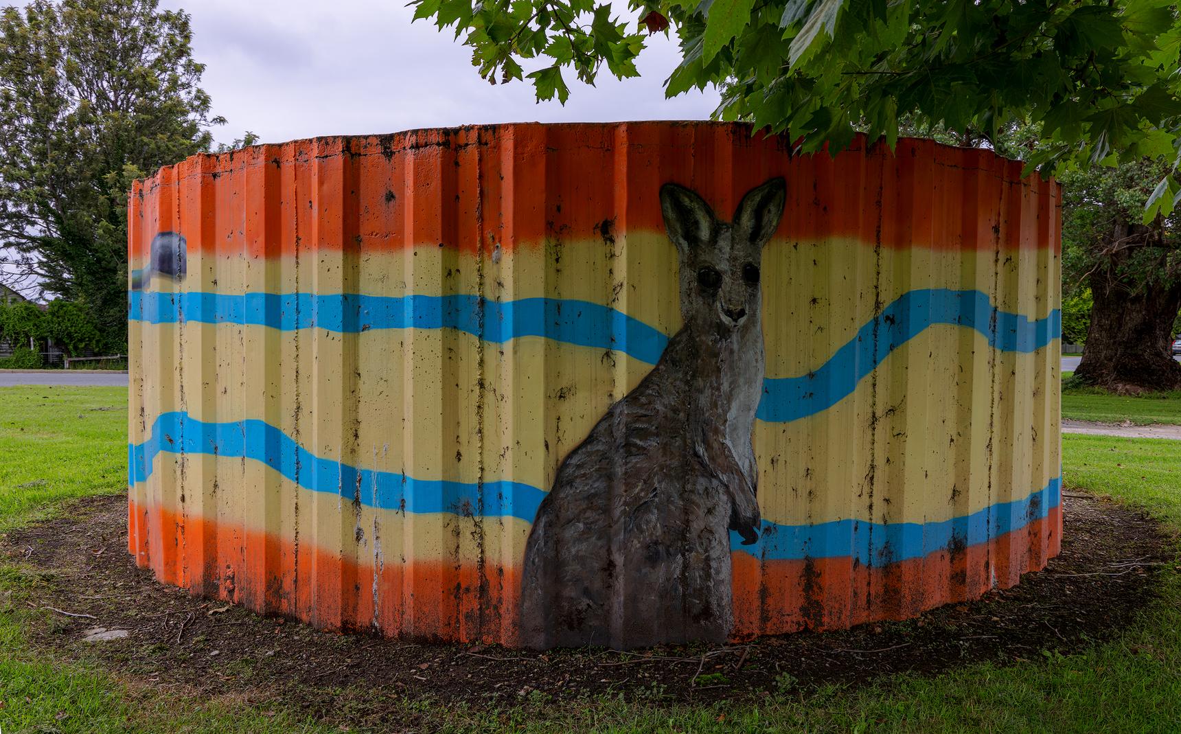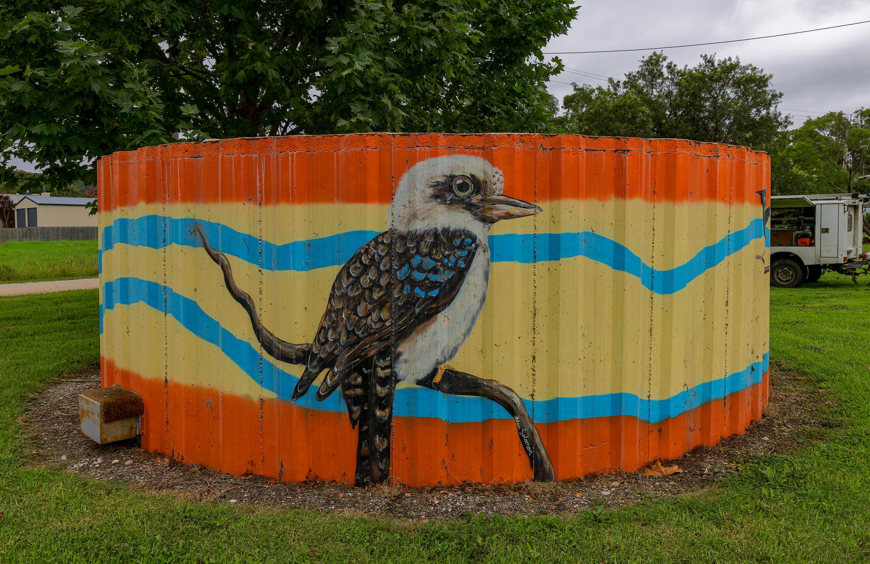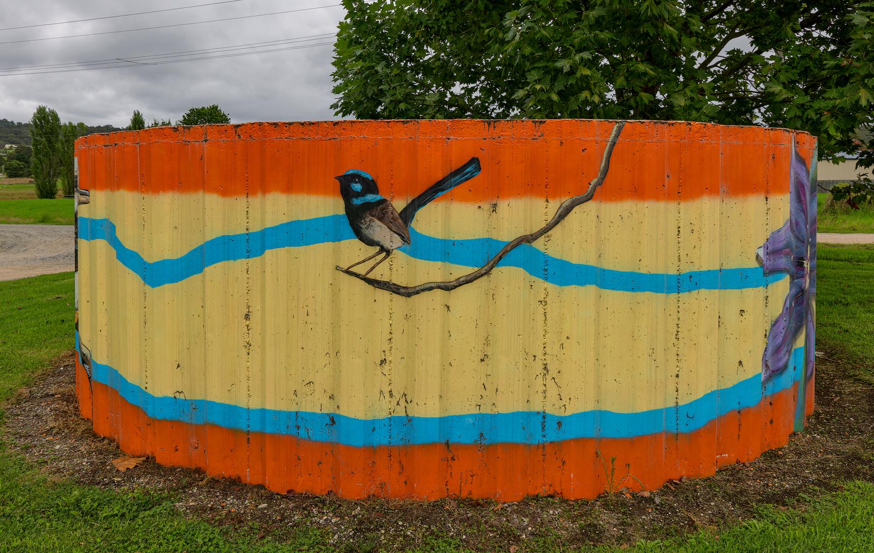 Water tank in Bruthen painted by Alan Solomon, featuring local flora and fauna, Kangaroo, Chocolate Lily, Superb Fairywren, Laughing Kookaburra and Blue-banded bee.