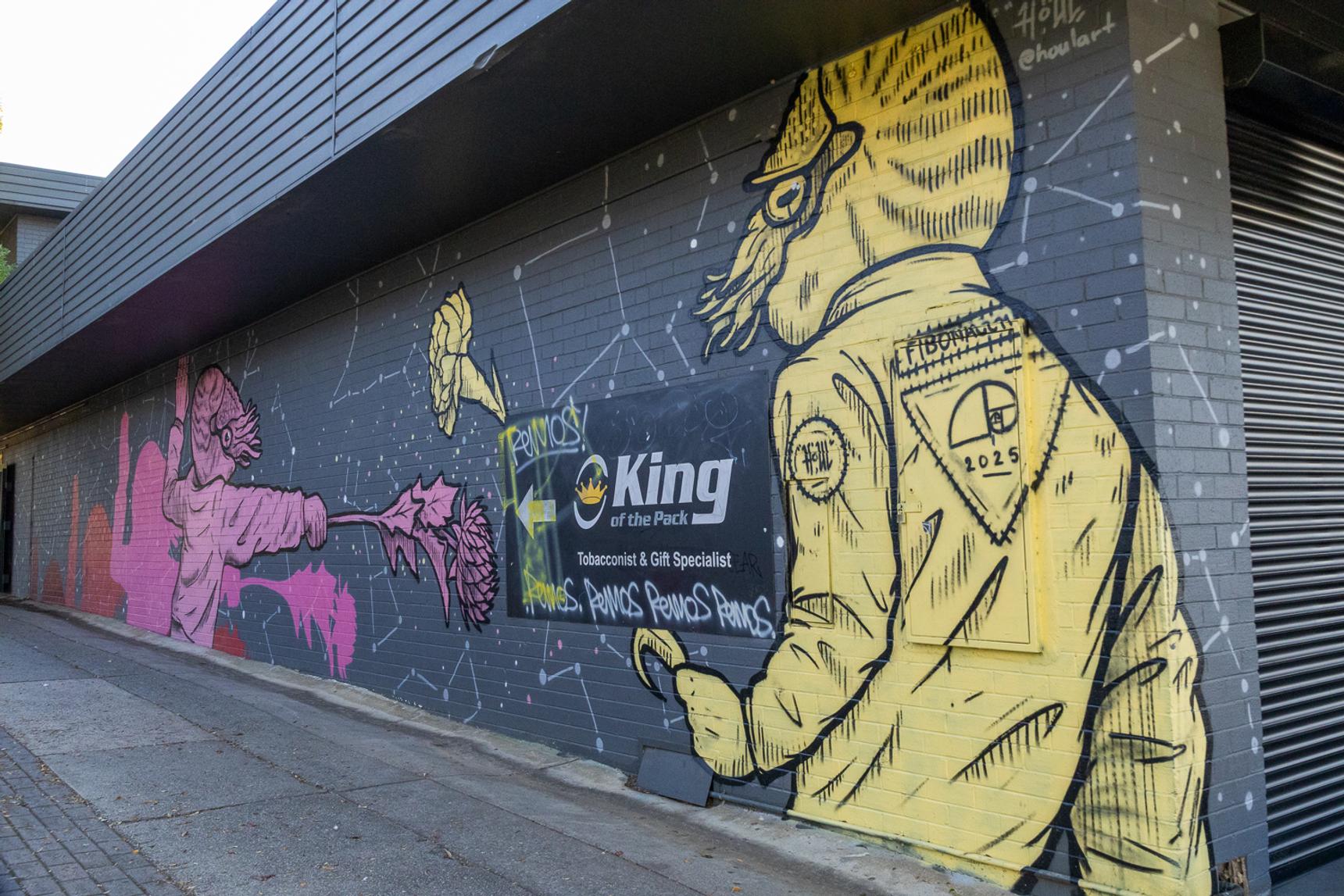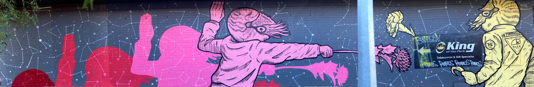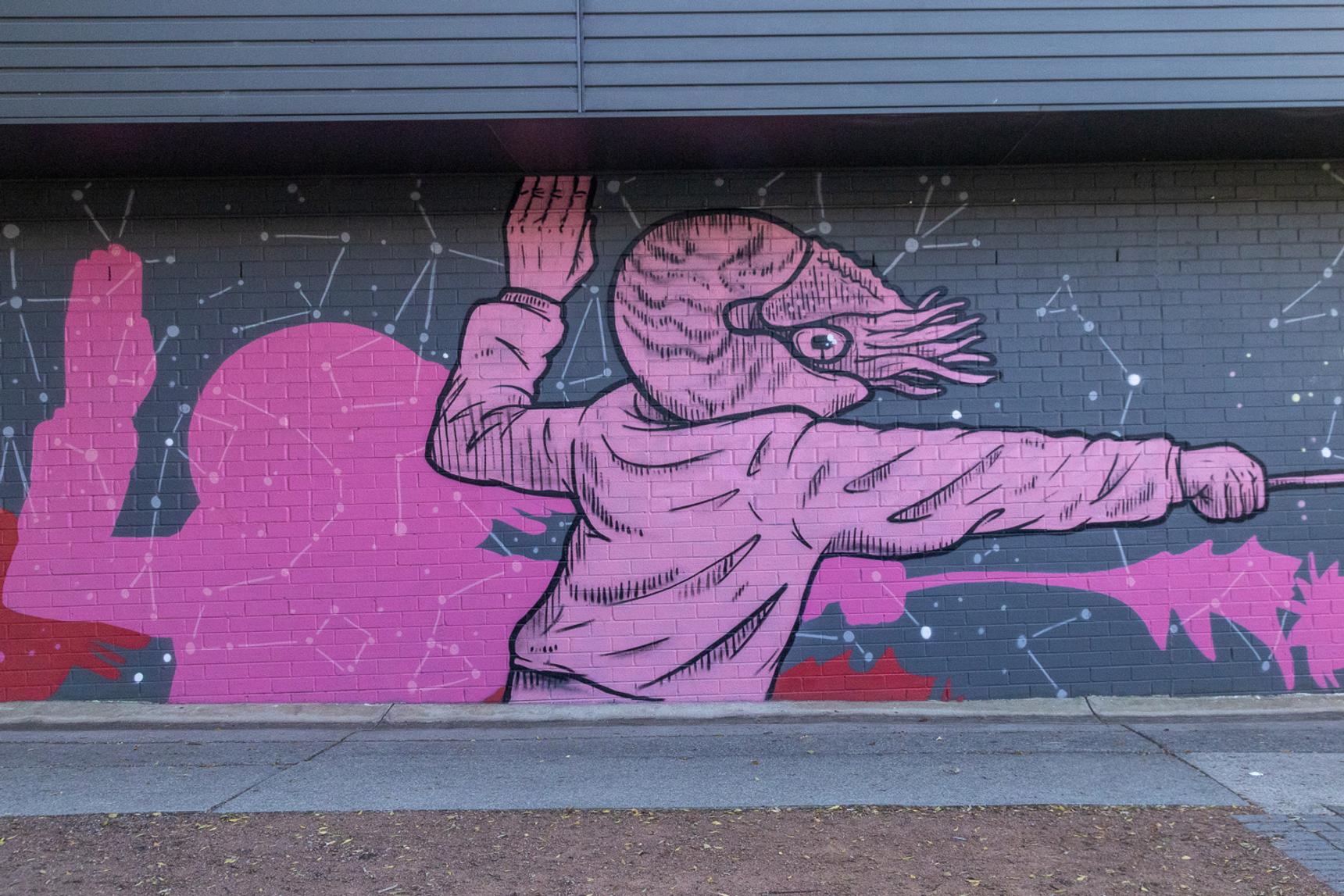 Painted in 2025, this surreal mural shows pink and yellow nautilus men battling each other with flowers (a carnation and a thistle) against a backdrop of constellations. The Maison Escrime Fencing Club meets at the nearby community centre.