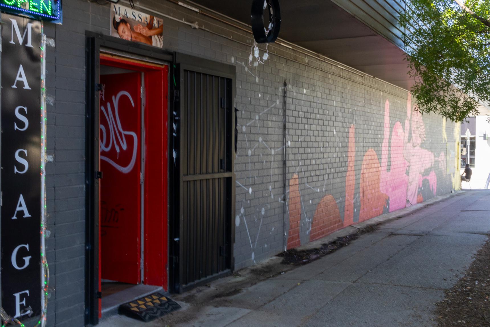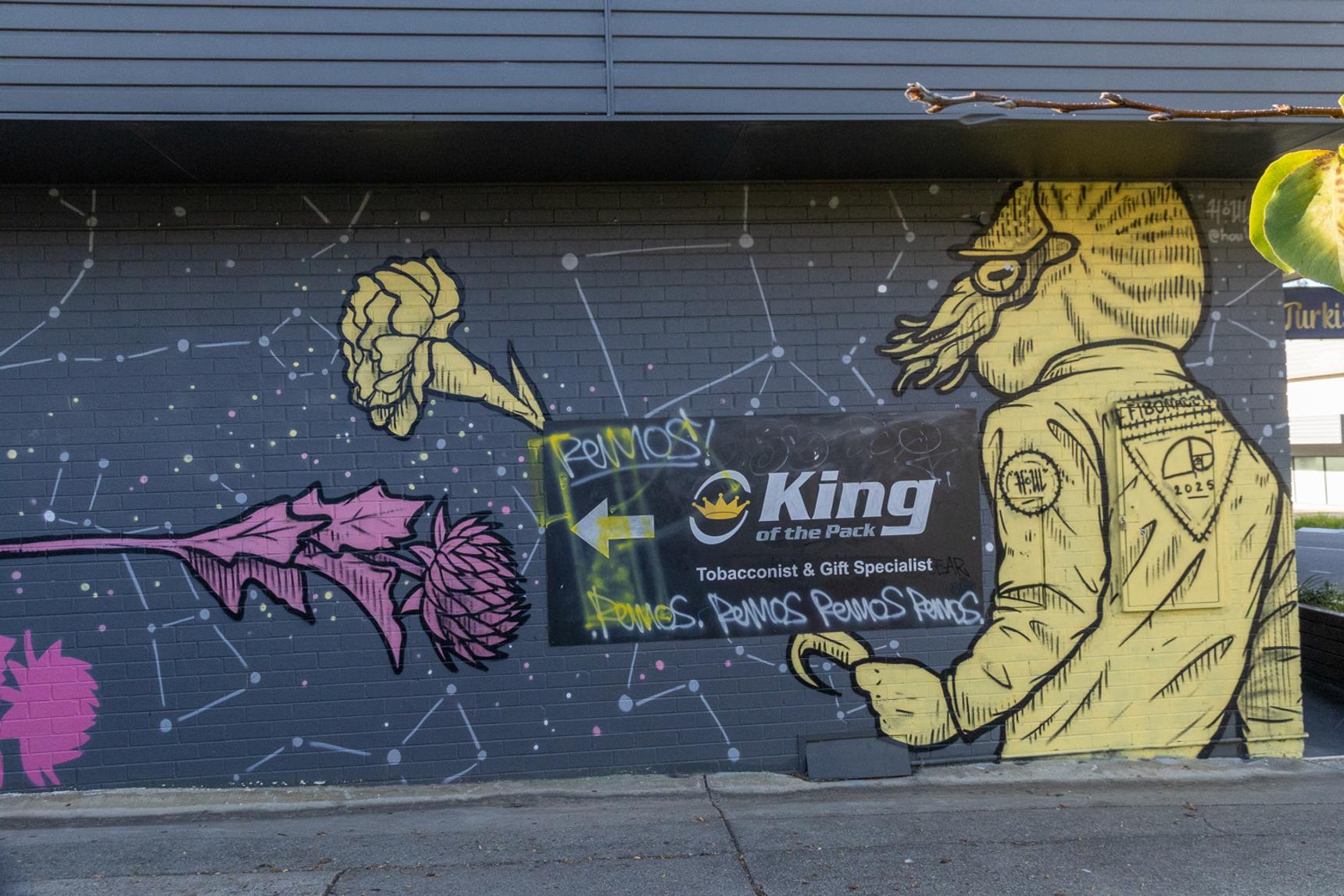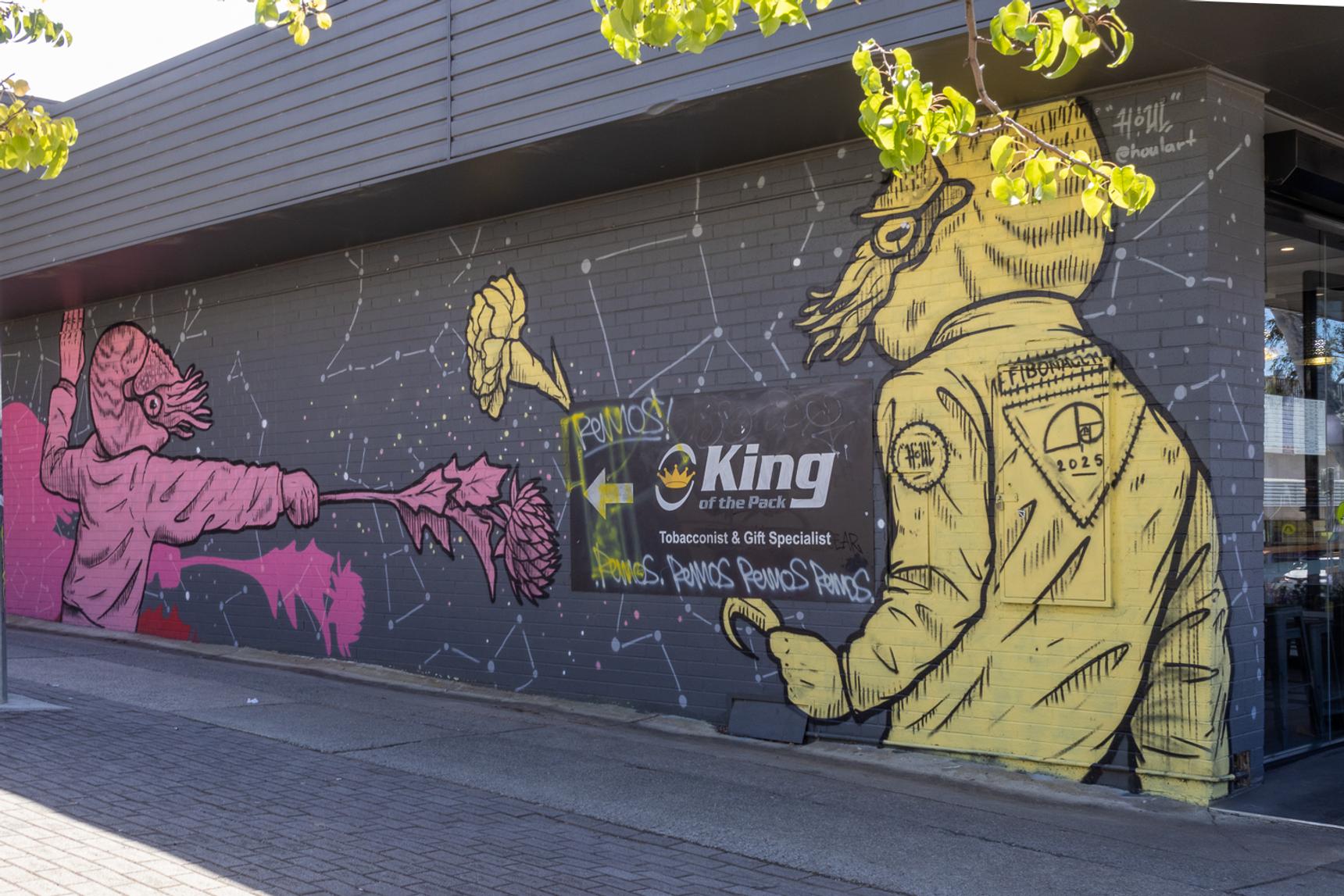Painted in 2025, this surreal mural shows pink and yellow nautilus men battling each other with flowers (a carnation and a thistle) against a backdrop of constellations. The Maison Escrime Fencing Club meets at the nearby community centre.