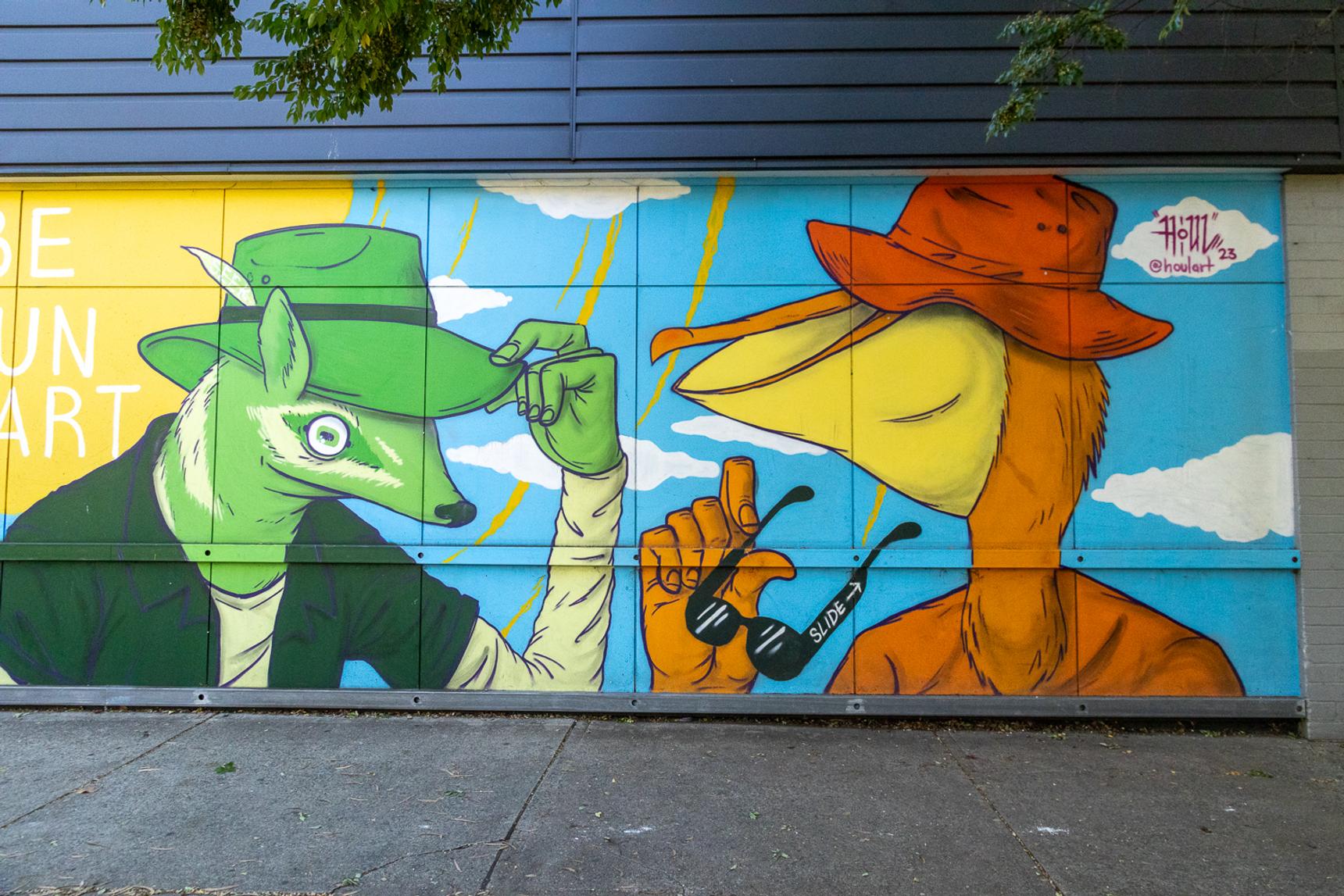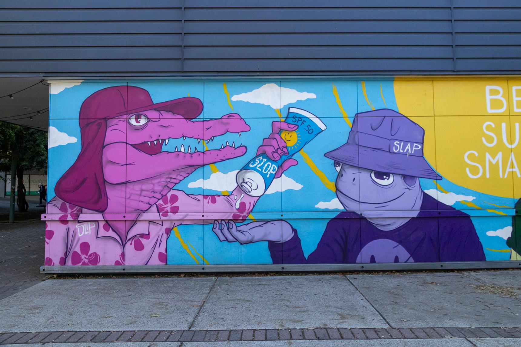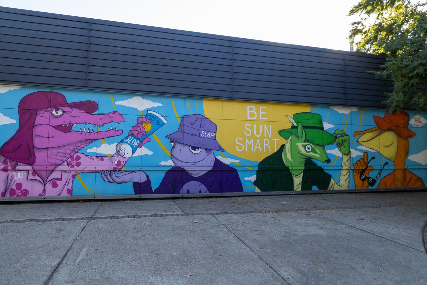 An initiative by the ACT Government and Cancer Council ACT to raise awareness of SunSmart behaviours in ACT playgrounds, the mural shows a range of creatures practising sunsmart behaviours. It is located next to a playground at Cooleman Court Shopping Centre.