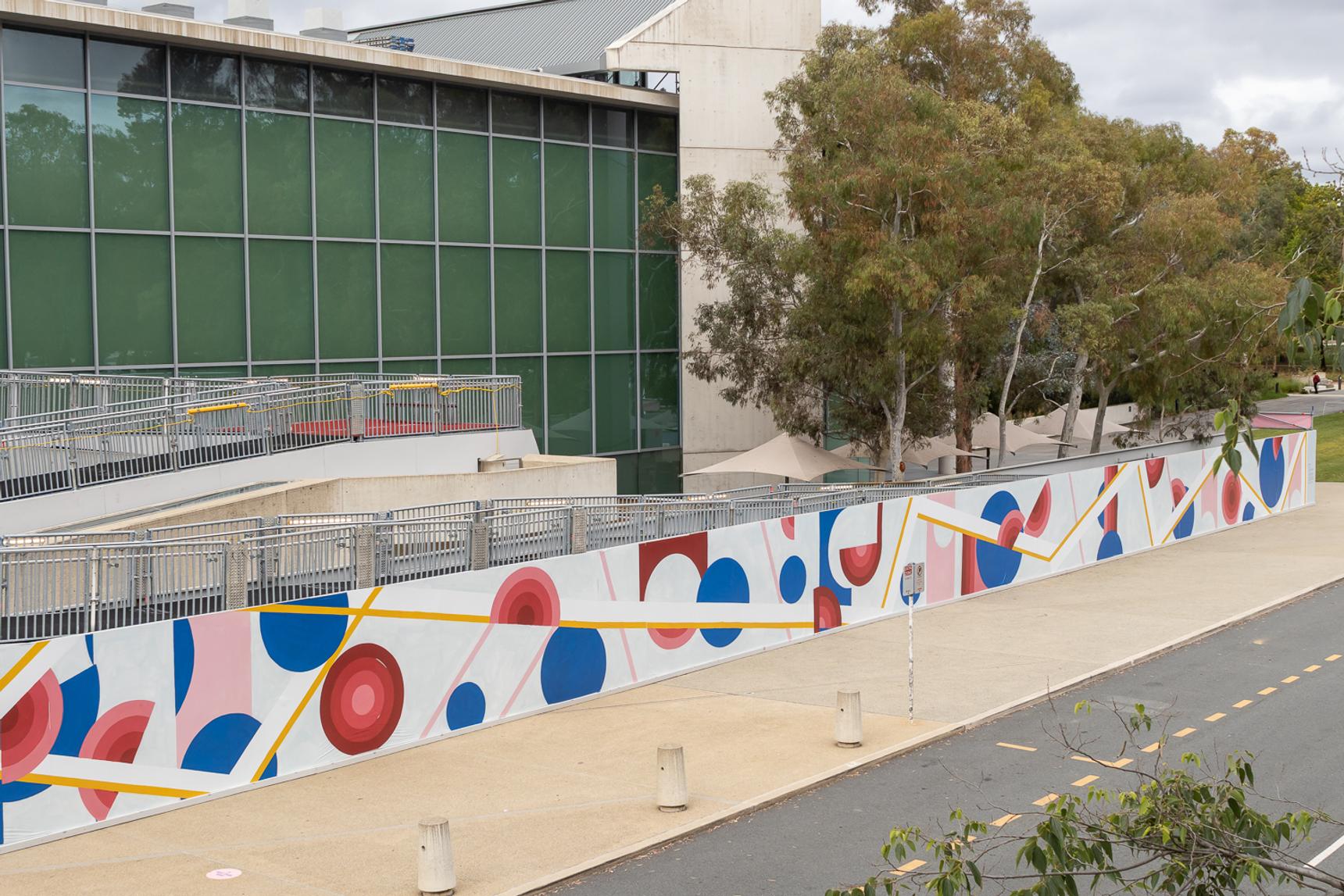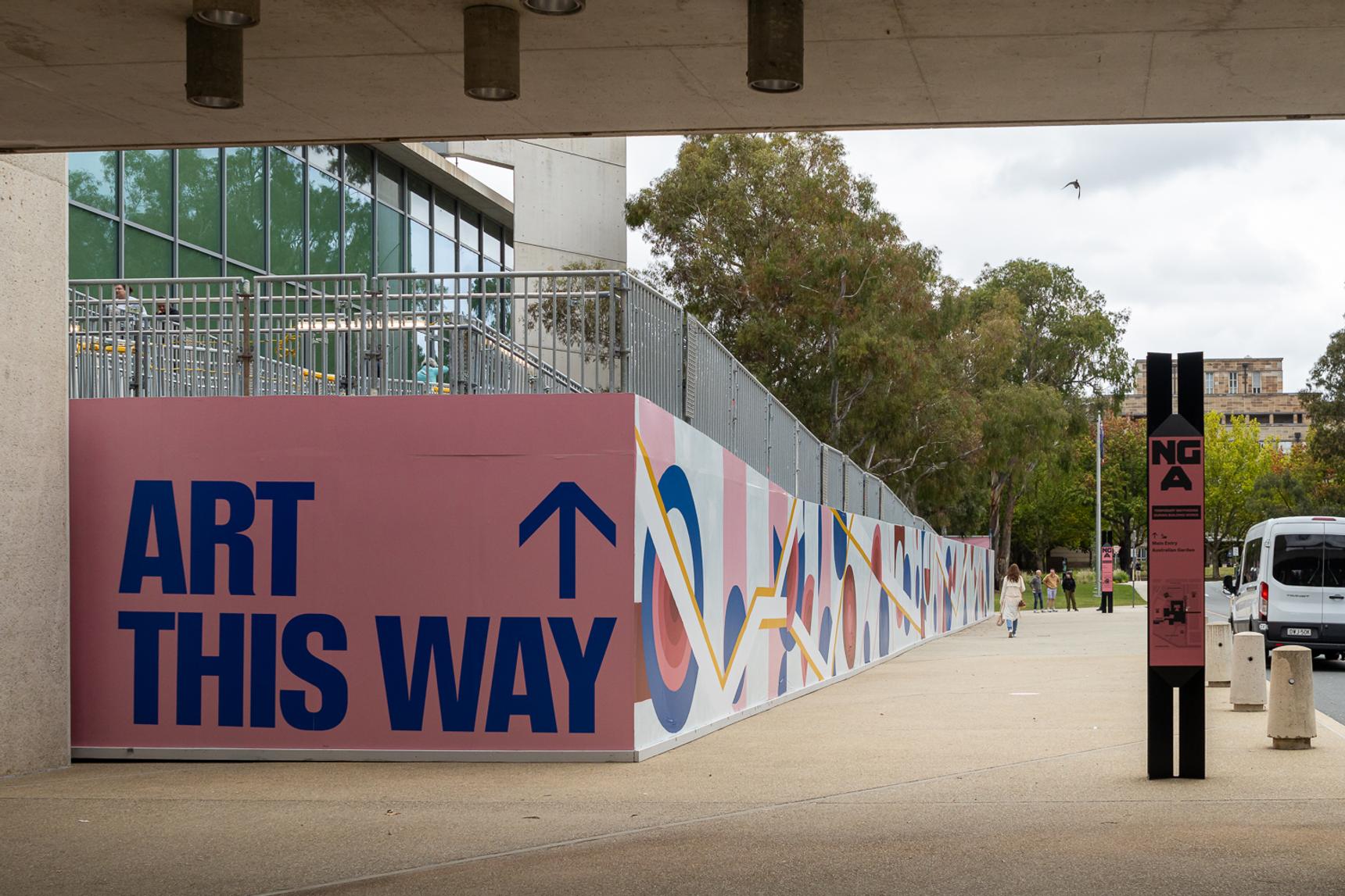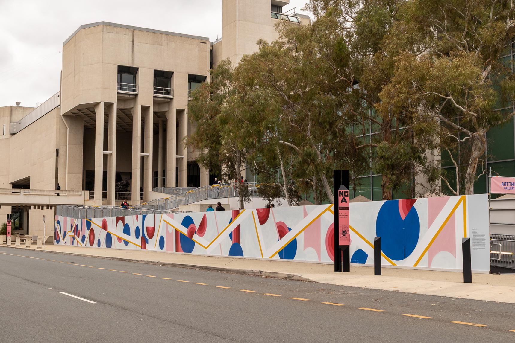 A colourful temporary installation to welcome visitors to the National Gallery of Australia while the entrance undergoes significant building works. The 53 metre mural on vinyl is drawn from a series of about 40 small paintings the artist has made since 2019.
