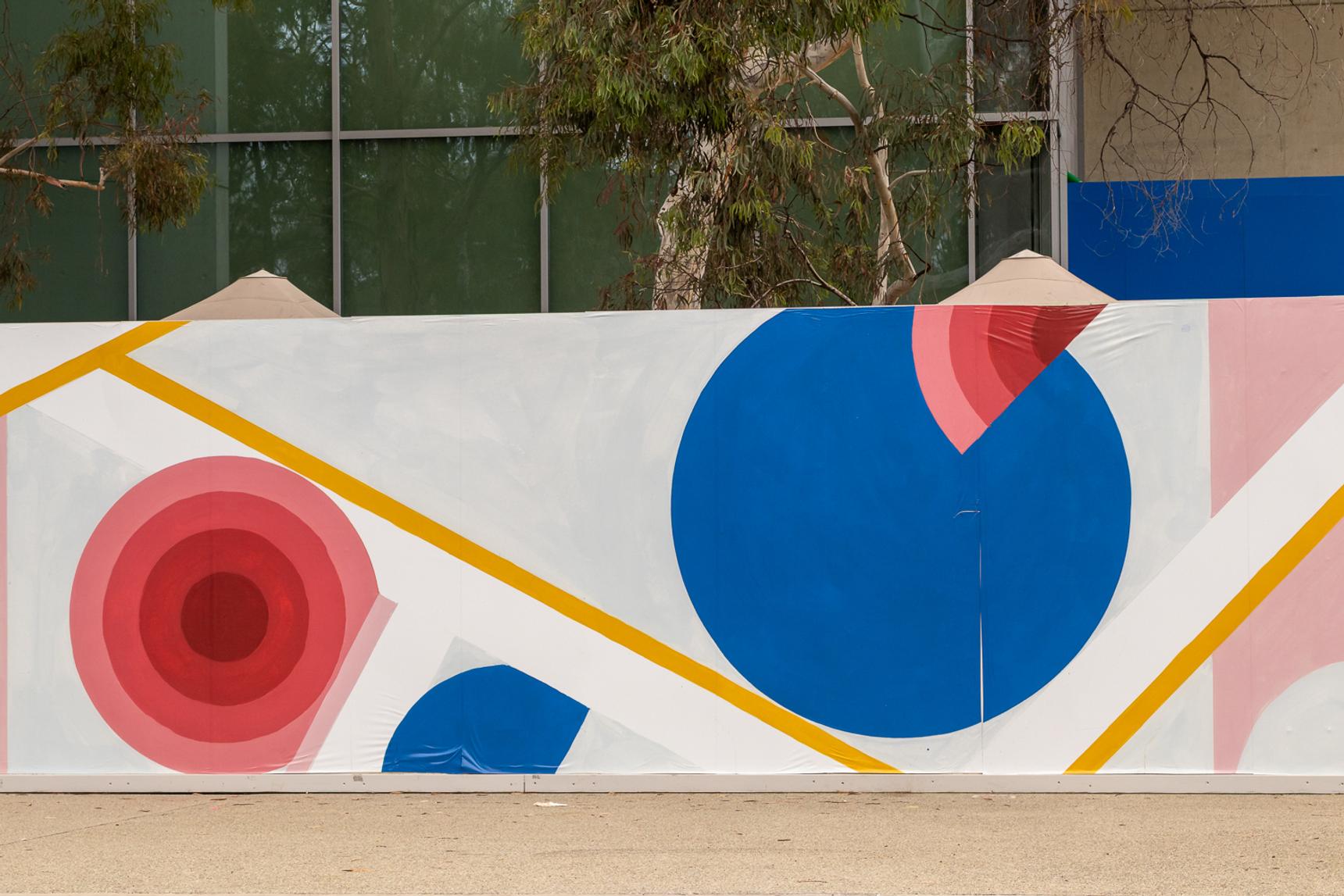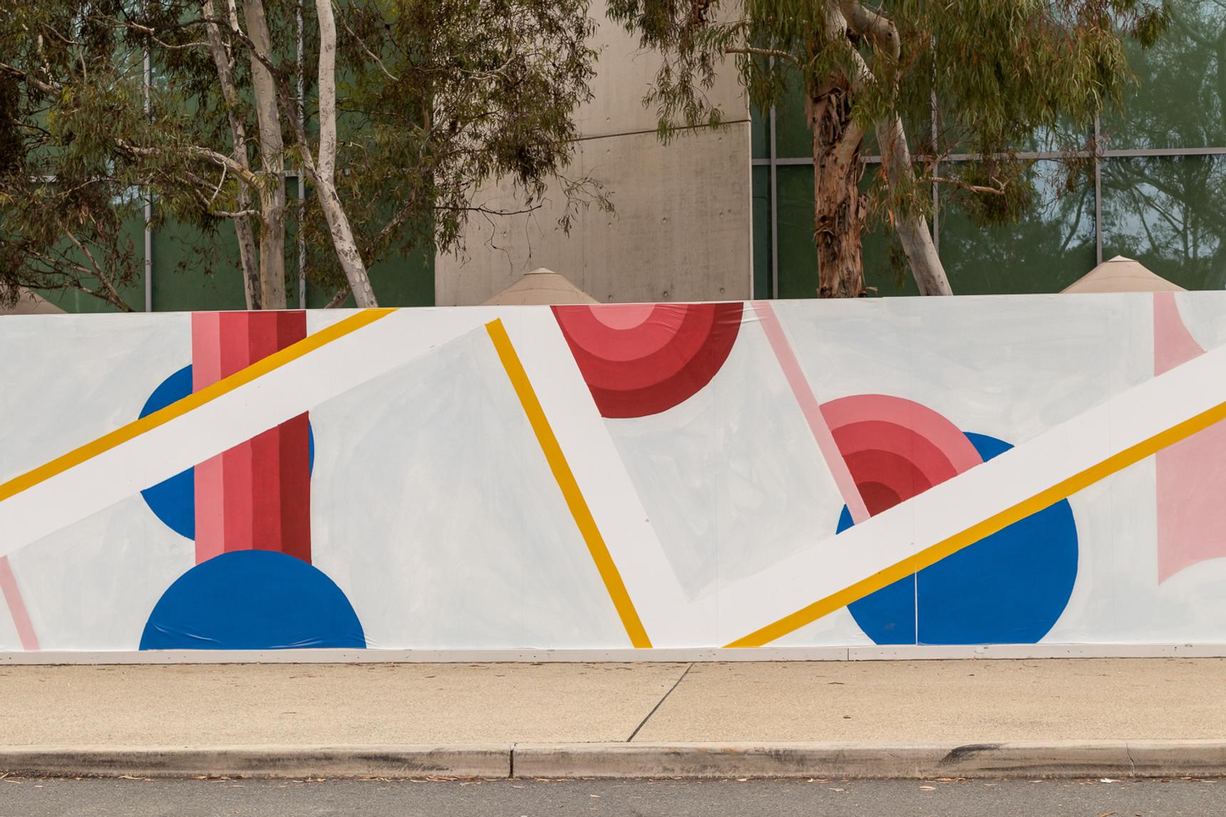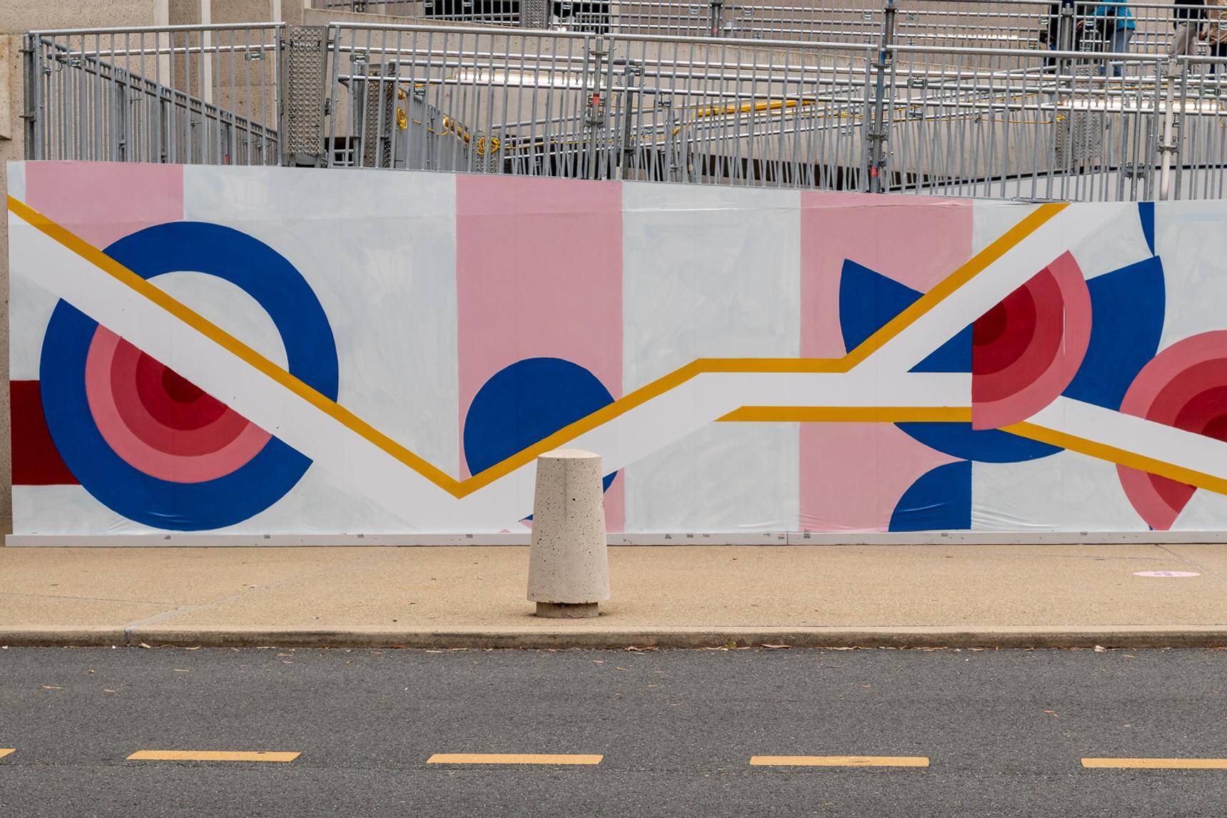 A colourful temporary installation to welcome visitors to the National Gallery of Australia while the entrance undergoes significant building works. The 53 metre mural on vinyl is drawn from a series of about 40 small paintings the artist has made since 2019.