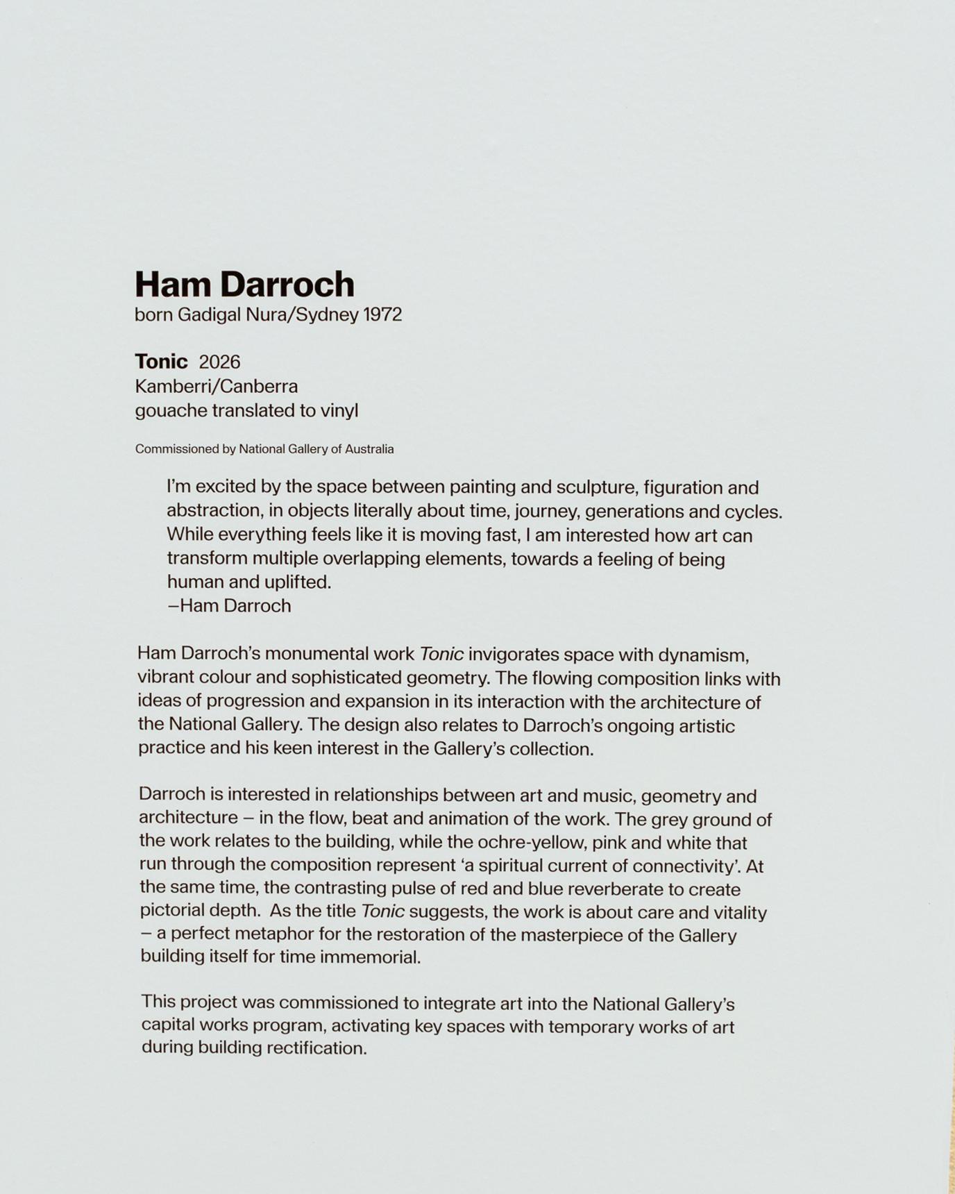 The flowing composition links with ideas of progression and expansion in its interaction with the architecture of the National Gallery of Australia. I’m interested in relationships between art and music, geometry and architecture – in the flow, beat and animation of the work. The grey ground of the work relates to the building, while the ochre-yellow, pink and white that run through the composition represent ‘a spiritual current of connectivity’. At the same time, the contrasting pulse of red and blue reverberate to create pictorial depth. As the title Tonic suggests, the work is about care and vitality – a perfect metaphor for the restoration of the masterpiece of the Gallery building itself for time immemorial."