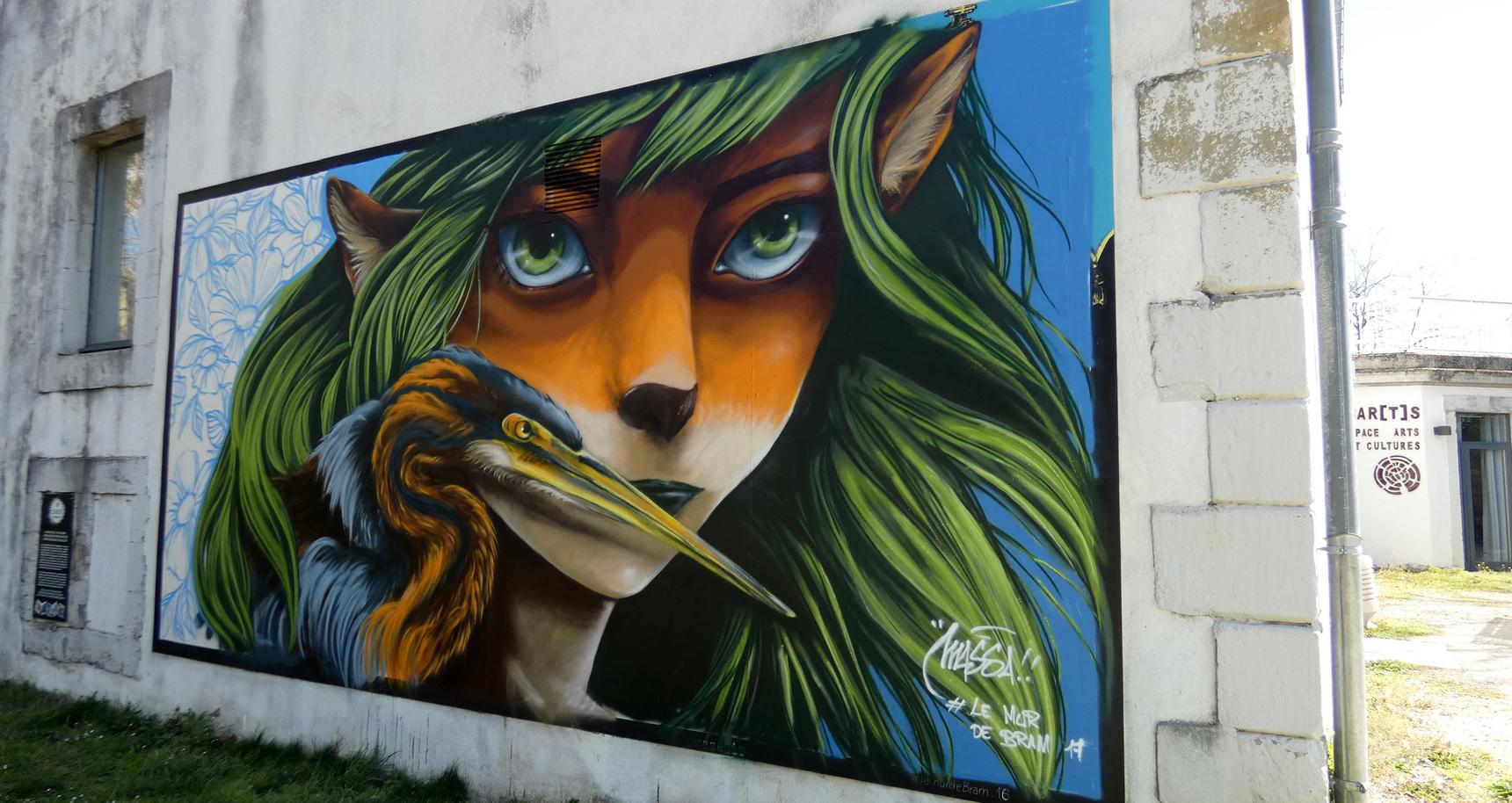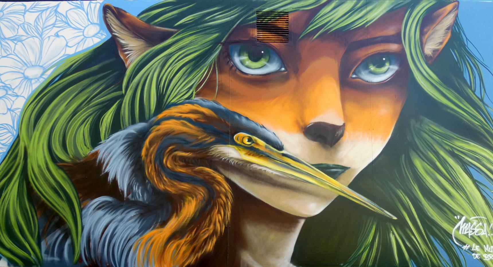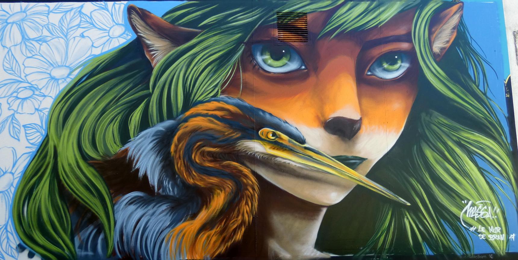"Ainsi, se termine l'hiver. Aude à la faune locale. Quand Dame Renardinette croise Sieur Poupré d'Héron" 17 WALL of Bram (Aude) was painted by MASSA in march 2026. She is from Toulouse. It will be visible till june 2026...