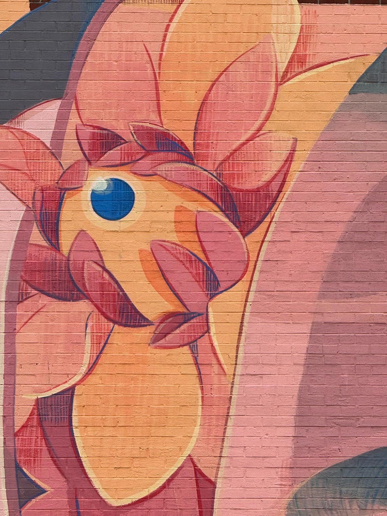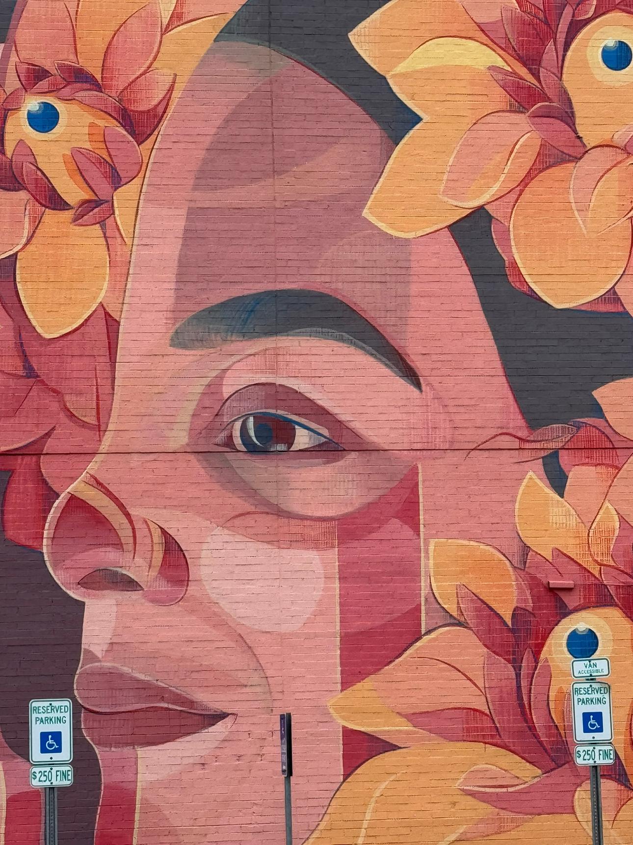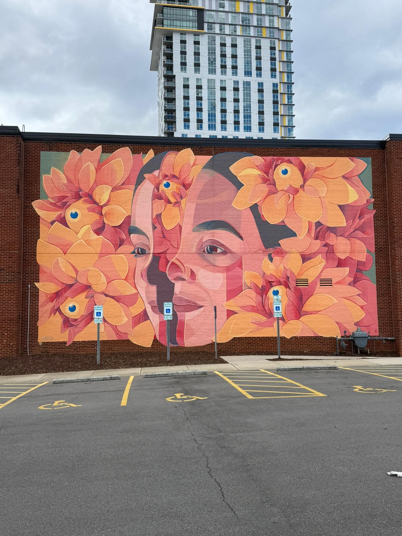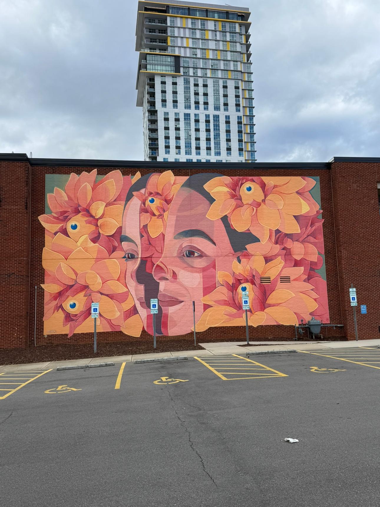 gorgeous colors! parking lot empty on weekends. there is another big mural on the opposite side of the building