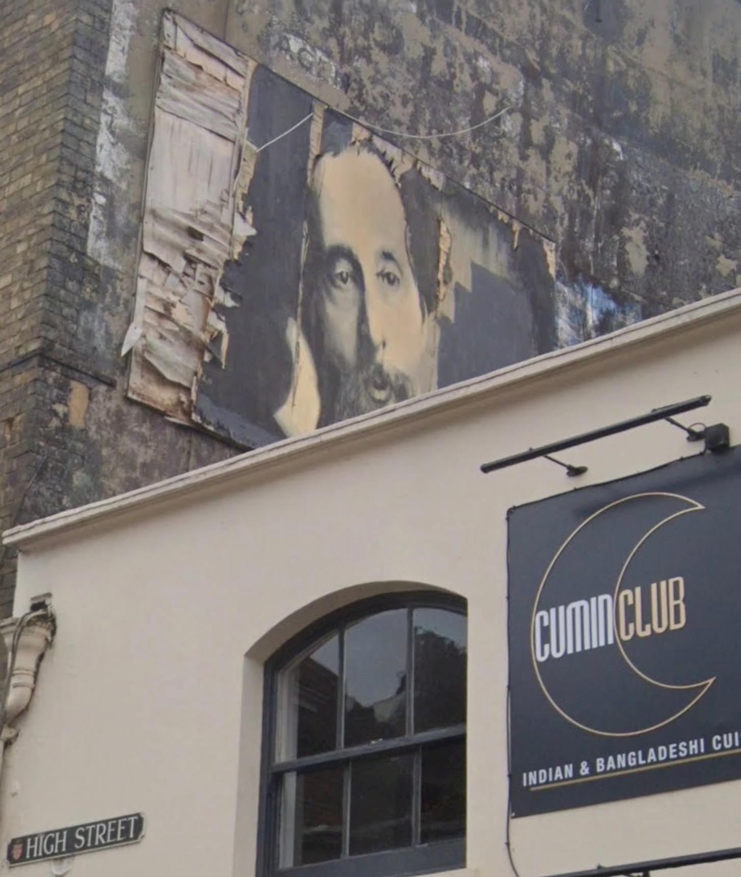 A Charles Dickens portrait above The Cumin Club in Rochester High Street