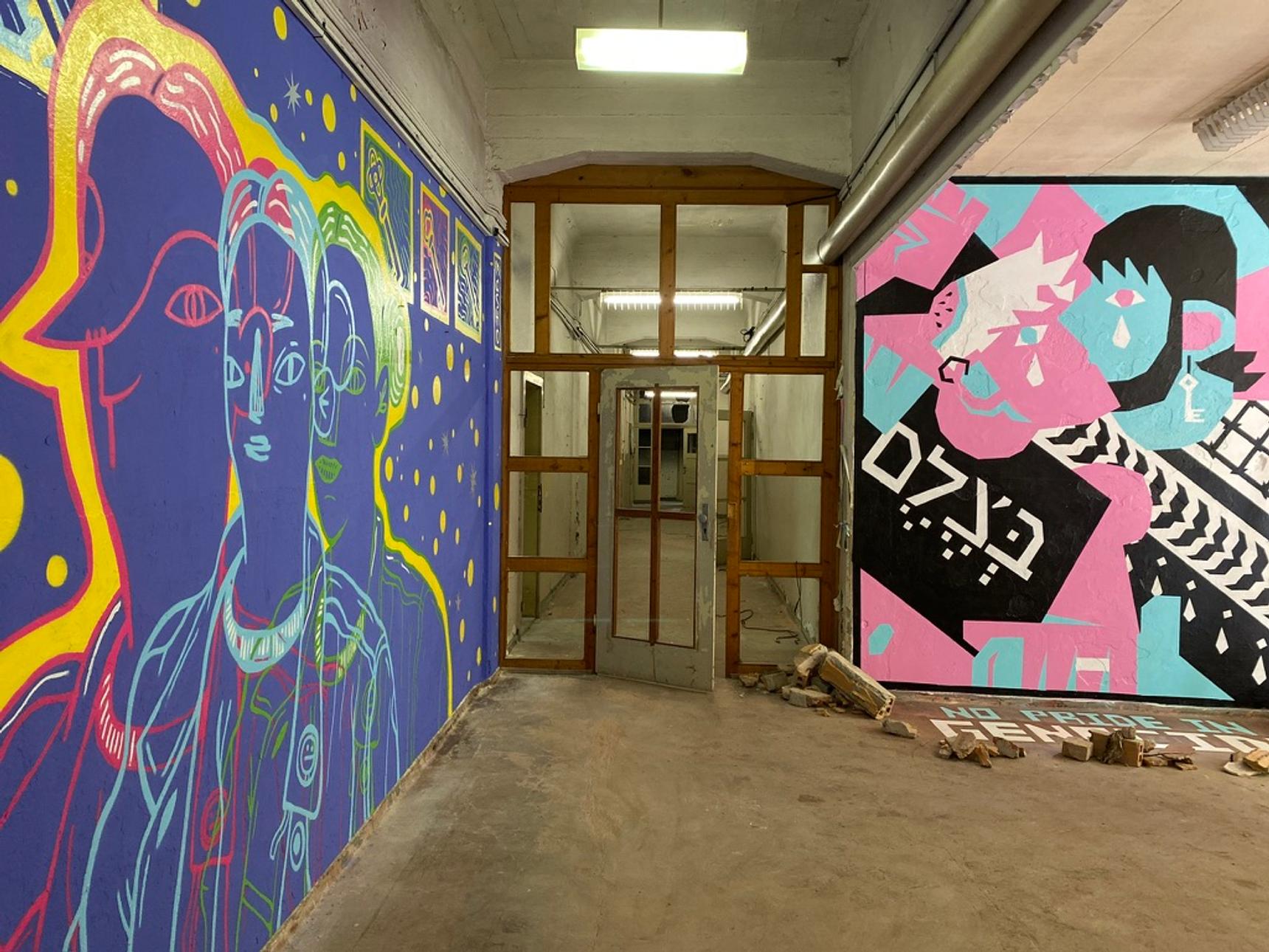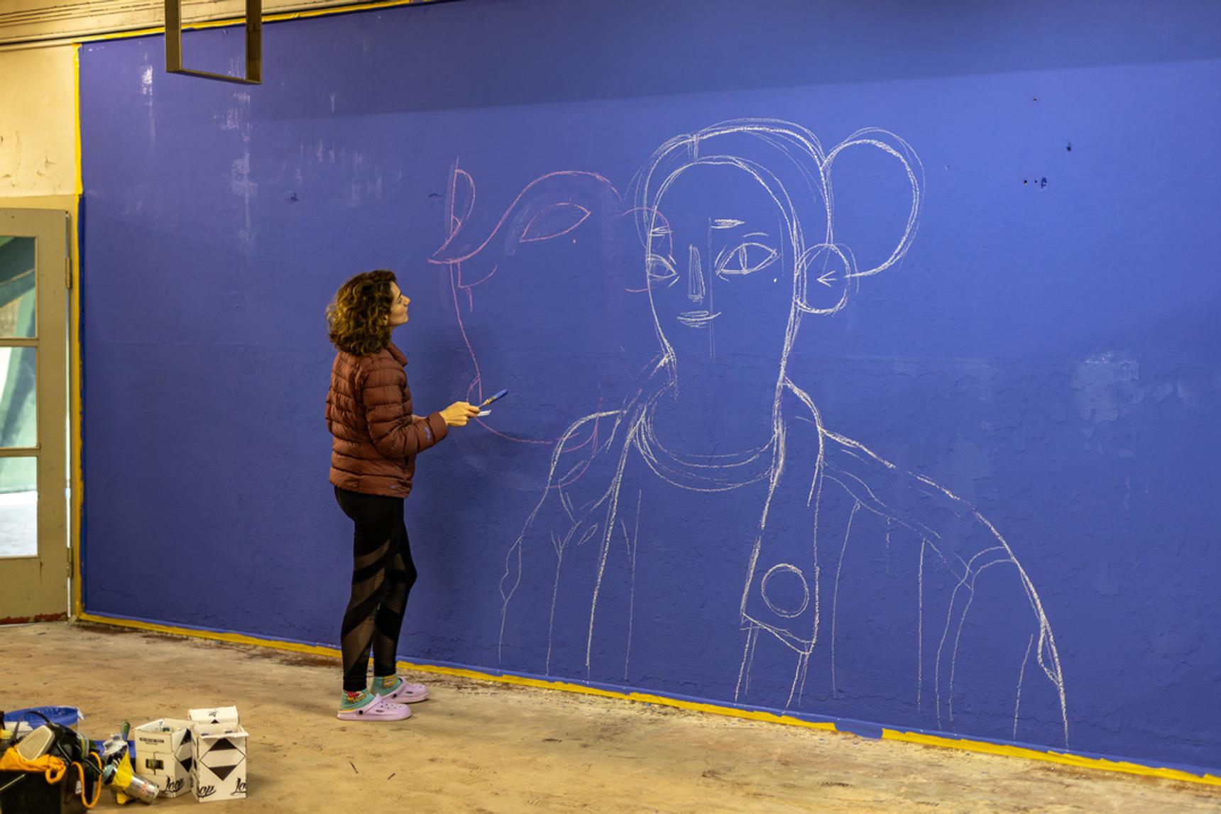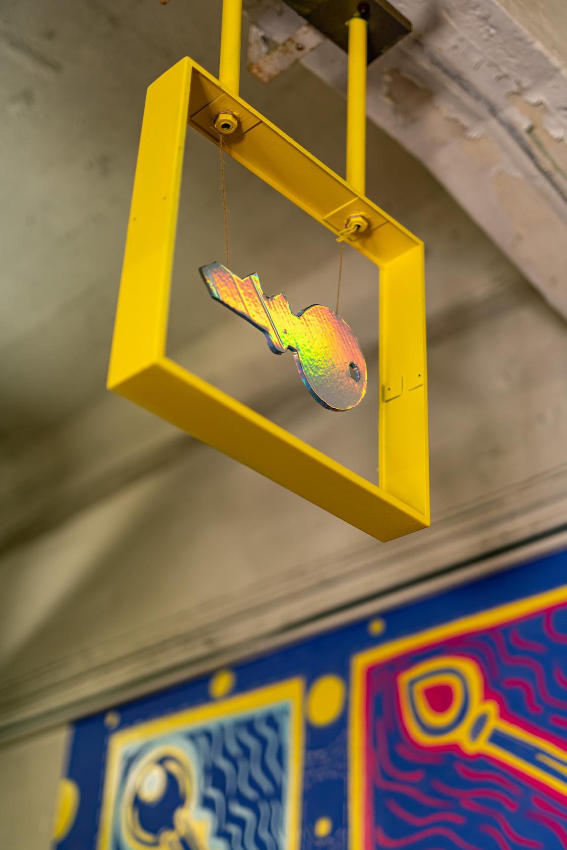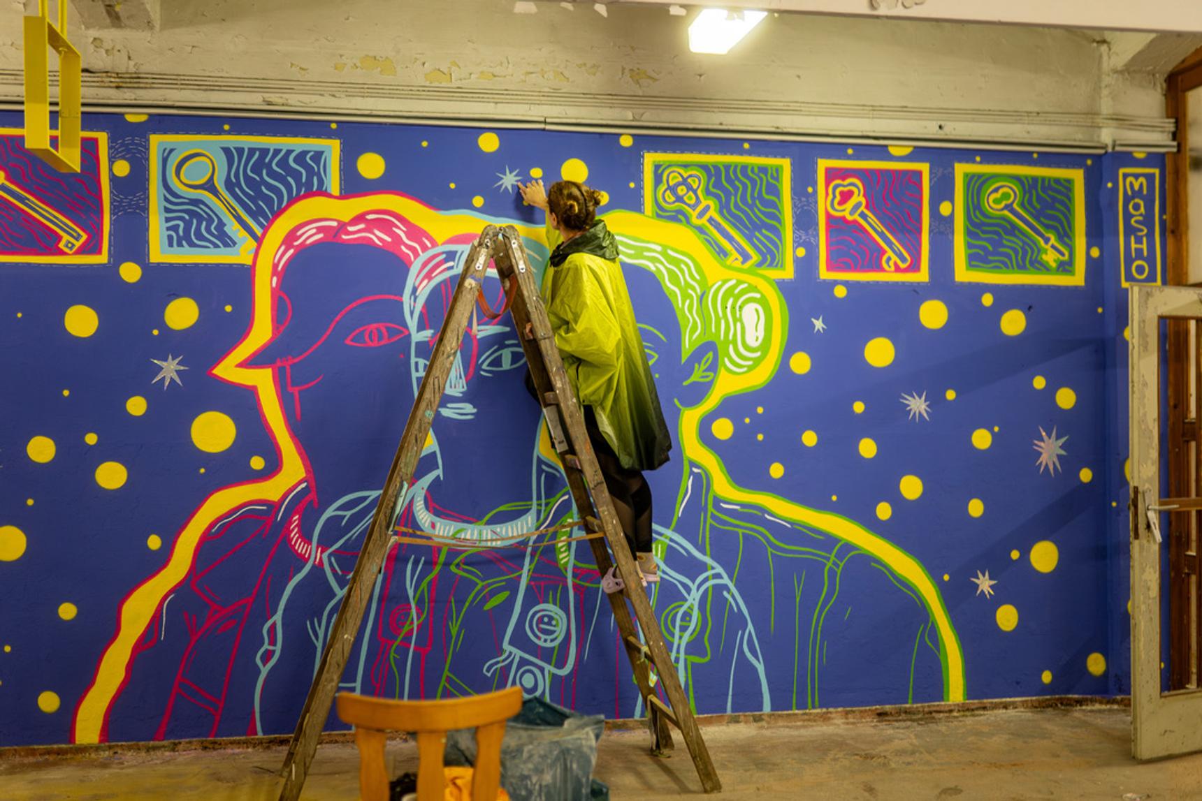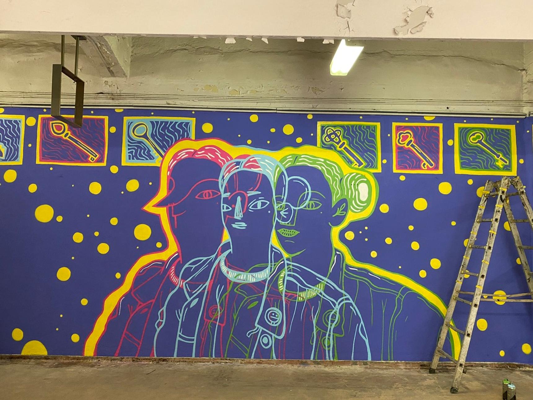 This piece is both a self-portrait of my artistic transition and a look at the past, present and future of this year’s ibug festival venue. The three intertwined faces show different moments in time, just like the building’s own story - once a factory, later a hospital, and now a place for art, with its future still to come. It was a complete experiment for me, using only outlines and overlapping characters to capture a sense of change. The keys above hint at the choices we face, each one opening a different door. The cutout key was a last-minute idea, adding a playful connection to the space.
