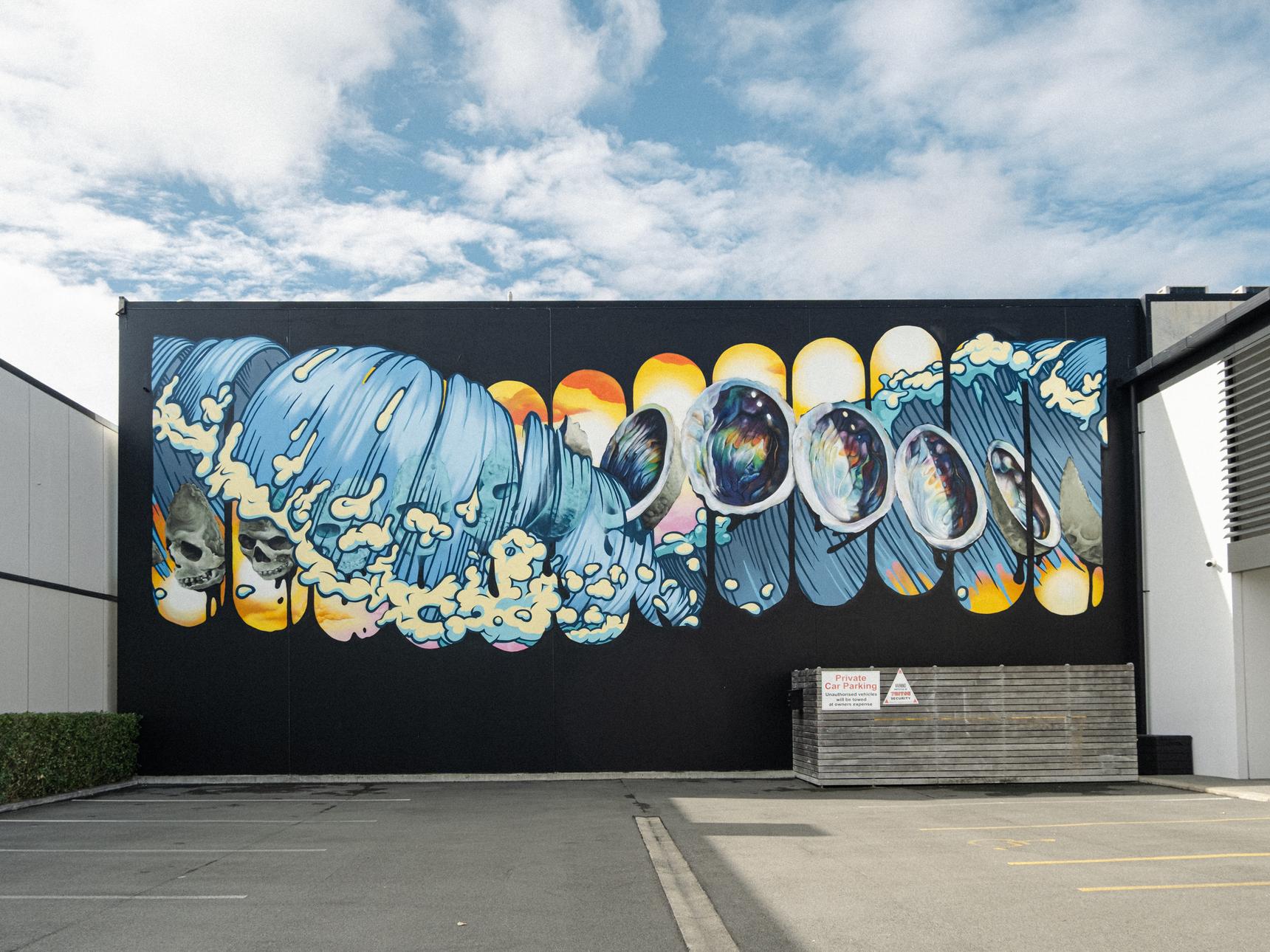 To ground the mural in Aotearoa, INSA chose the pāua shell as the central feature. One of the most iridescent and visually striking shells in the world, pāua also carries deep cultural significance within Māori traditions, where it has long been used in carving and adornment.