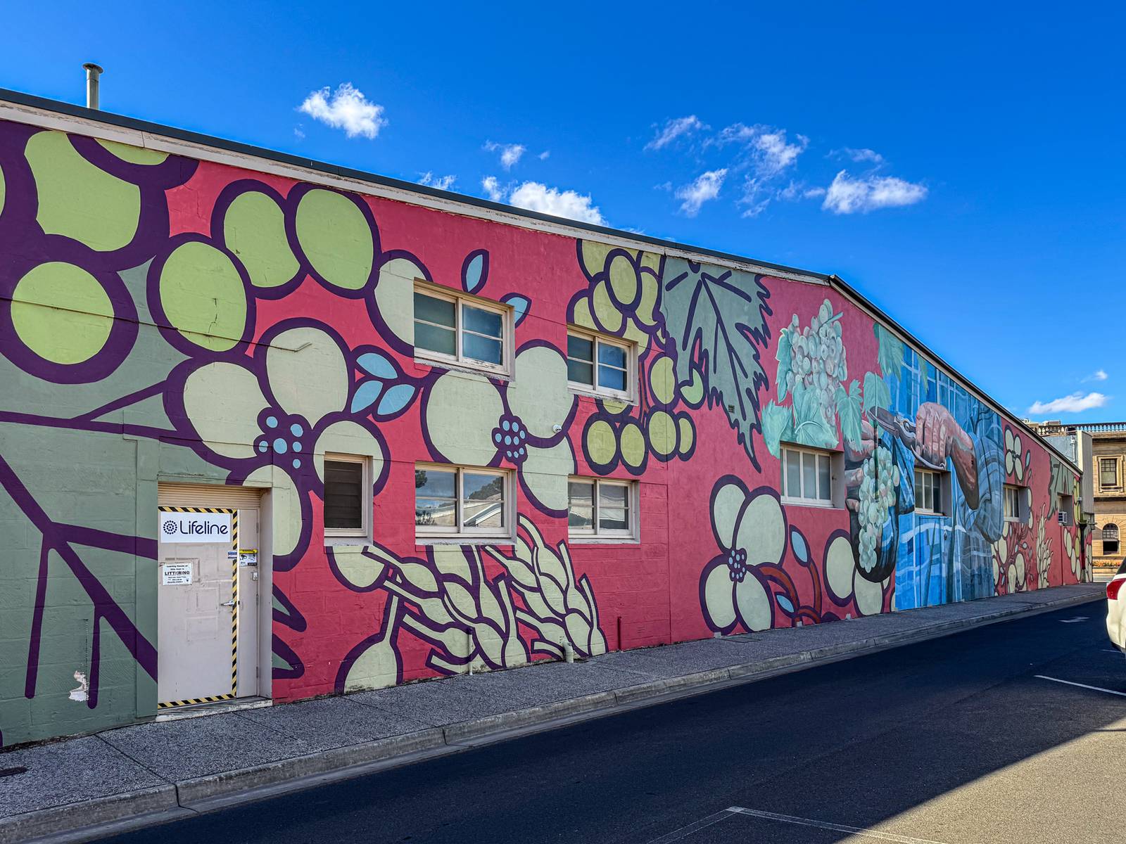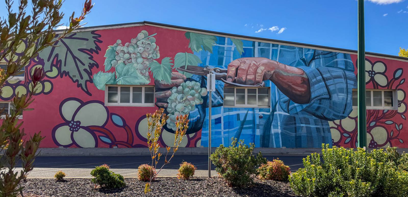A large mural capturing cutting grapes in the Clare Valley, a well-known wine region of South Australia.