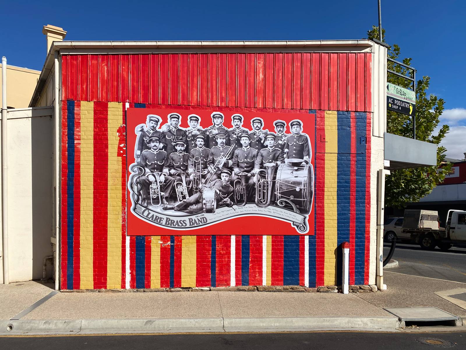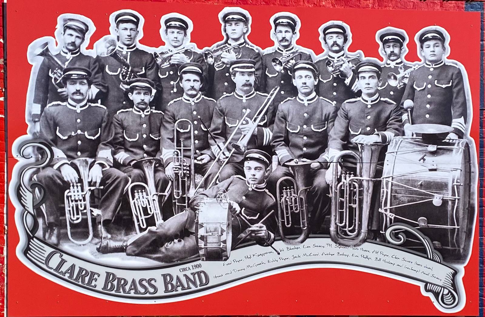 A brightly coloured mural featuring a photograph of the Clare brass Band from circa 1900