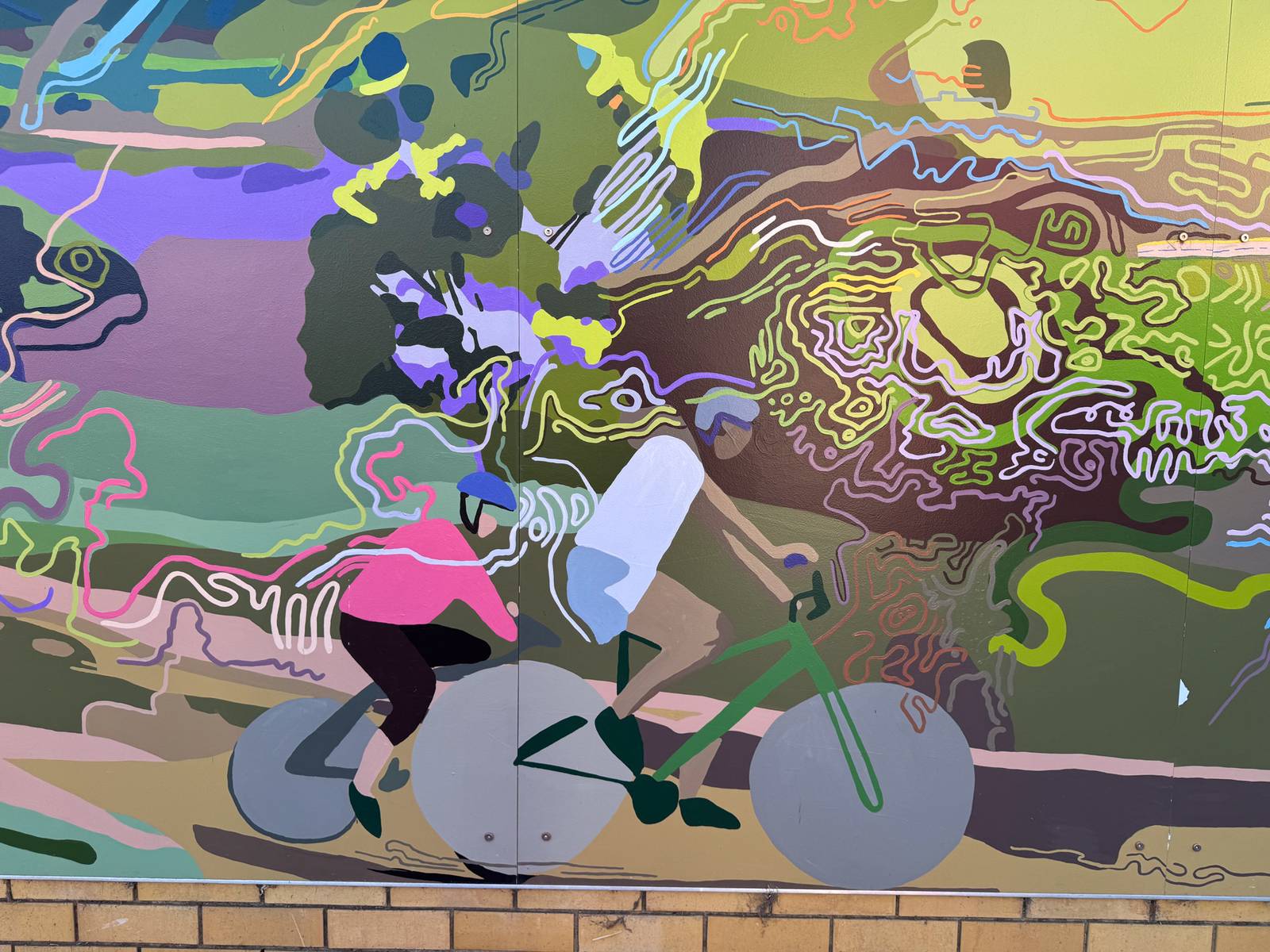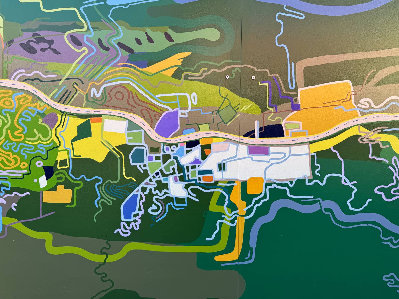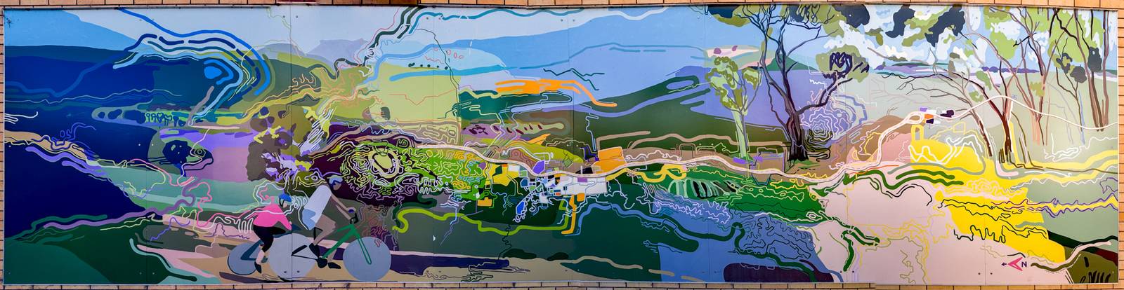 For this mural, the artists used a topographical map of the Riesling Trail, which is a detailed illustration of buildings and geographical elements of a landscape. The Riesling Trail on a 33 km old rail corridor that takes travellers on a winding tour of the vineyards north of Clare, past the town, and to the southern town of Auburn.