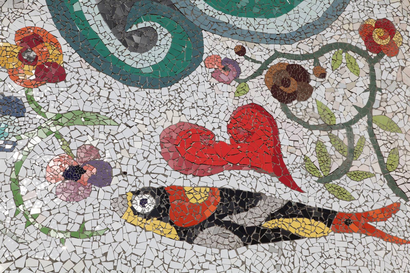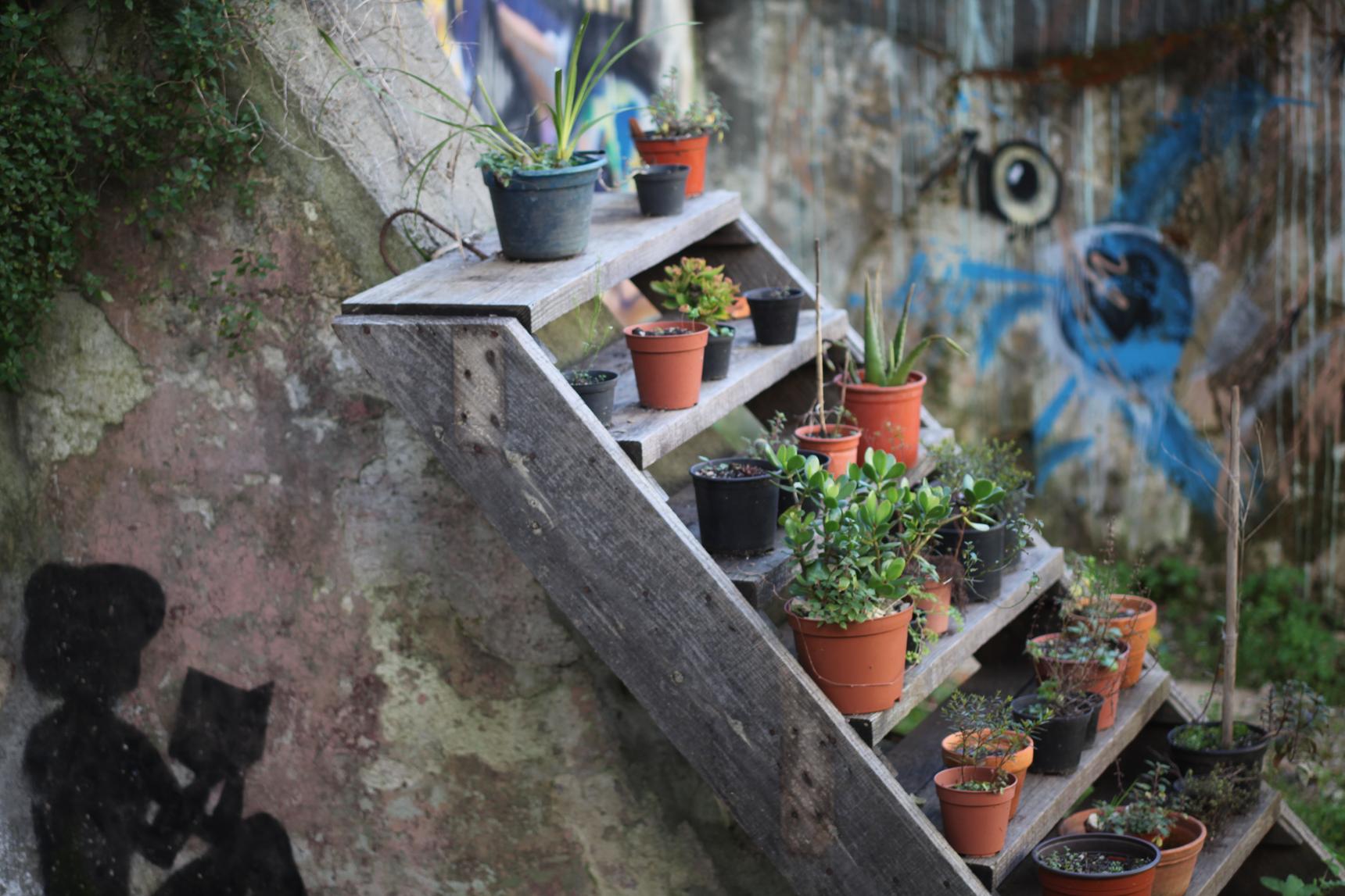 Street art made with pieces of tiles on one of the streets in the downtown (Baixinha) of Coimbra.