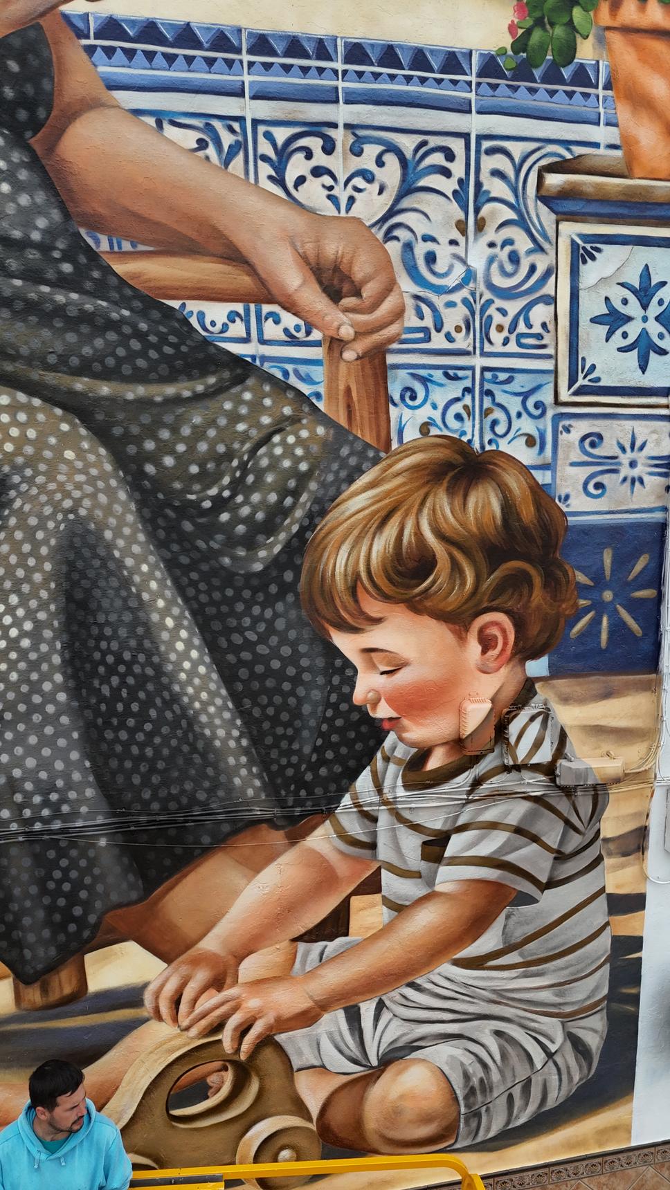 La escena retrata a una mujer mayor, con el carácter y la calidez de tantas mujeres de barrio, sentada en su tradicional silla de nea. Su vestido negro de lunares blancos evoca la sencillez cotidiana de otra época. A su lado, su nieto juega despreocupado con un pequeño coche de madera, ajeno al paso del tiempo.