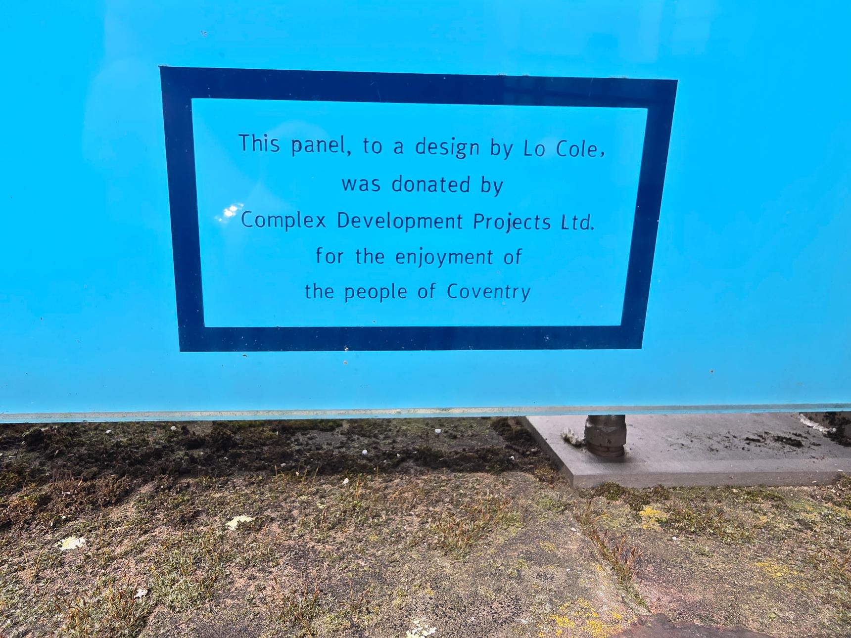 A glass panel in shades of blue and green, depicting stylised people enjoying the literature, activities, food and wine of Coventry.