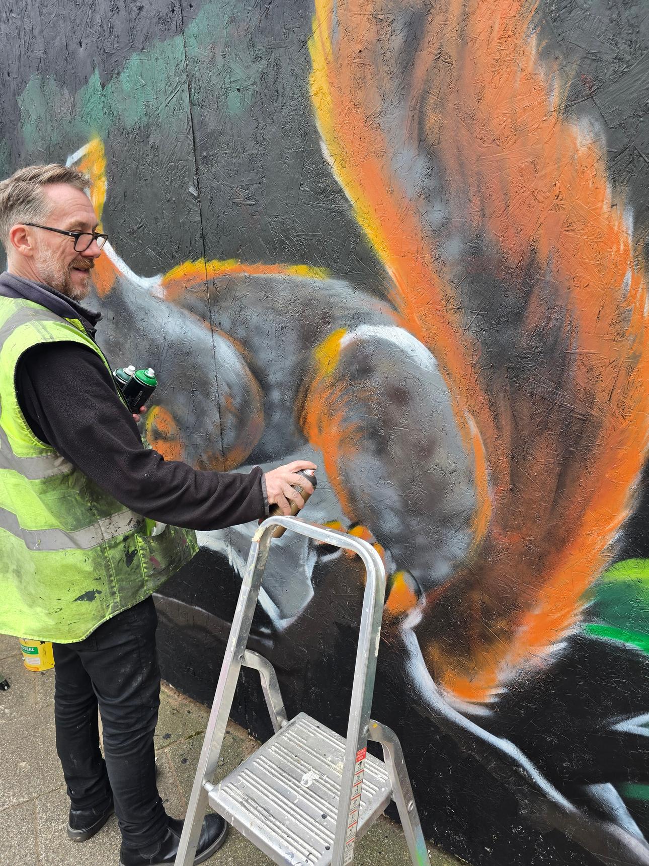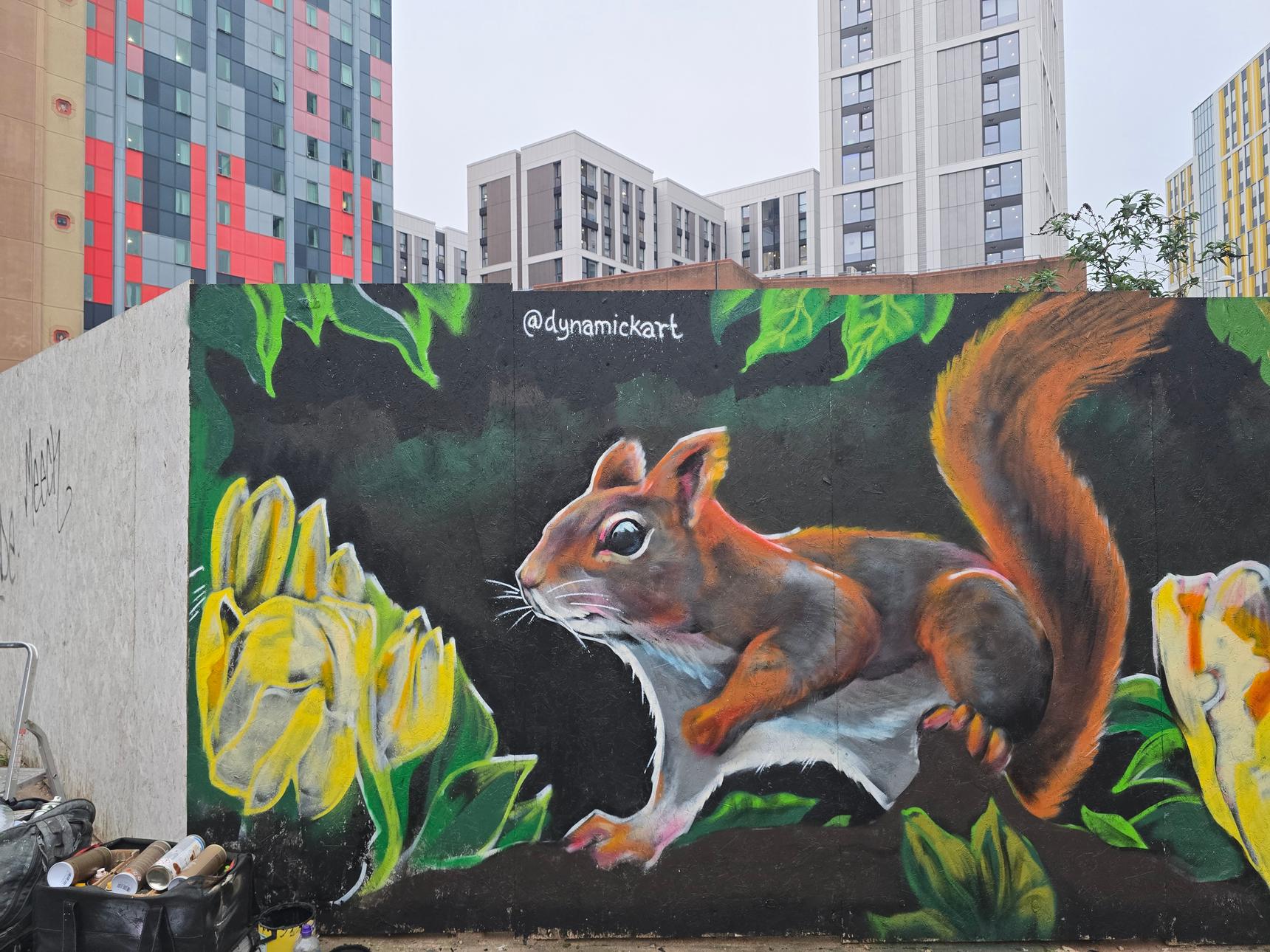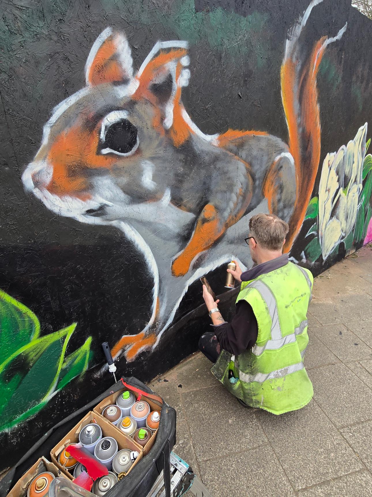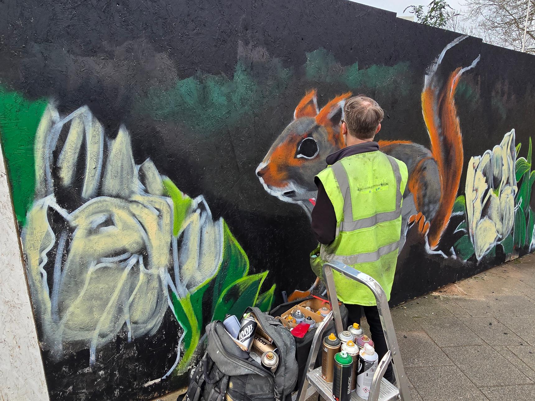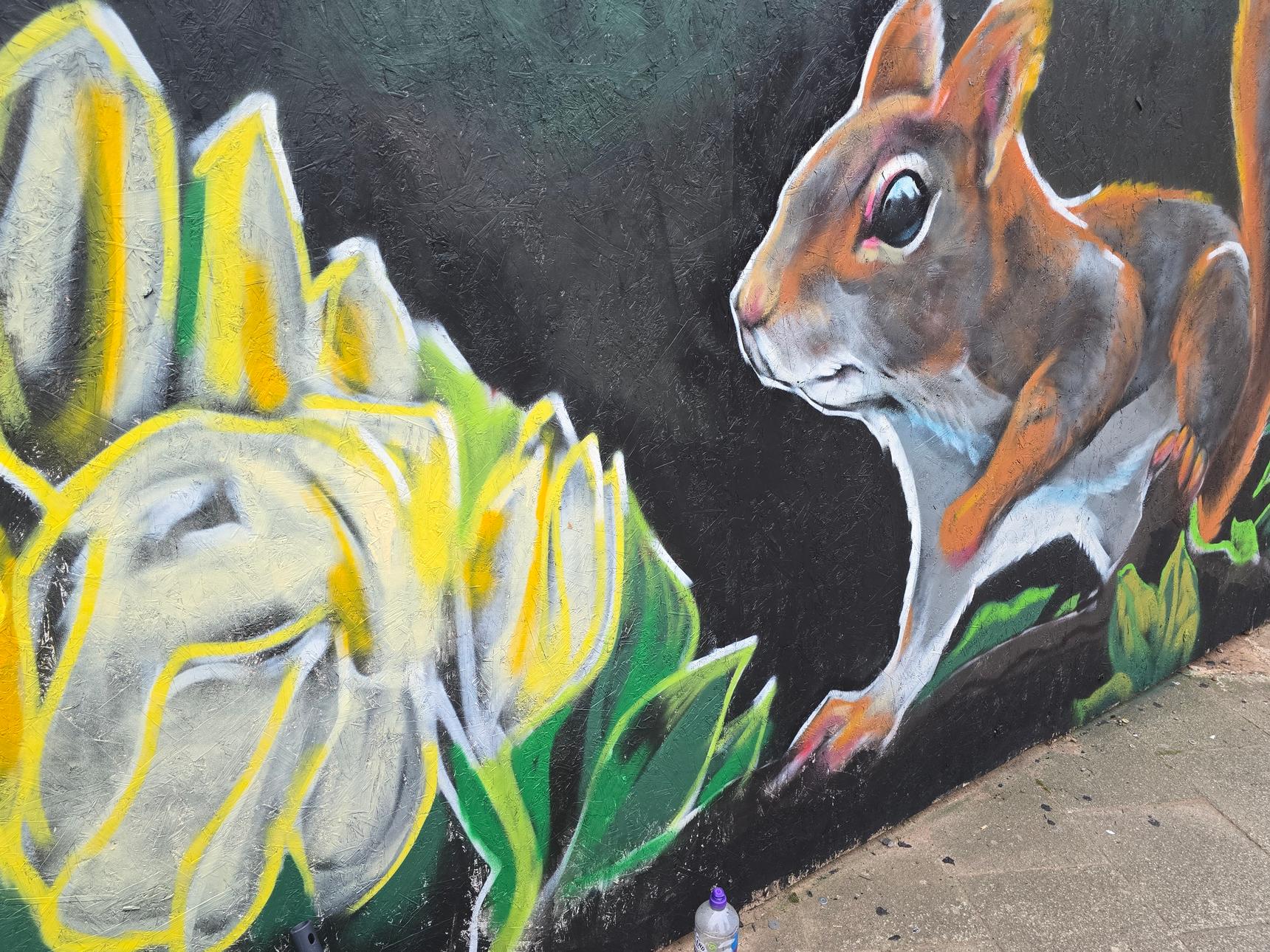 This mural, In a Nutshell, was painted across two afternoons one weekend in March, by local artist Mick Batchelor (better known as dynamickart).