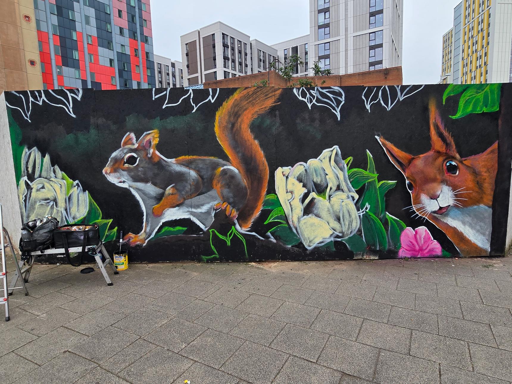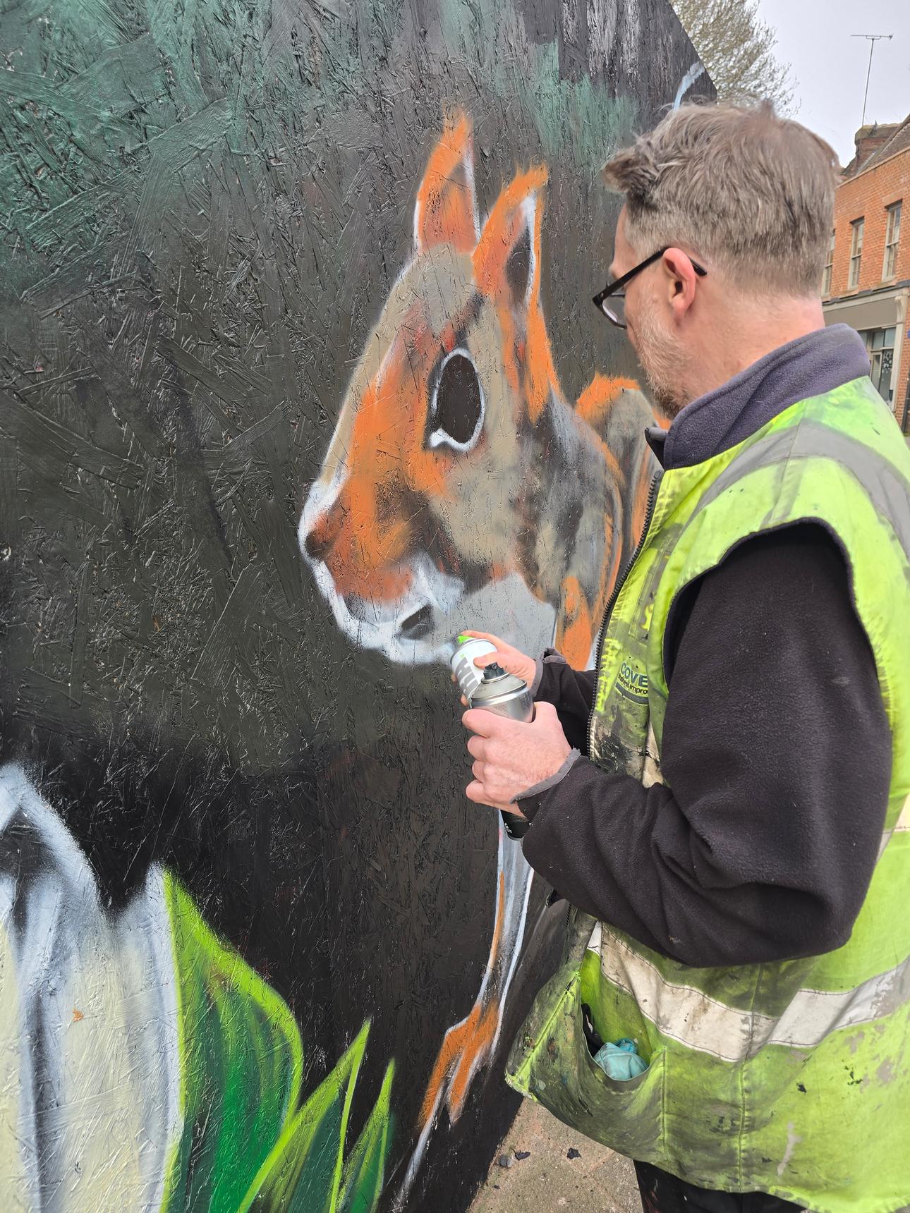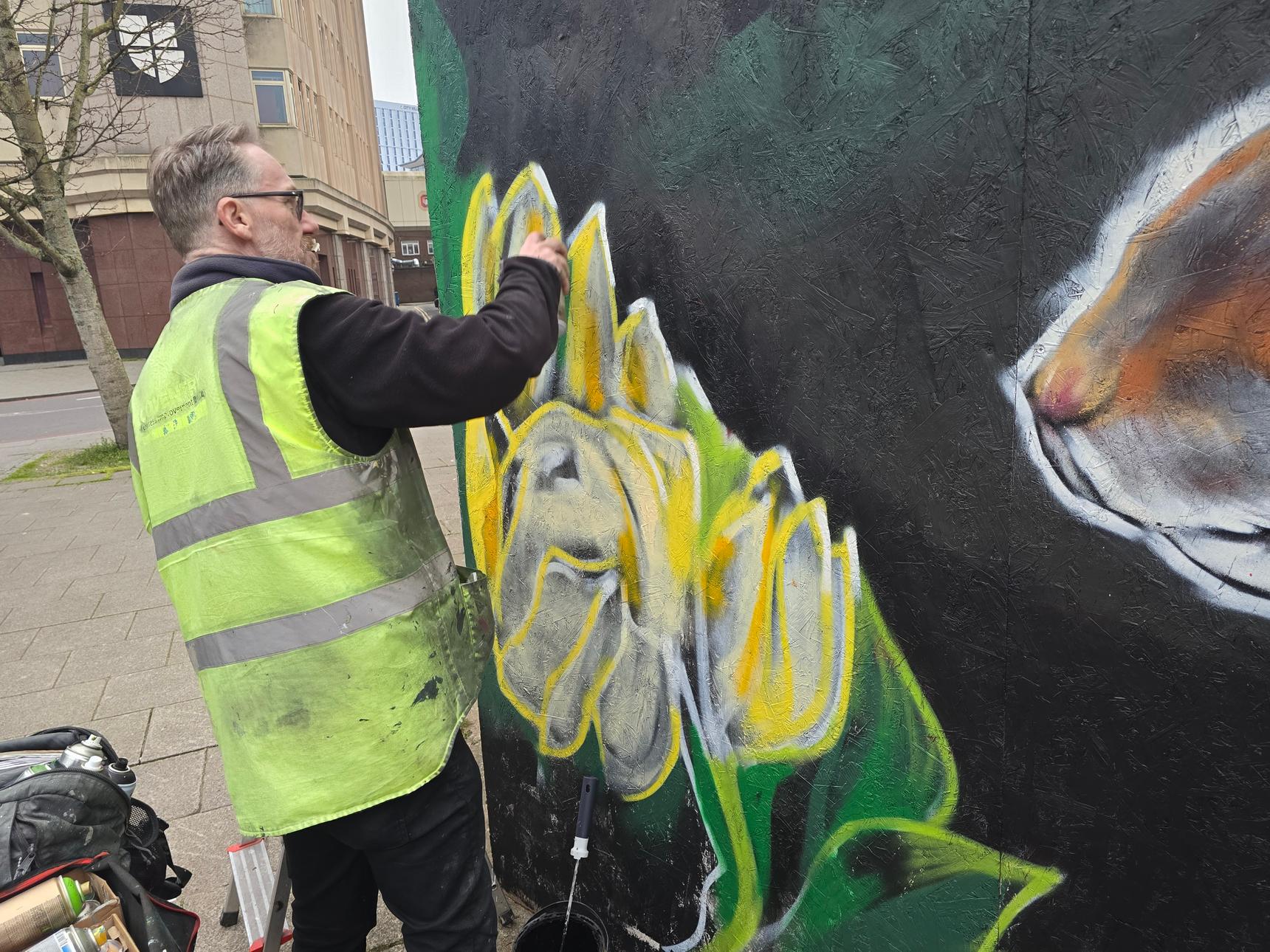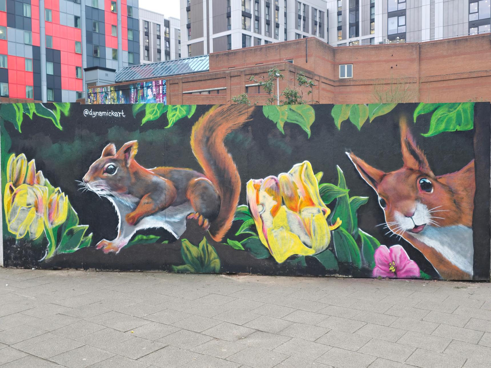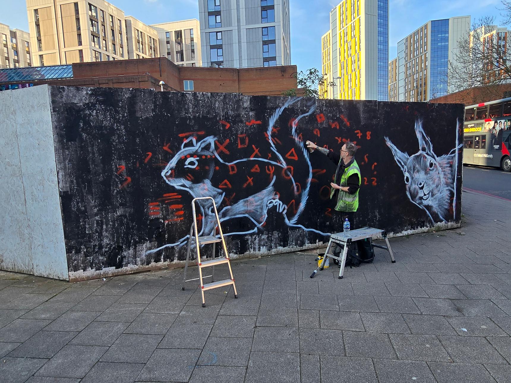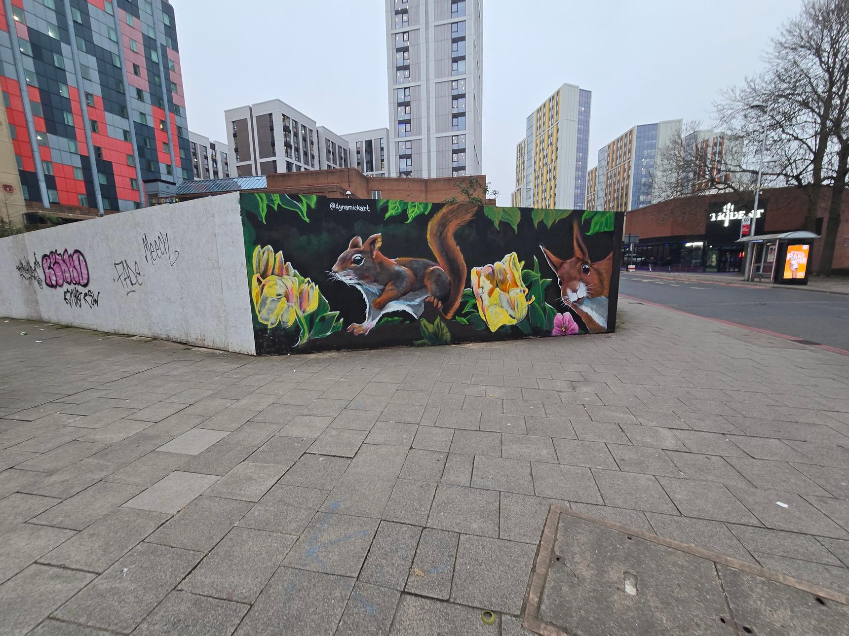 This mural, In a Nutshell, was painted across two afternoons one weekend in March, by local artist Mick Batchelor (better known as dynamickart).