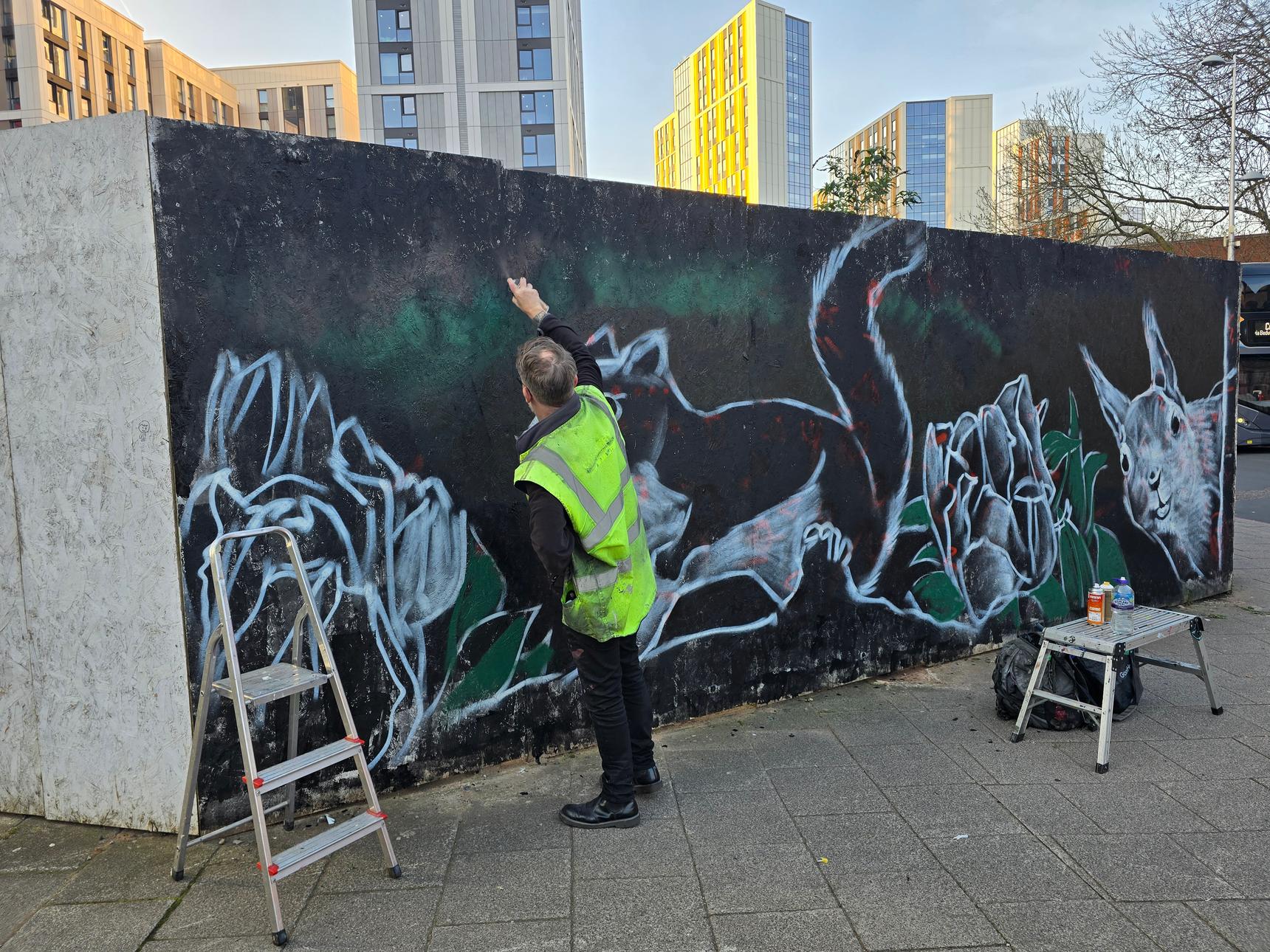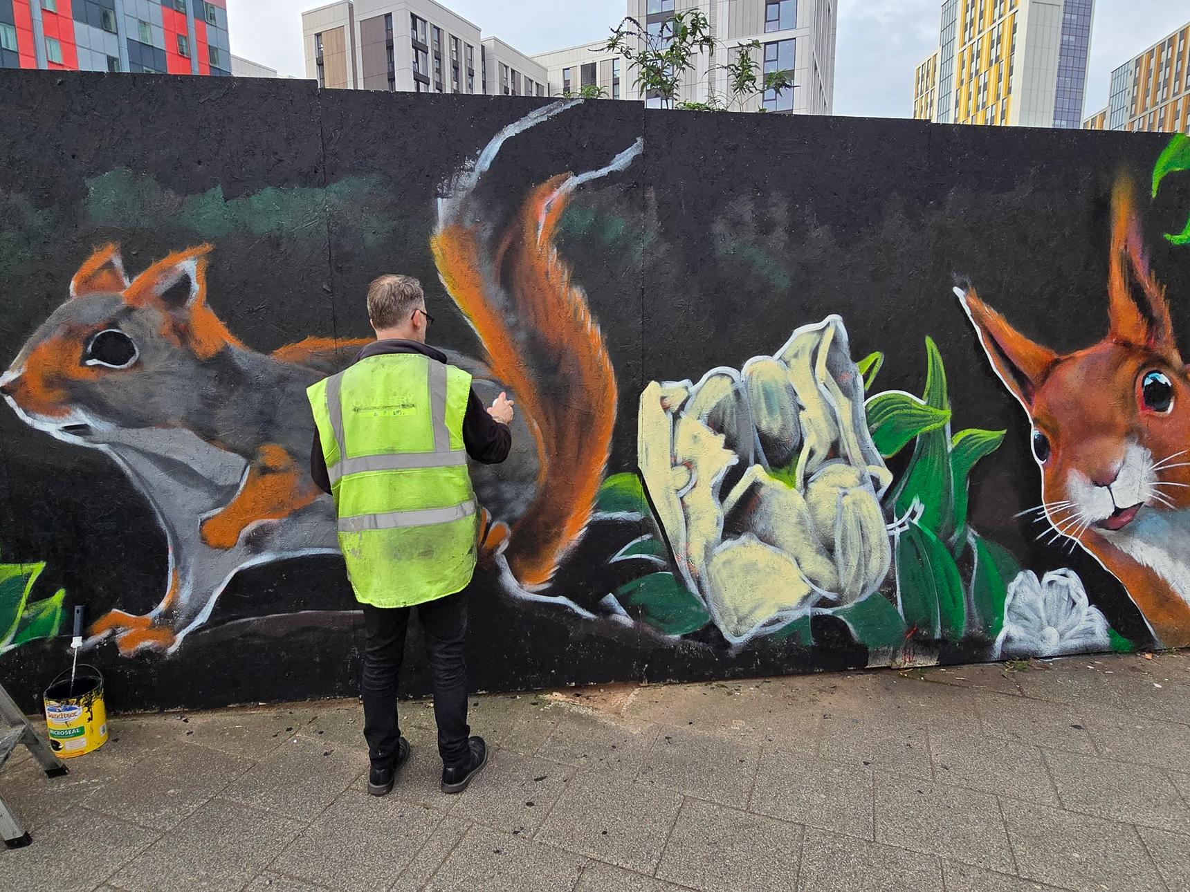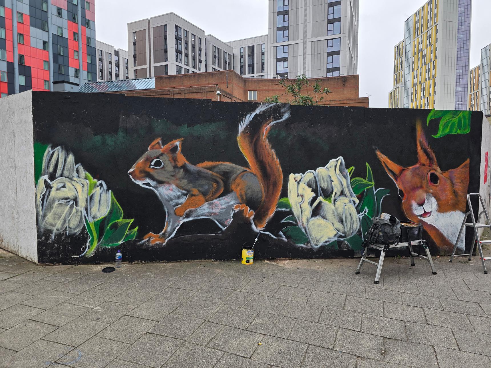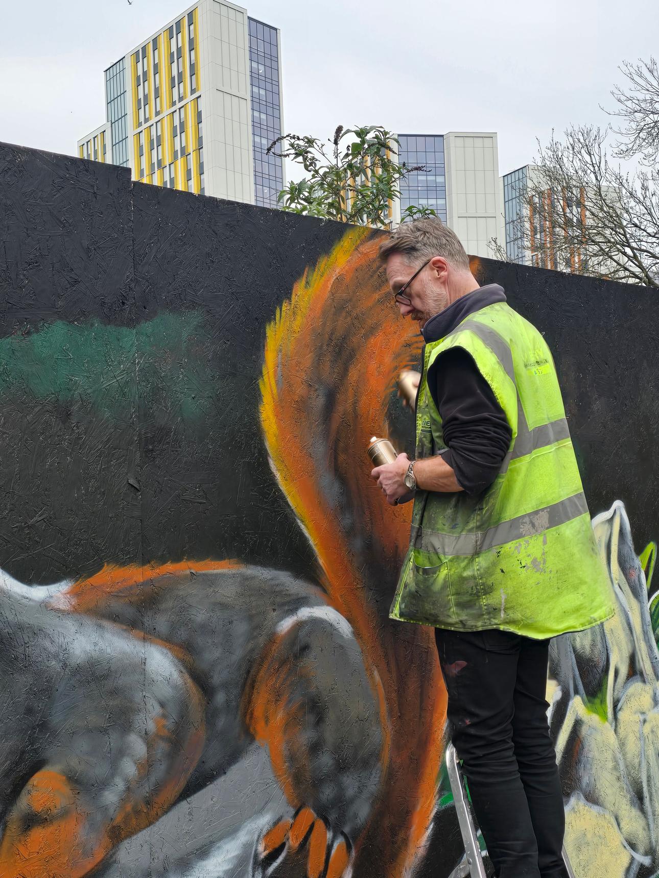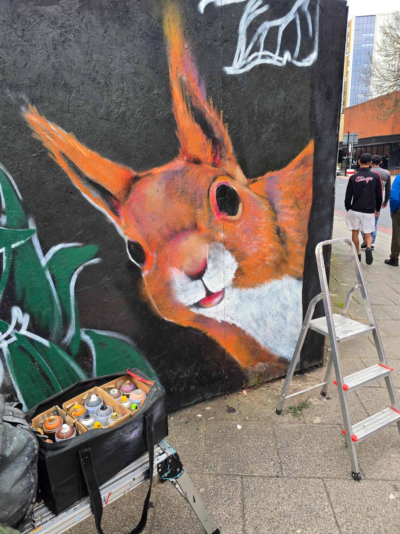 This mural, In a Nutshell, was painted across two afternoons one weekend in March, by local artist Mick Batchelor (better known as dynamickart).