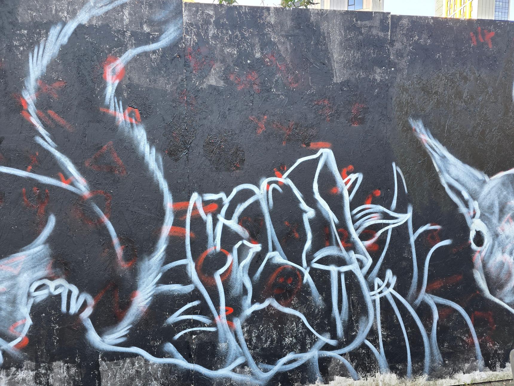 When he arrived, it was time to assess the state of the mural. Tag free, but the drying paint showed how much of the white OBS still needed properly painting. After Mick (finally) located his lucky screwdriver, I started a new battle of trying to prise the the lid off the paint pot (it really did not want to come off), and finally set about battling the OBS once more.
