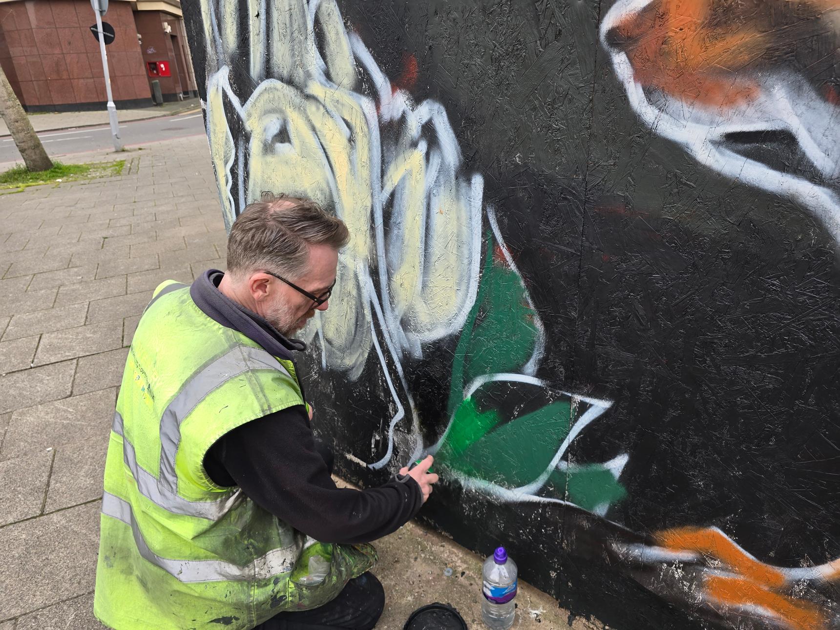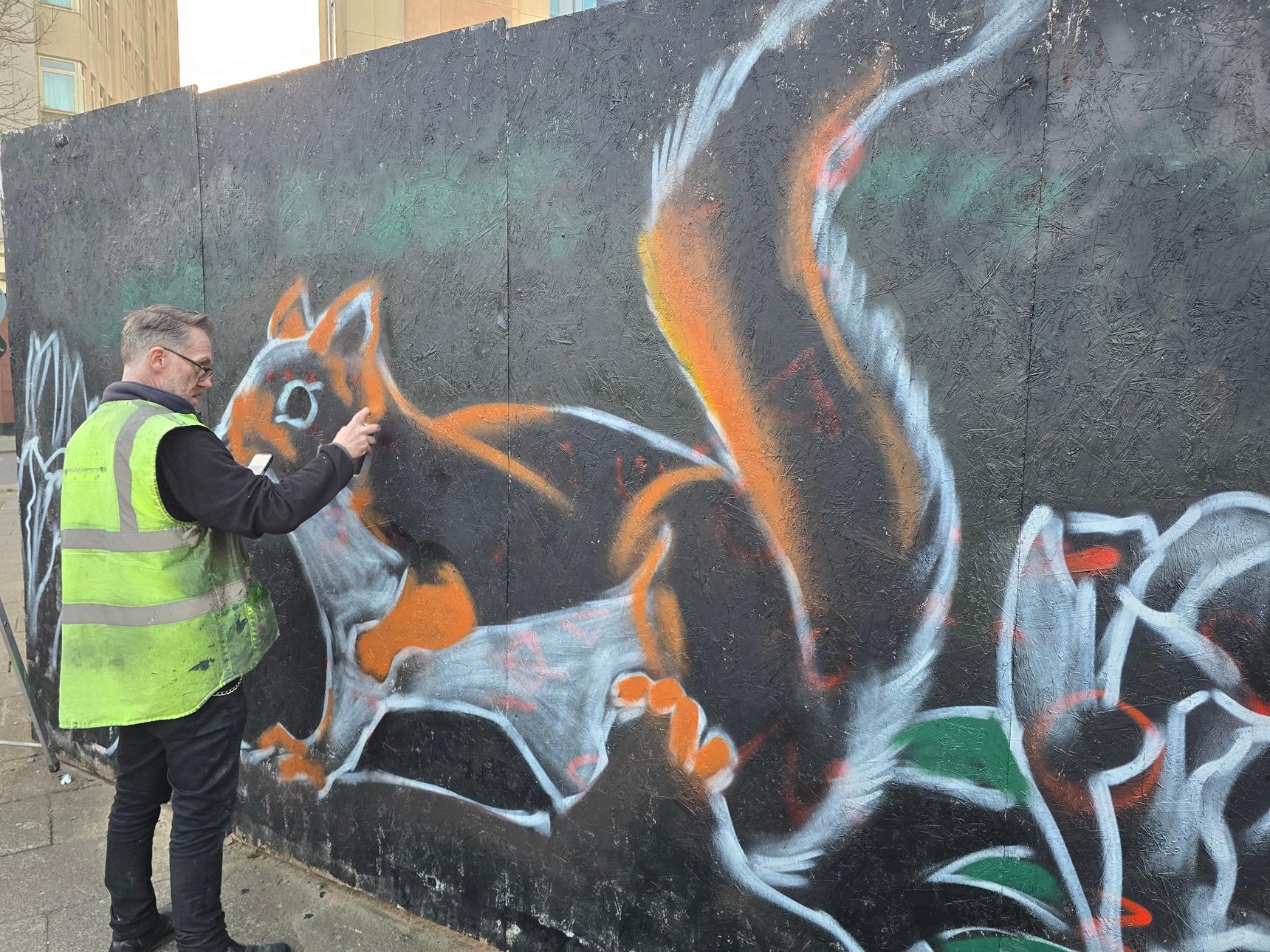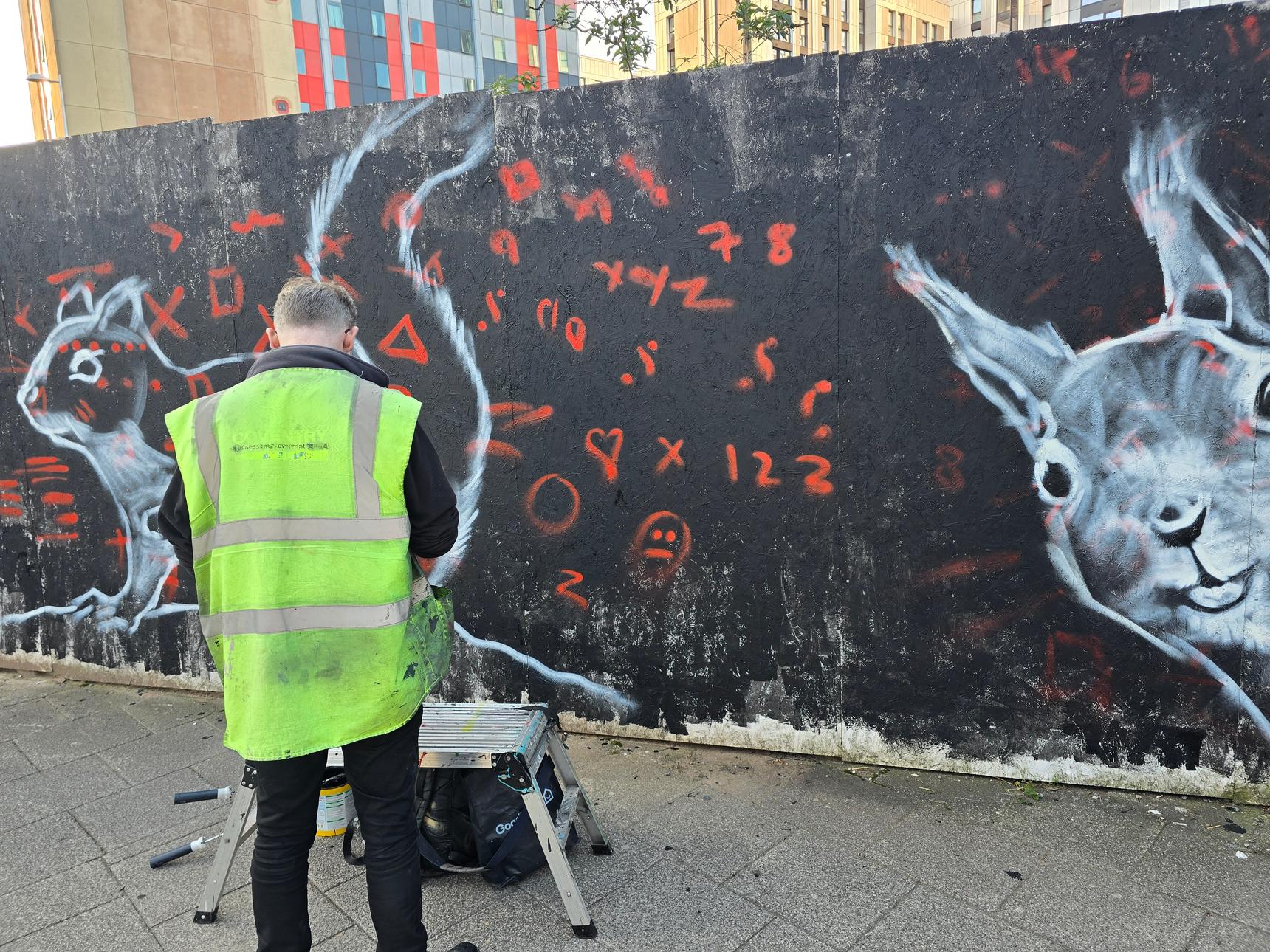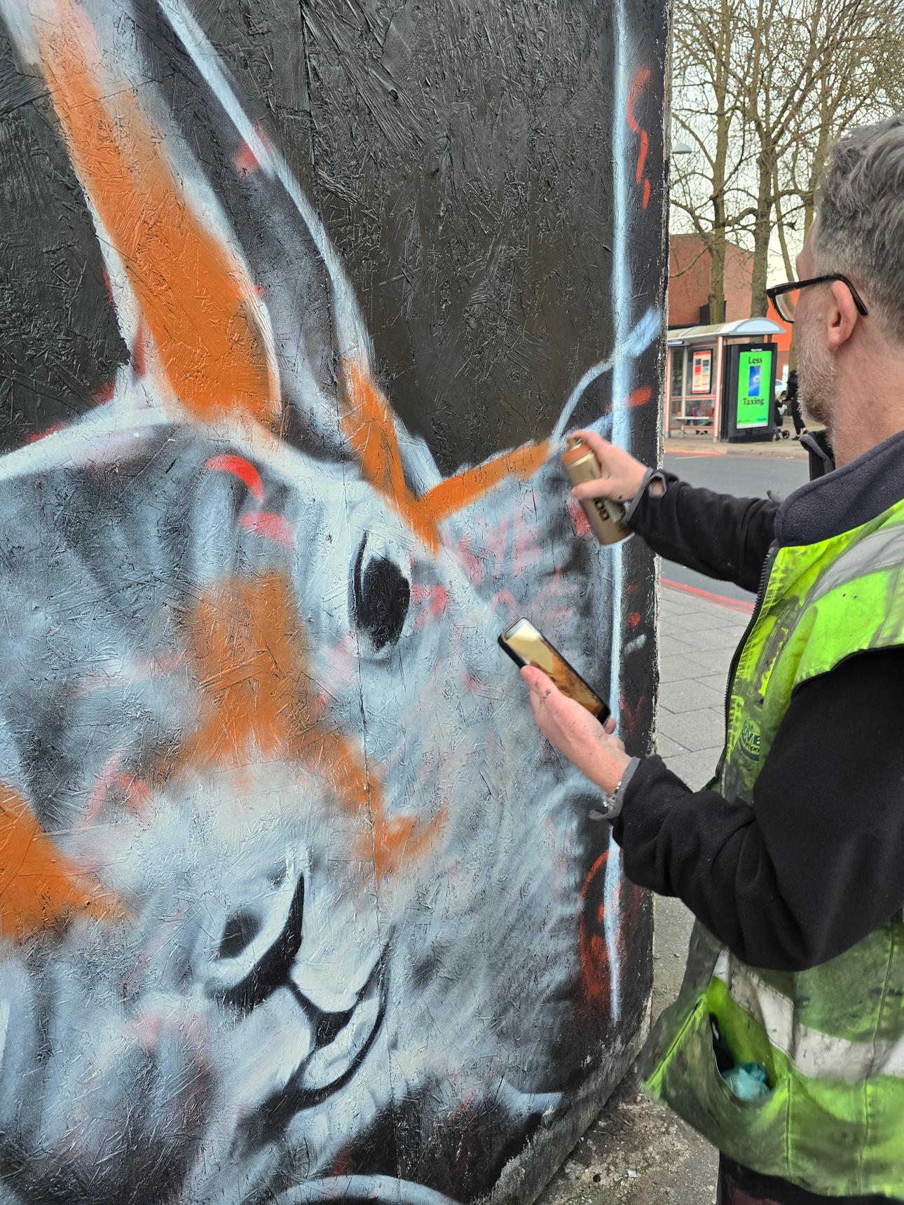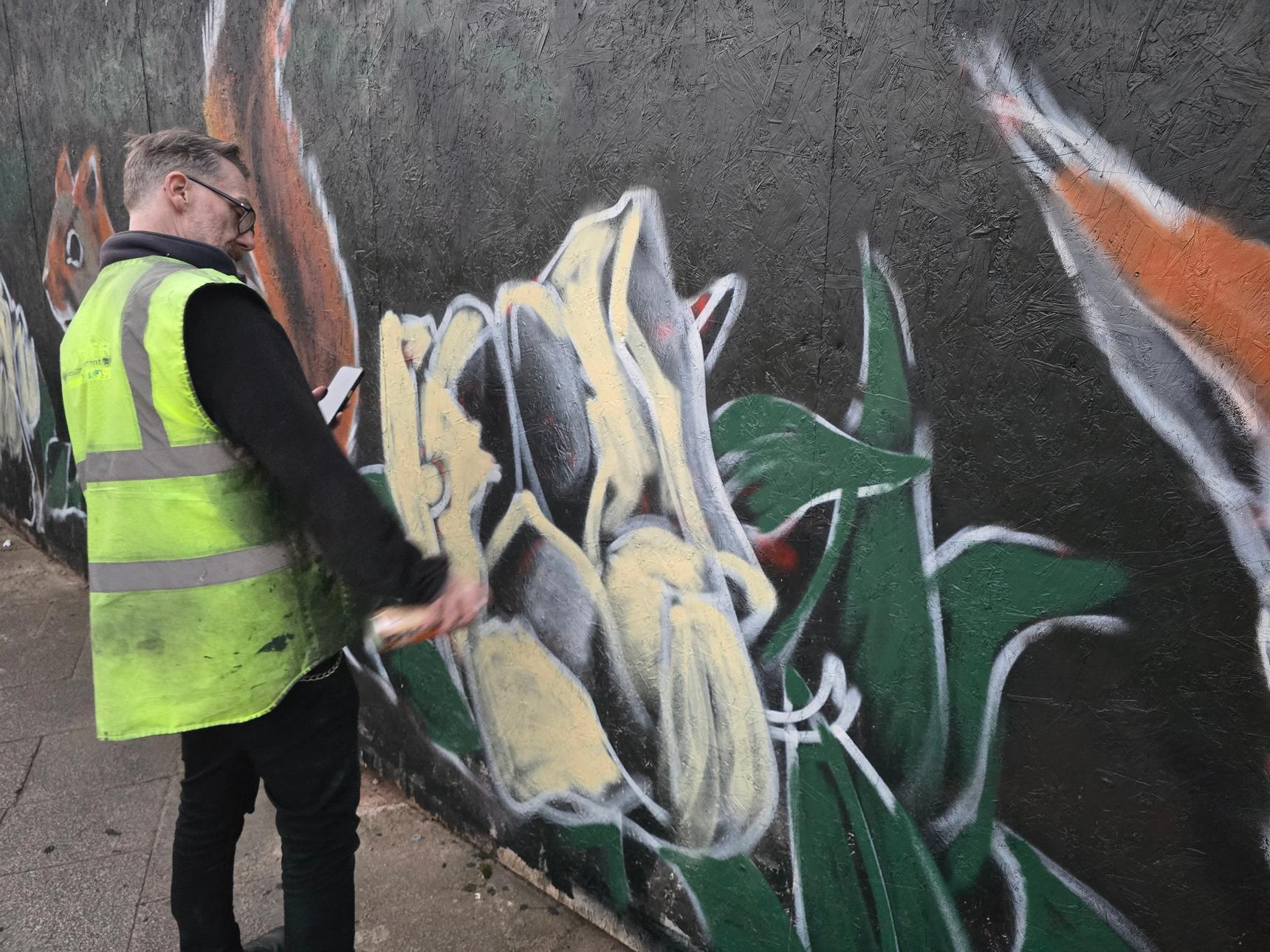 Fortunately, this doesn't happen very often, and it seems that the better the mural is, the more likely it will be left alone. But, as we would be leaving it unguarded in the city centre on a Saturday night with lots of drunk people about, it was REALLY important that Mick took the mural to a decent point.