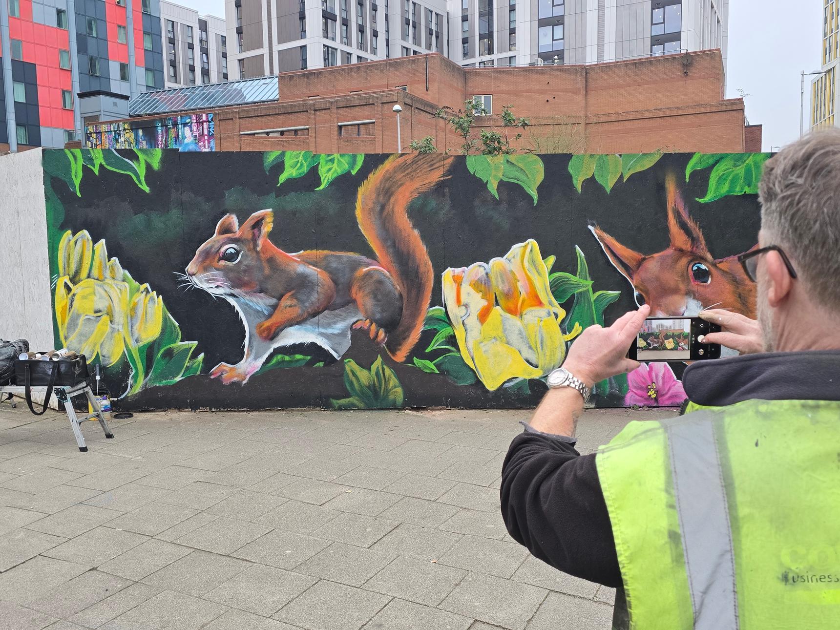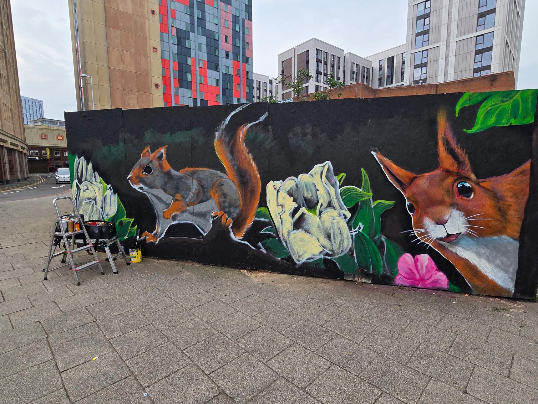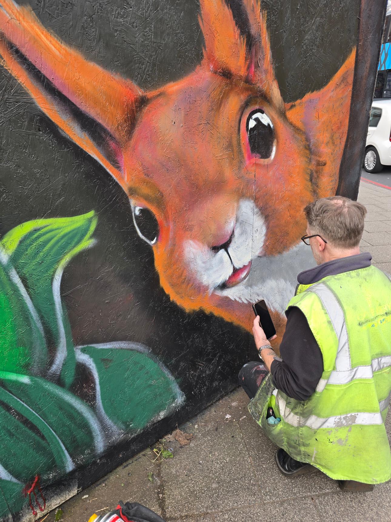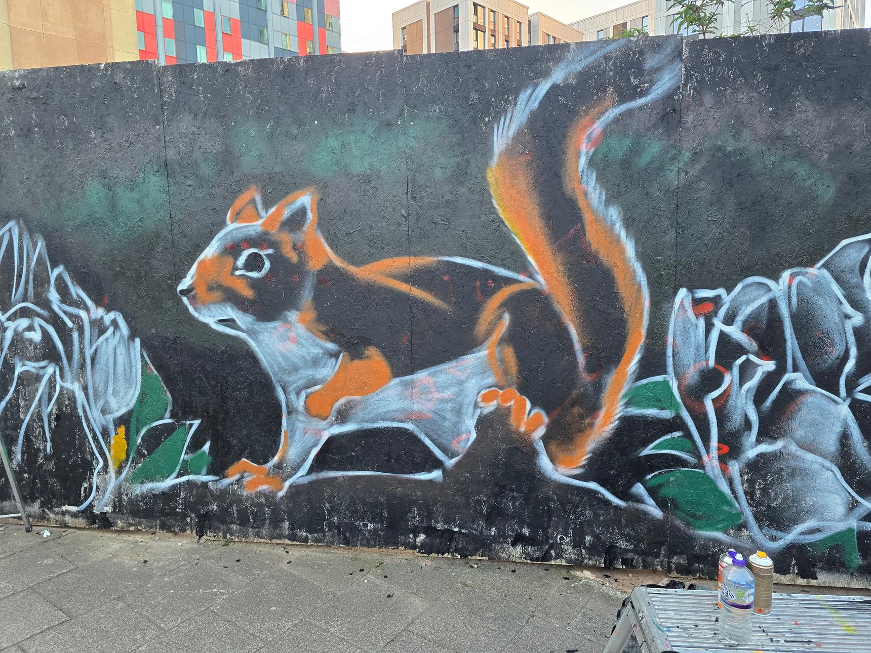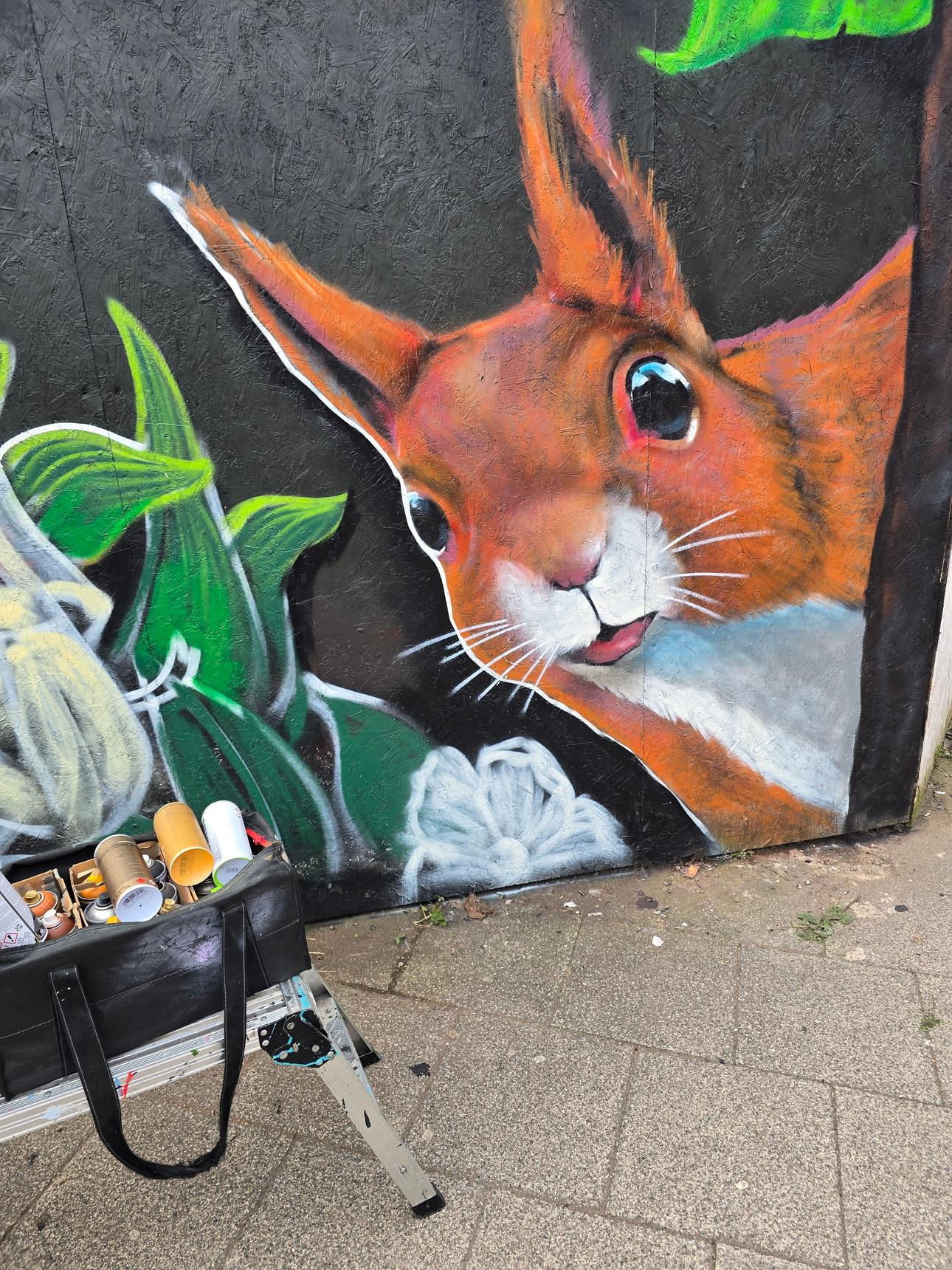 When I got back, I saw that not only that the second squirrel finished, but one of the flowers was also beautifully radiant. He was now doing a lot of back and forth between all the elements of the mural, adding a bit more colour and shading here and there.