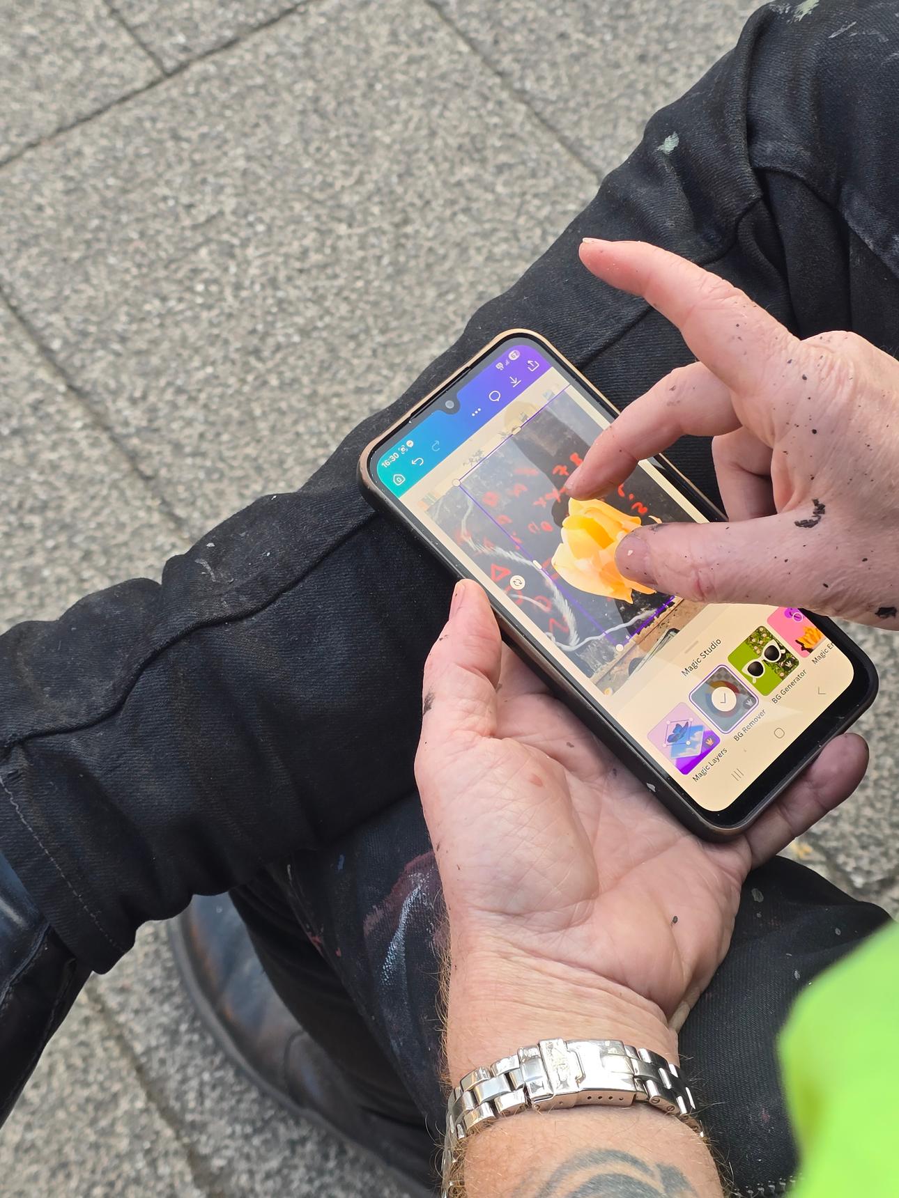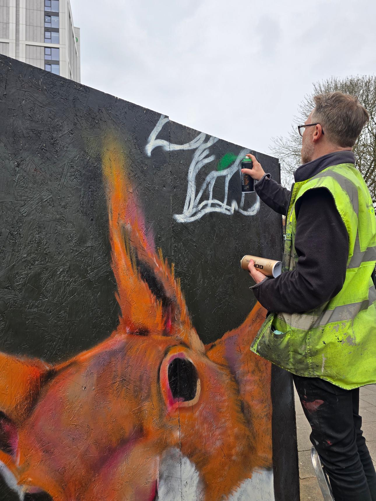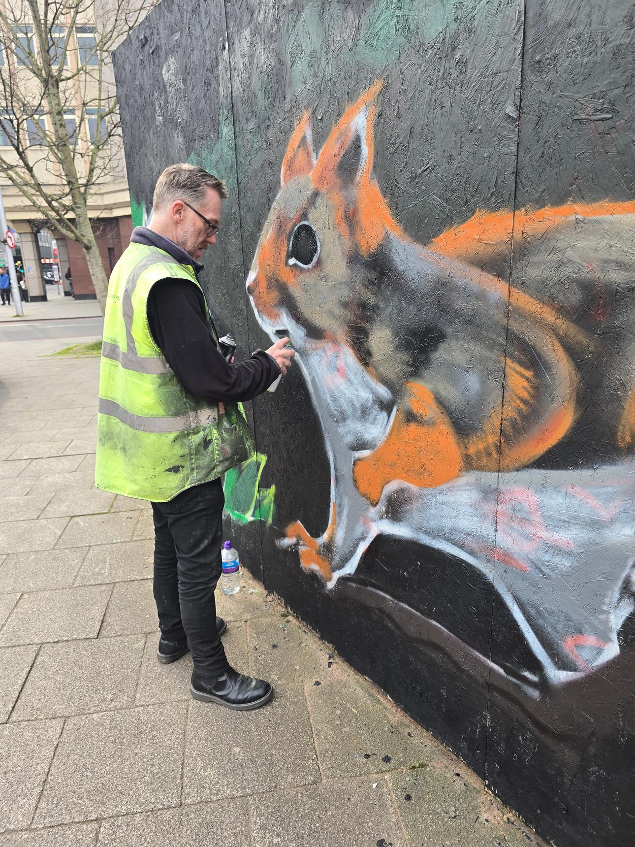 As the outlines gradually turned from squiggles to squirrels, and my arms more and more resembled a mutated measles outbreak, the interest from passers by also increased. I helped Mick by fielding the questions, and I used the SAC app to show the various interested parties some other examples of local art that Mick had a hand in.
