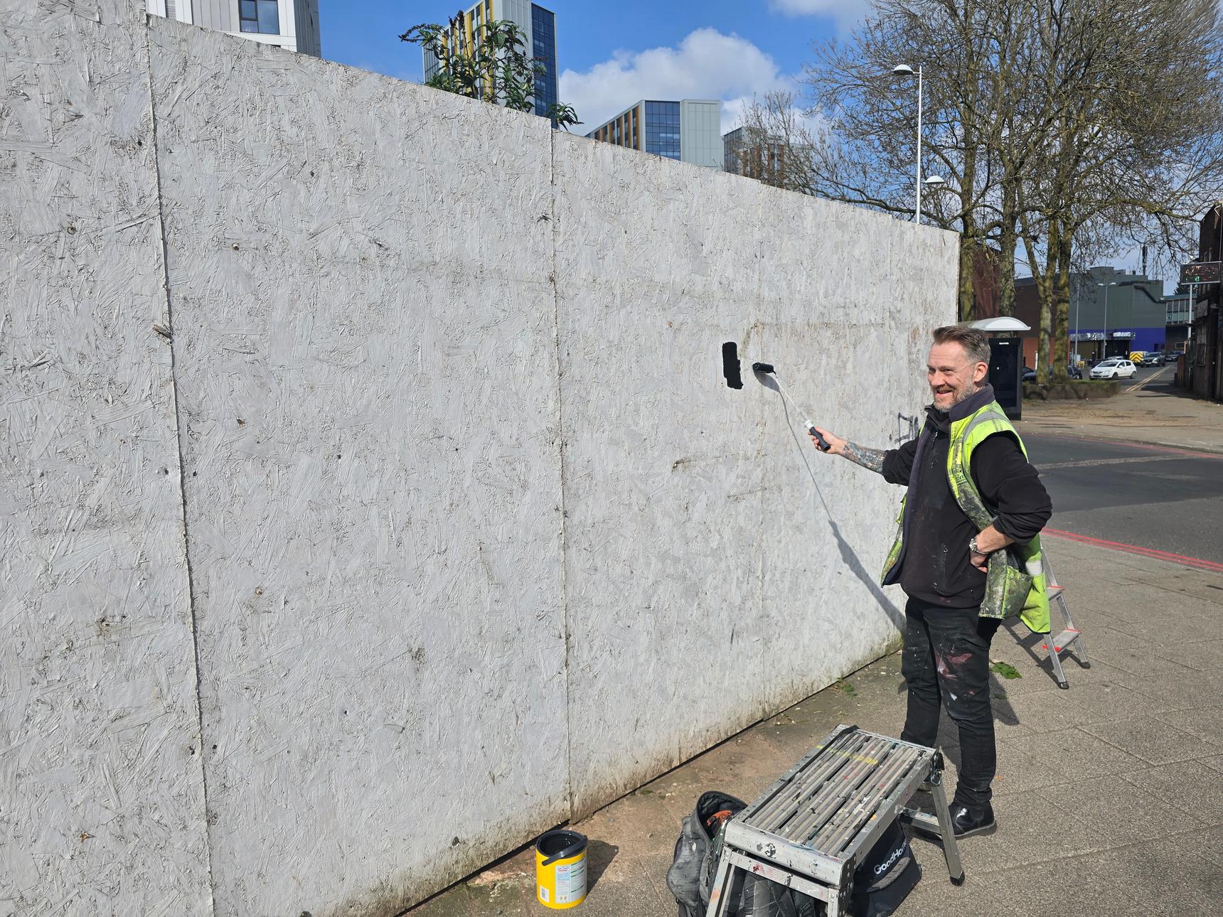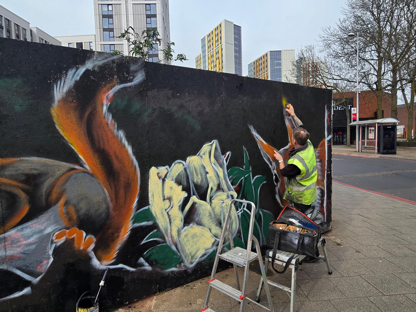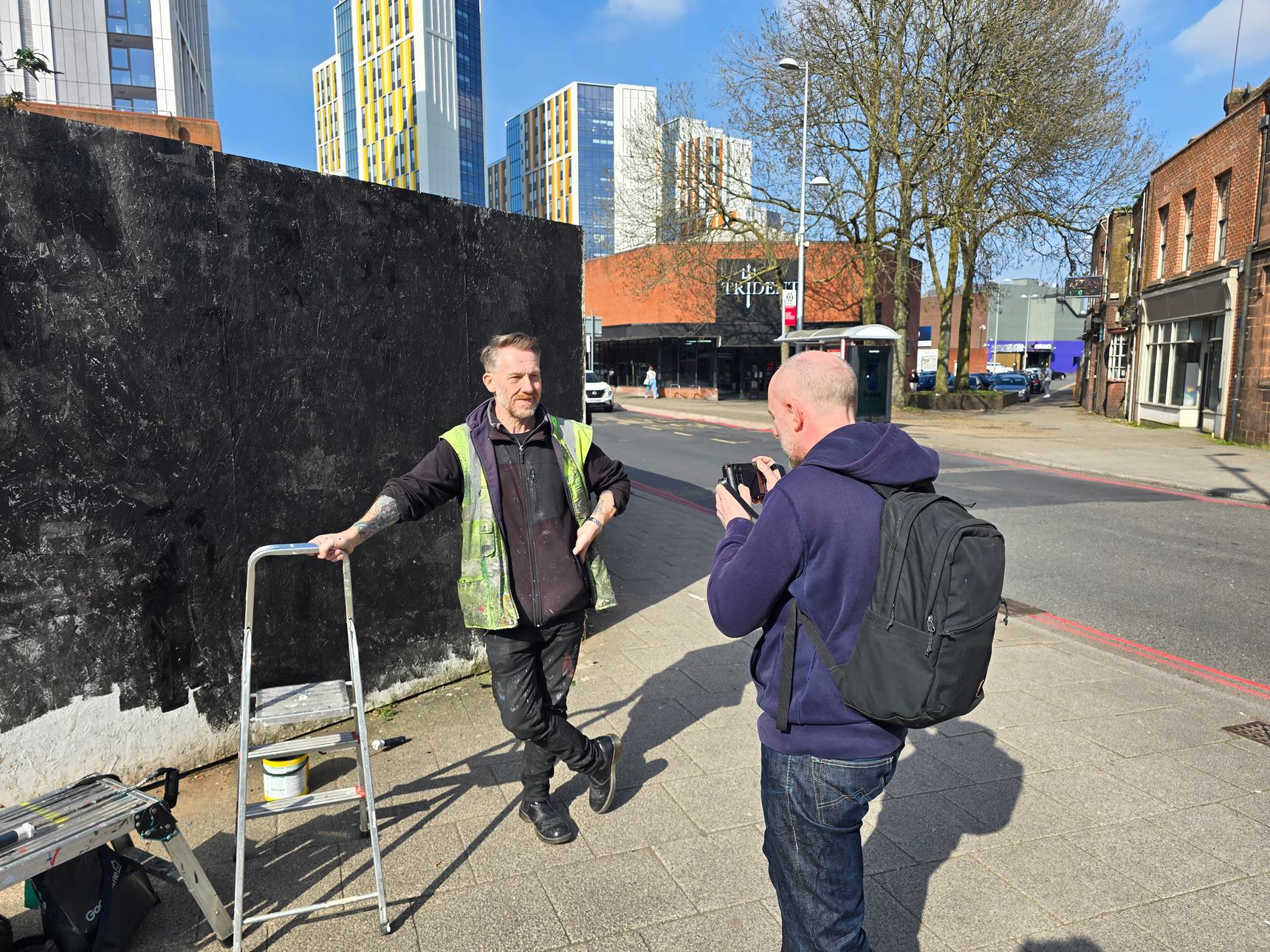 Coventry was City of Culture a few years back, and many murals started appearing in and around the city. Mick and his team were behind the vast majority of these murals. Even if it wasn't one he painted, he was often the one organising the scissor lifts, or preparing the walls prior to the paint, such as the Dan Kitchener piece just behind this mural. The land that these boards are surrounding has always been ear-marked for development; Mick positioned Dan's mural so that it will still be visible after the building is completed.